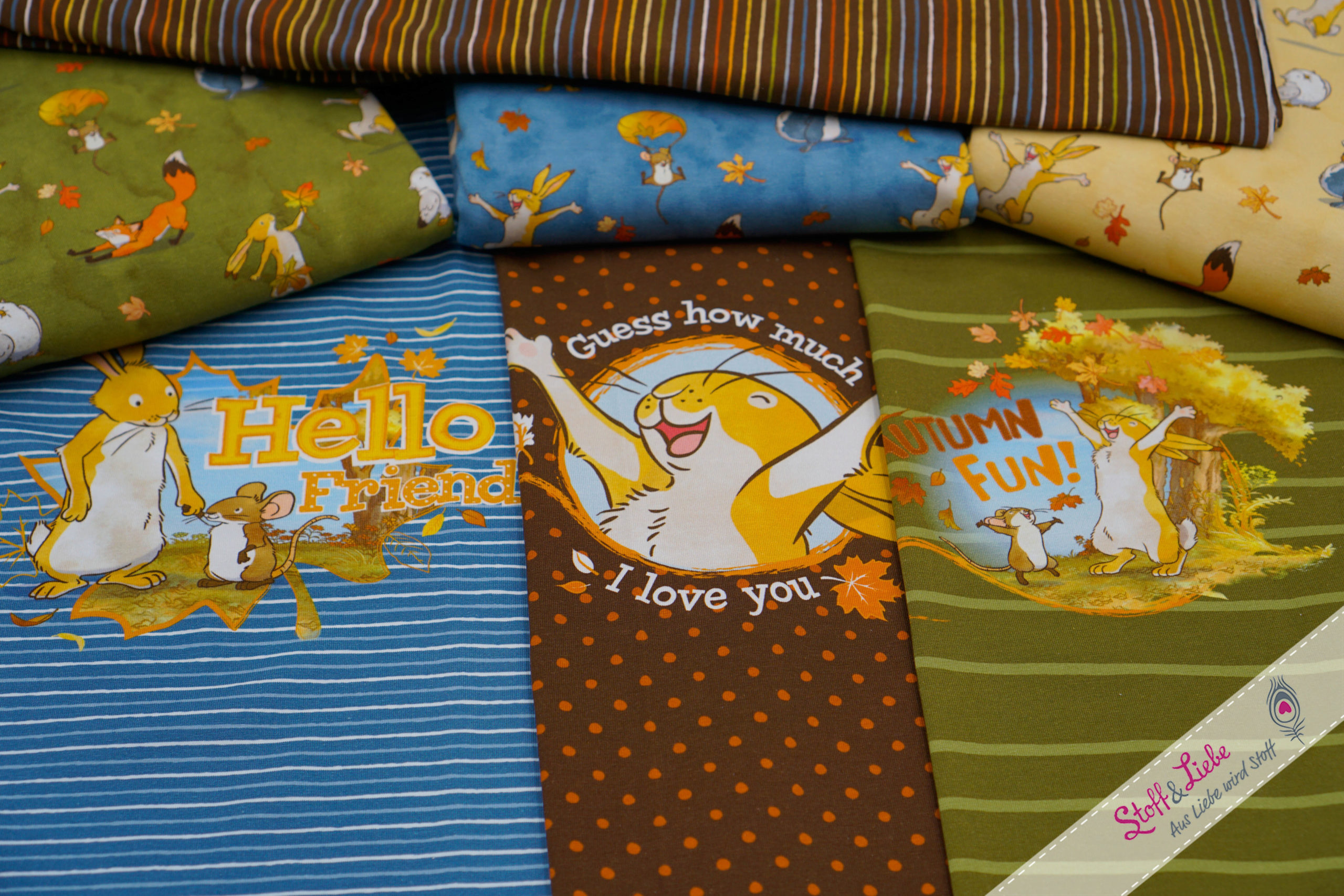 Fall Friends, den Haupstoff, gibt es es in drei Farbstellungen: Autumn Sky, Leaf Green und Biscuit. Ein Stoff im Allover Design mit zauberhaften Details, der einlädt zum entdecken und Geschichten erzählen. Der Hintergrund ist jeweils im Aquarellstil gehalten und verleiht den Stoffen so ihre ganz persönliche Note.