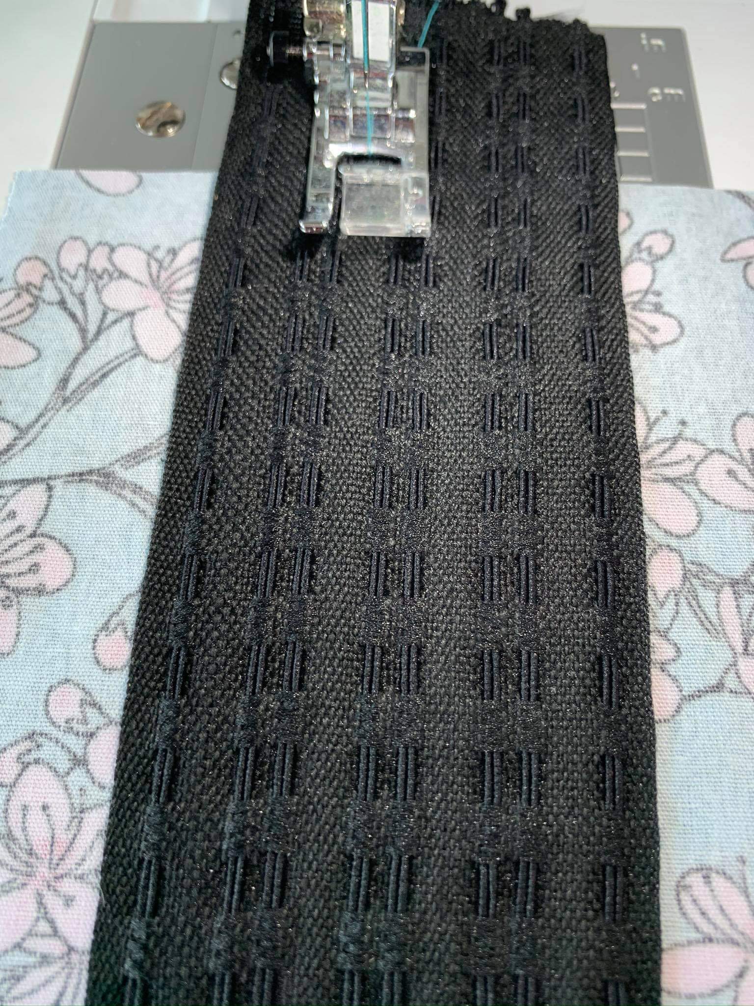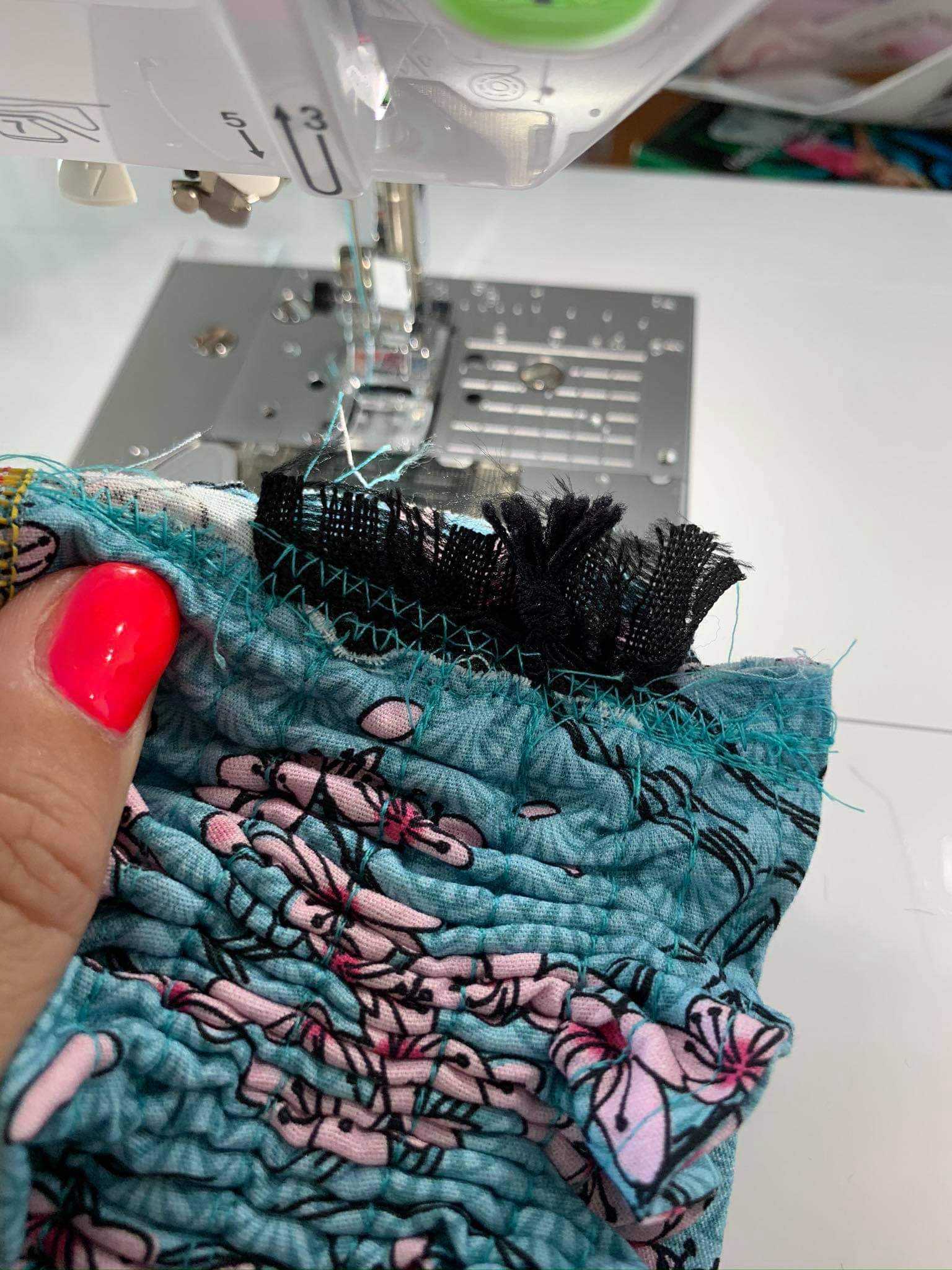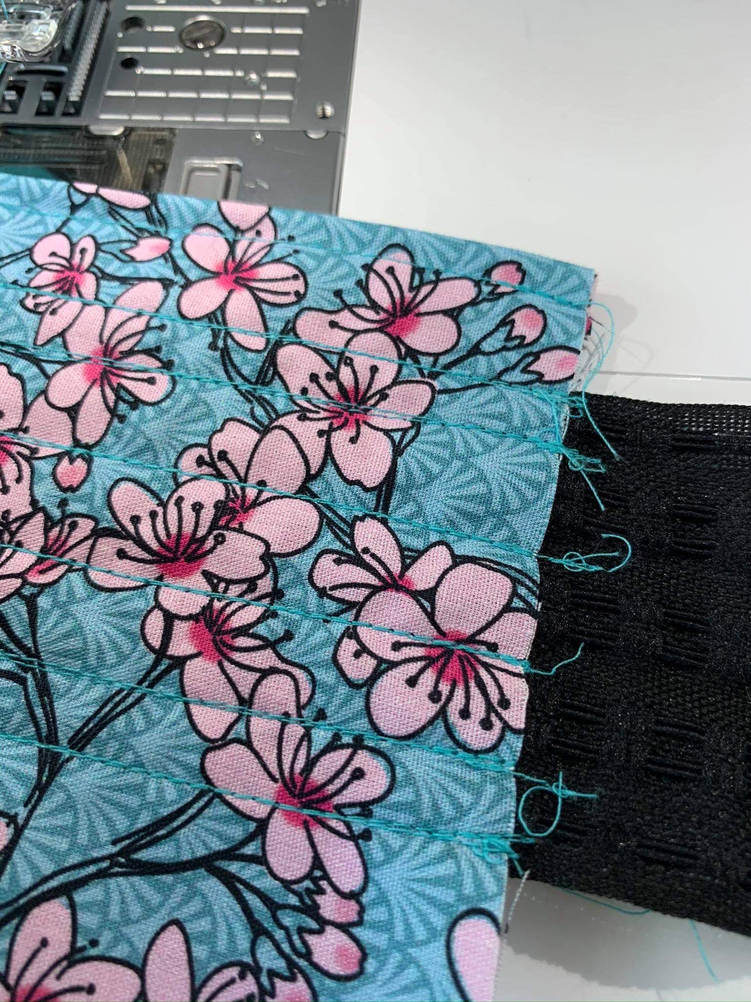 Jetzt habe ich ein Stück Smoke Gummi dran genäht. Einfach zwischen den Ziehgummis festgenäht.