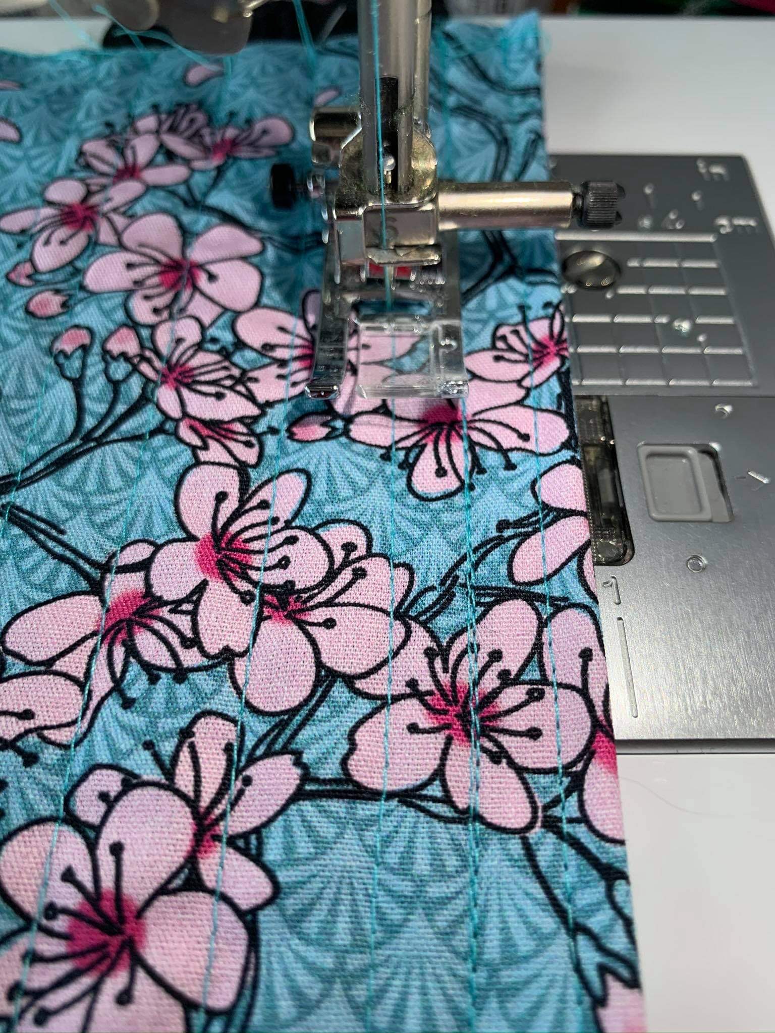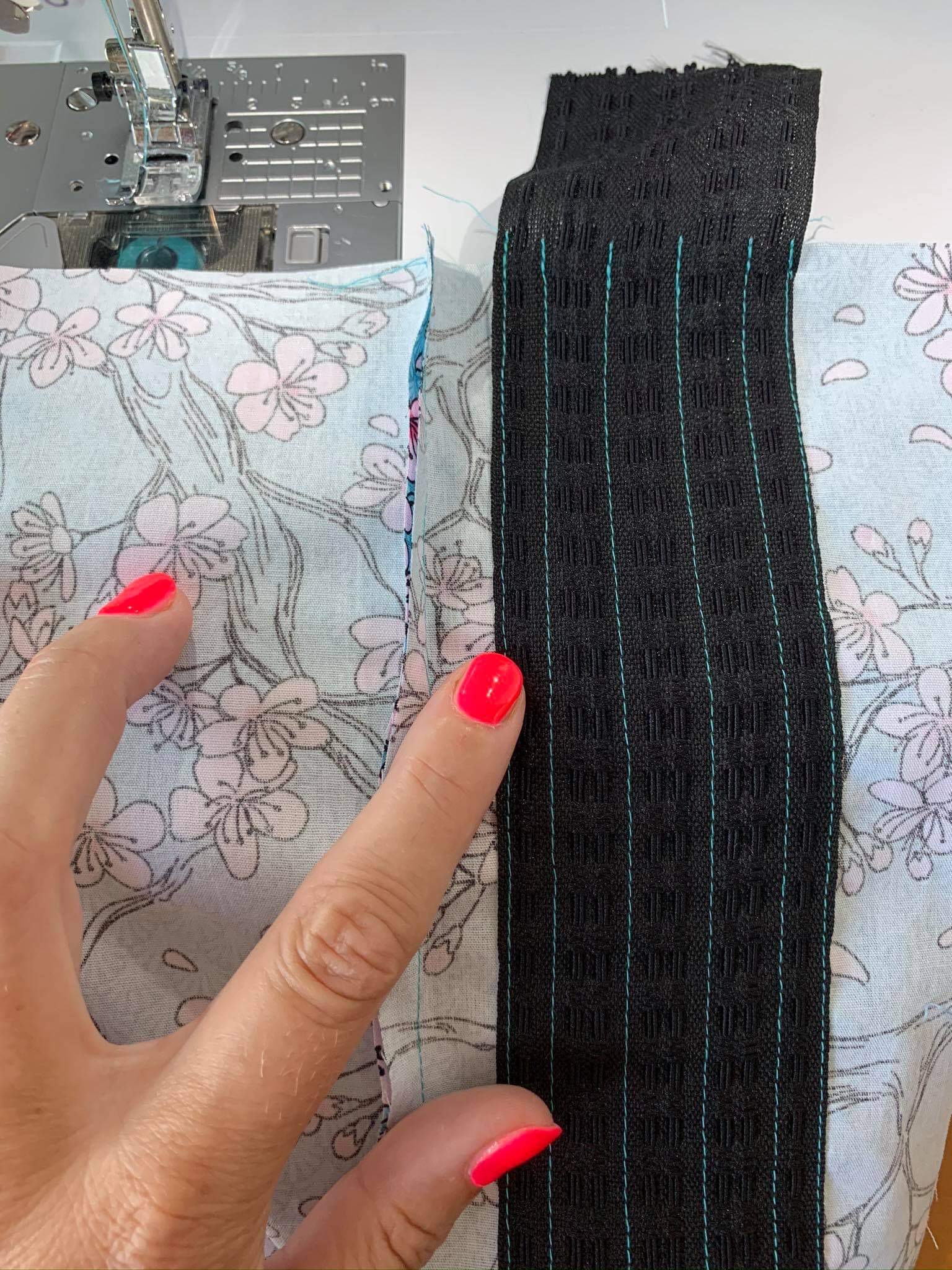 Jetzt habe ich einfach nochmal genau die gleichen Nähte nachgenäht um so den zweiten Streifen zu befestigen und nicht aus Versehen über die Raffgummis zu nähen.