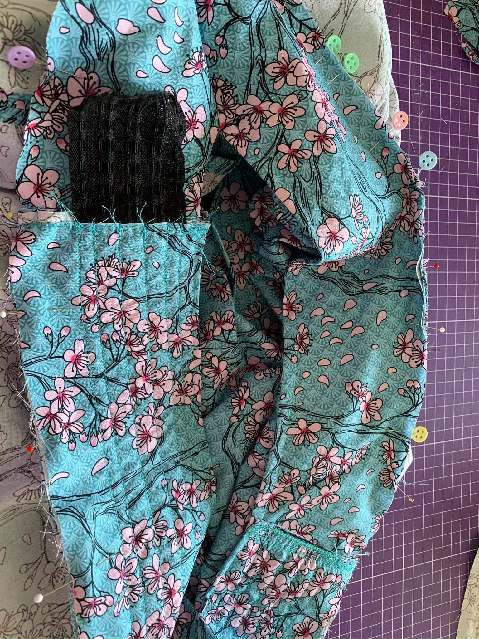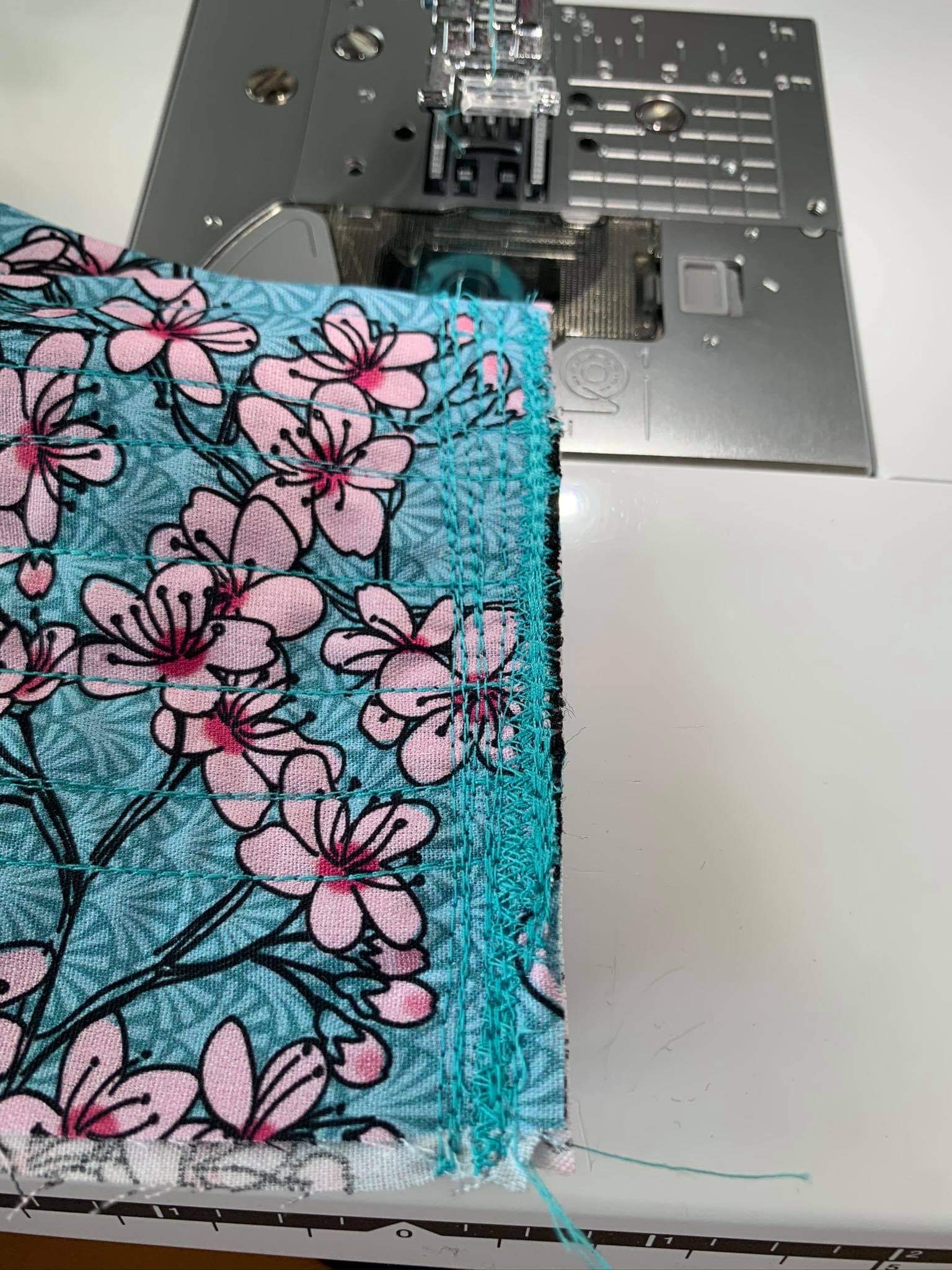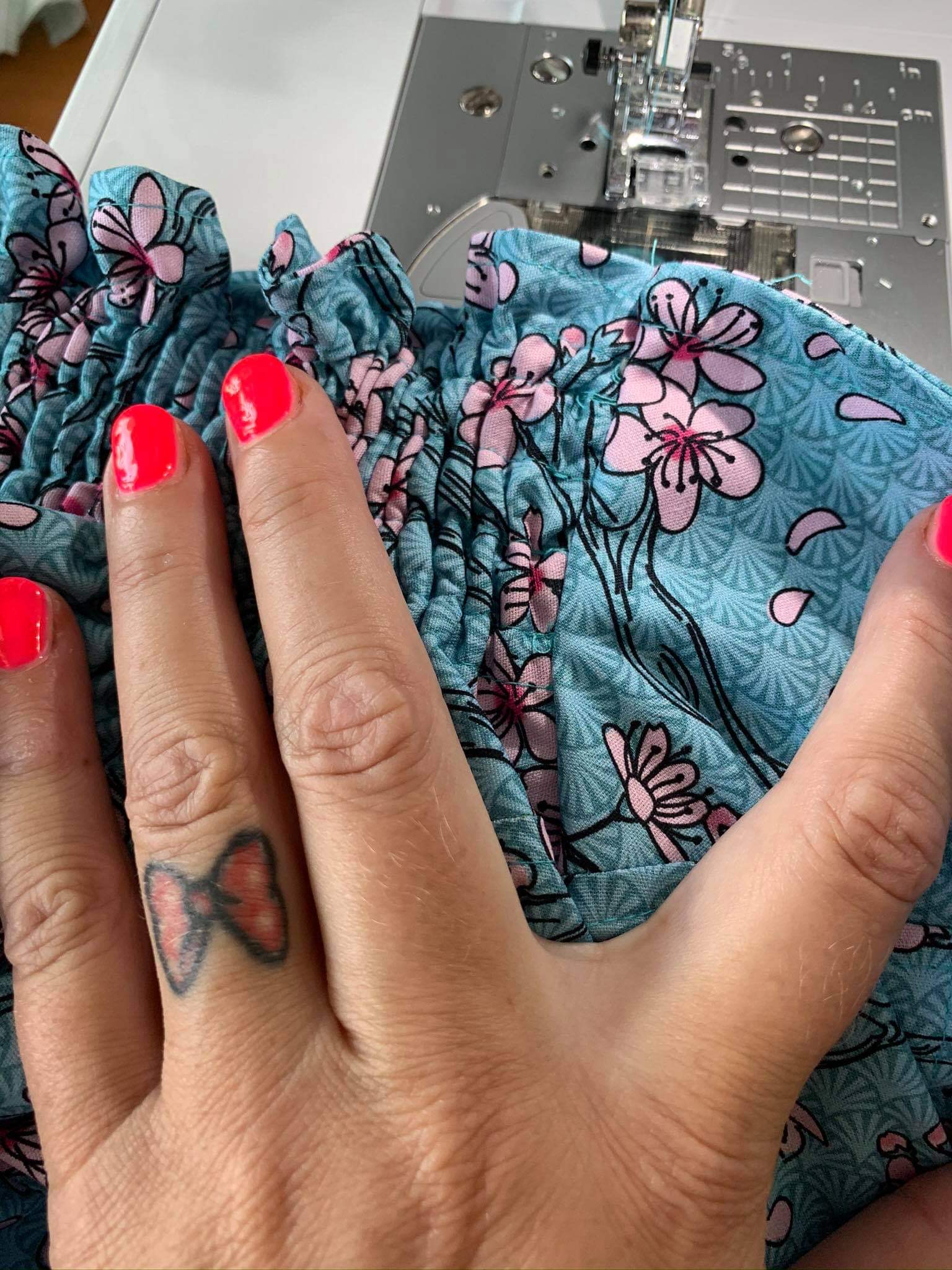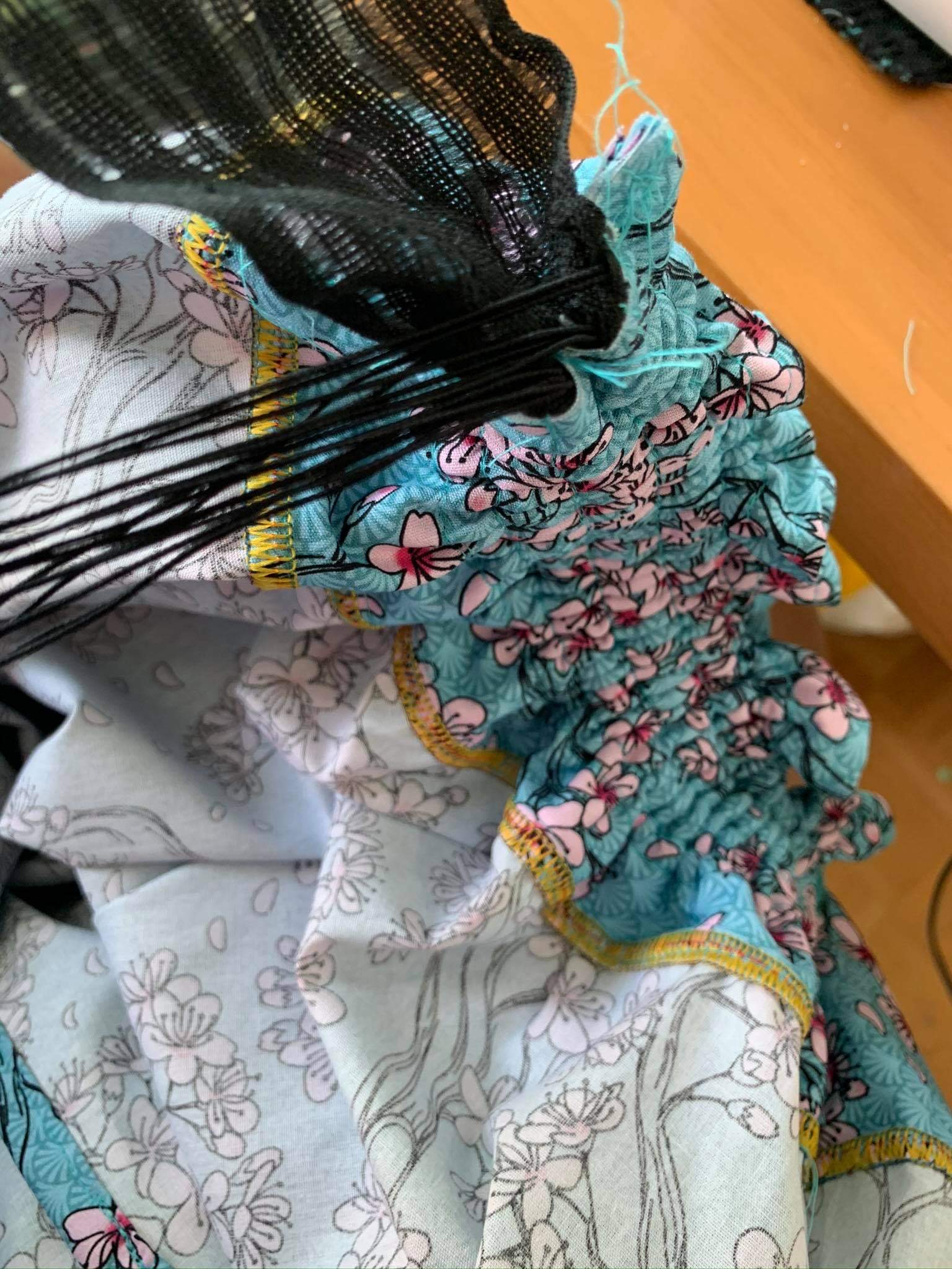 Jetzt habe ich die Gummis gezogen und verknotet am Ende und dann nochmal ordentlich drüber genäht das alles fest ist.