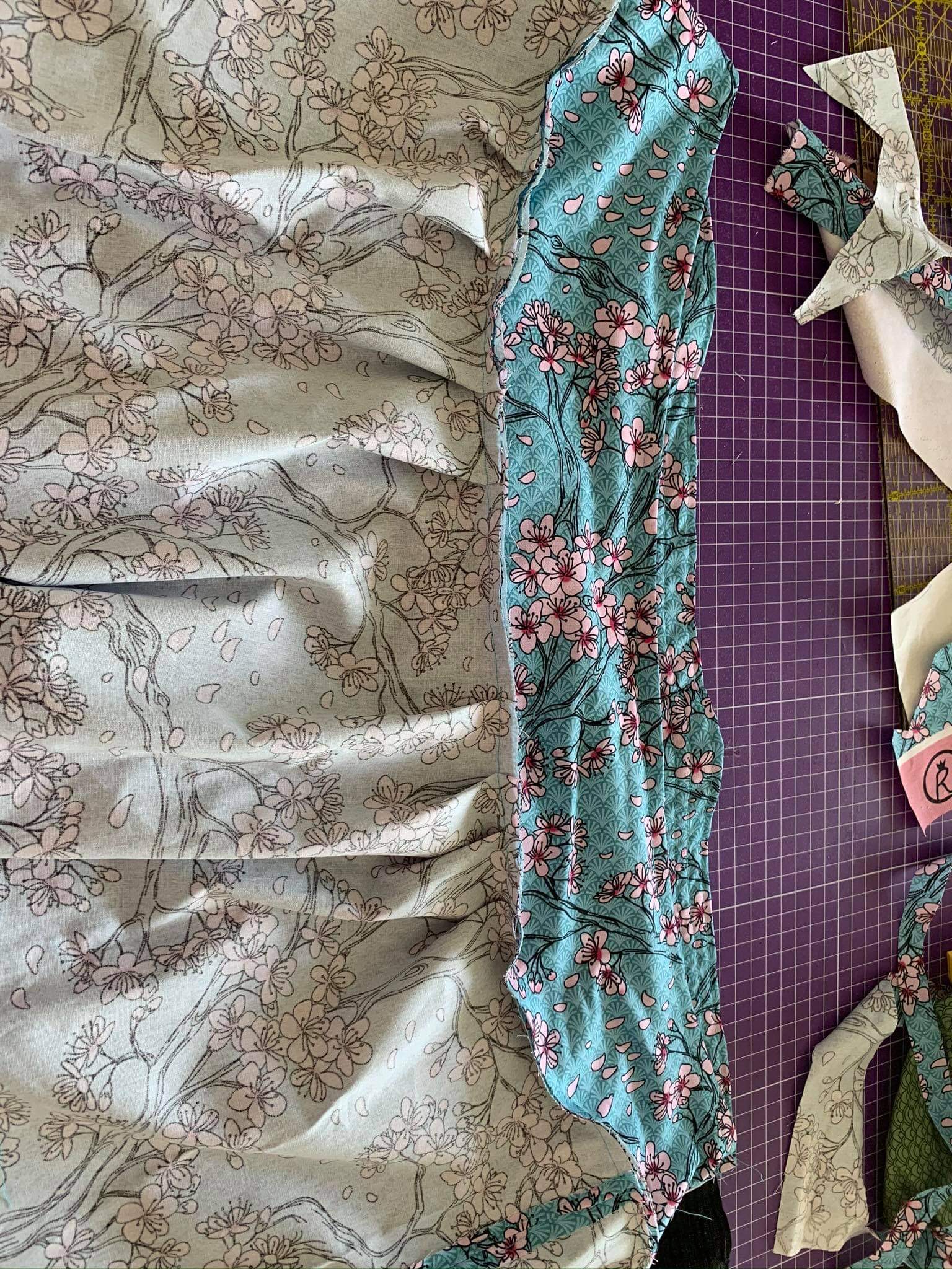 Mein gekaufter Rock hatte einen gerafften Teil hinten. Kein Problem, denke ich, kann ja nicht so schwer sein. Also habe ich grob nachgemessen und zwei Streifen à 50 x 11 cm geschnitten. Hätte wohl auch 50 x 22 cm einfach nehmen können. Aber warum einfach, wenn es auch schwer geht.