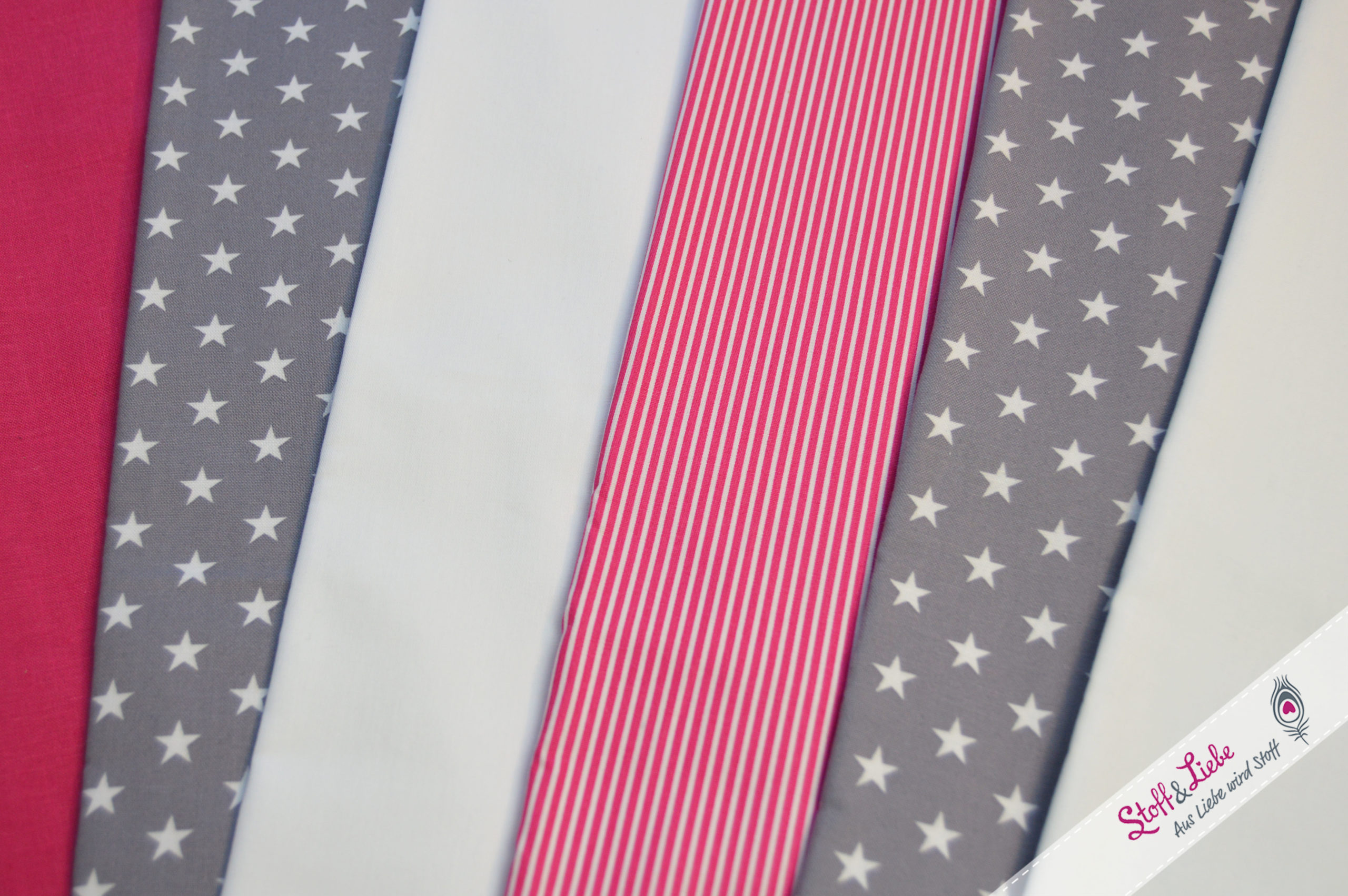 Sternchen auf Grau, Weiß, Magenta und Streifen Weiß/Magenta.