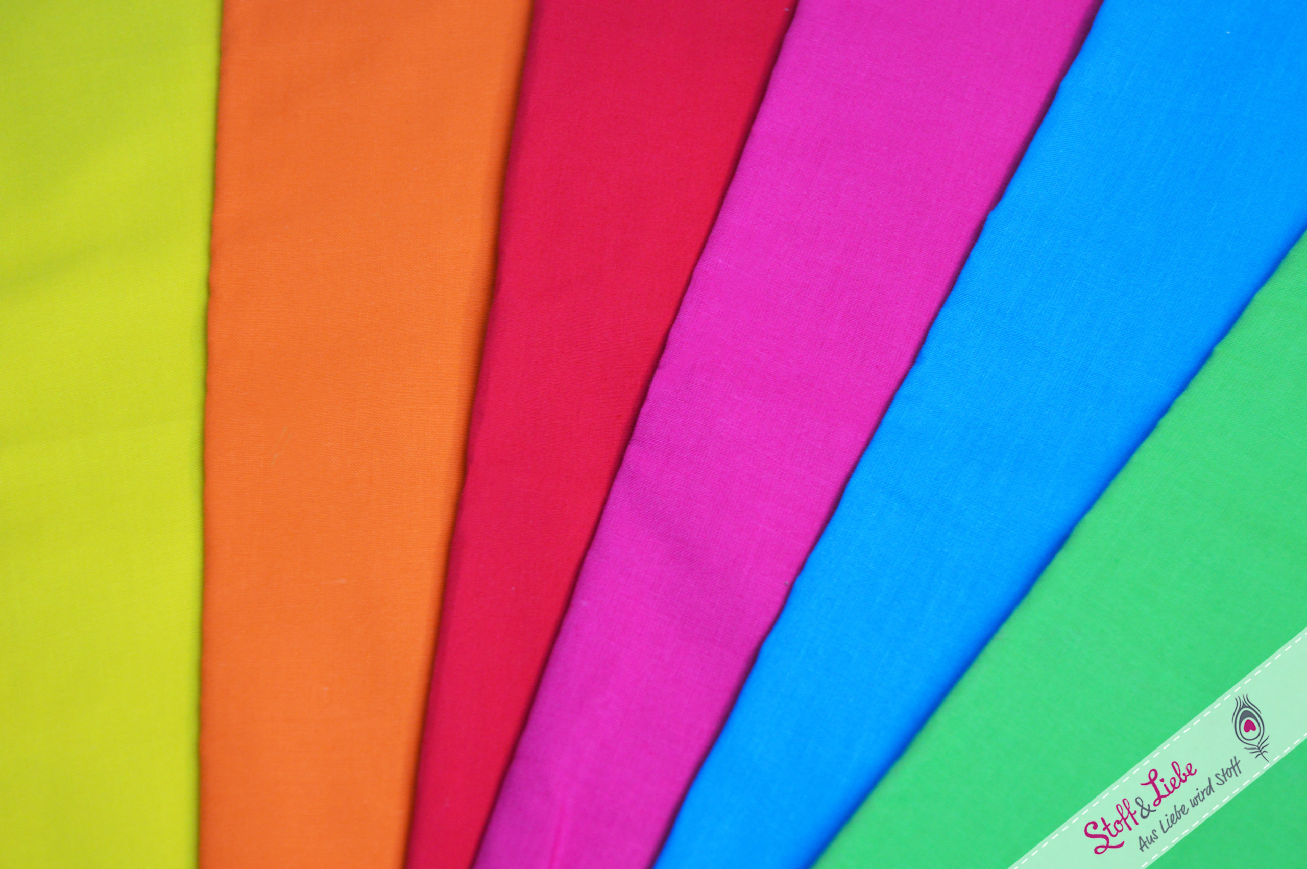Hier enthalten sind Webstoffe in folgenden Farben: Gelb, Orange, Rot, Magenta, Türkis und Grün.