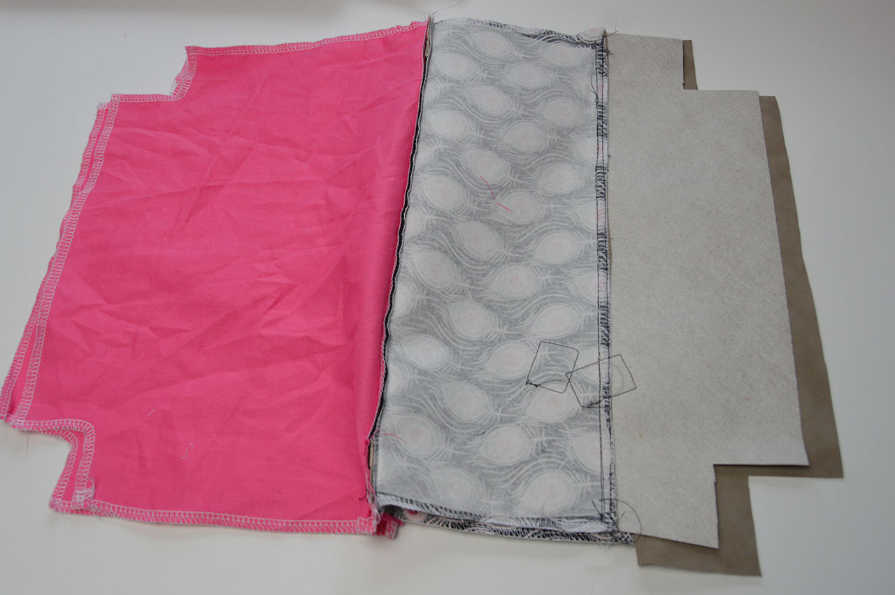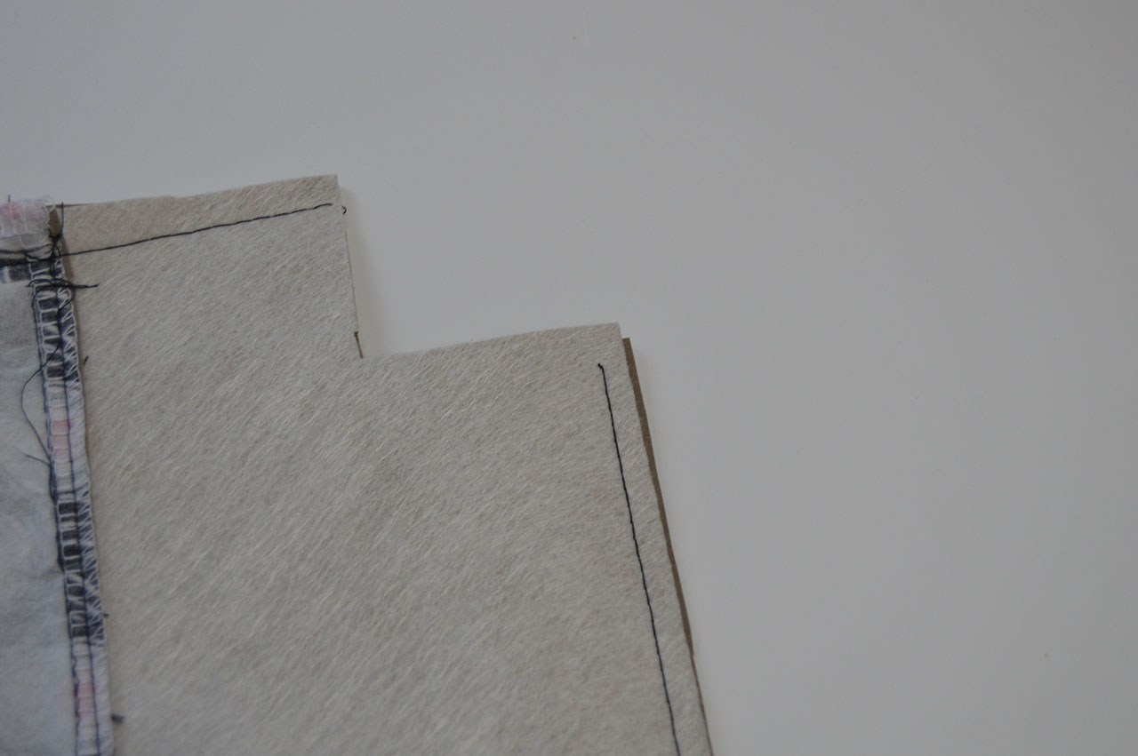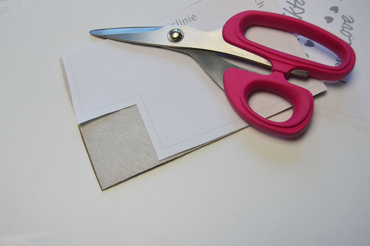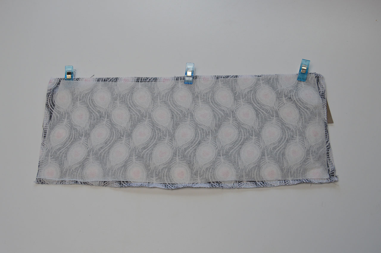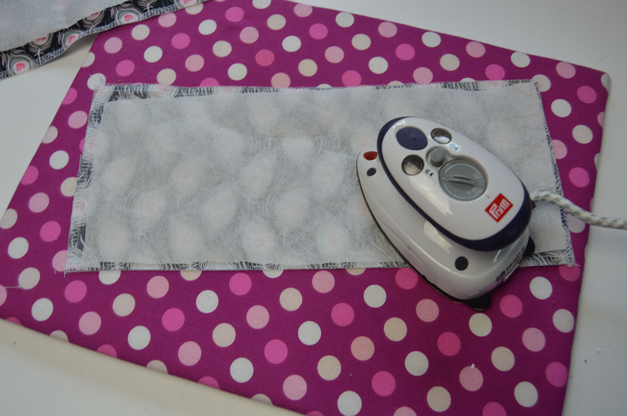 Die Vlieseline schneidet Ihr Euch etwas kleiner als die Stoffteile zu. Entweder nach Augenmaß, so wie ich 😉 oder Ihr nutzt das Schnittmuster, schneidet aber die Nahtzugabe weg.