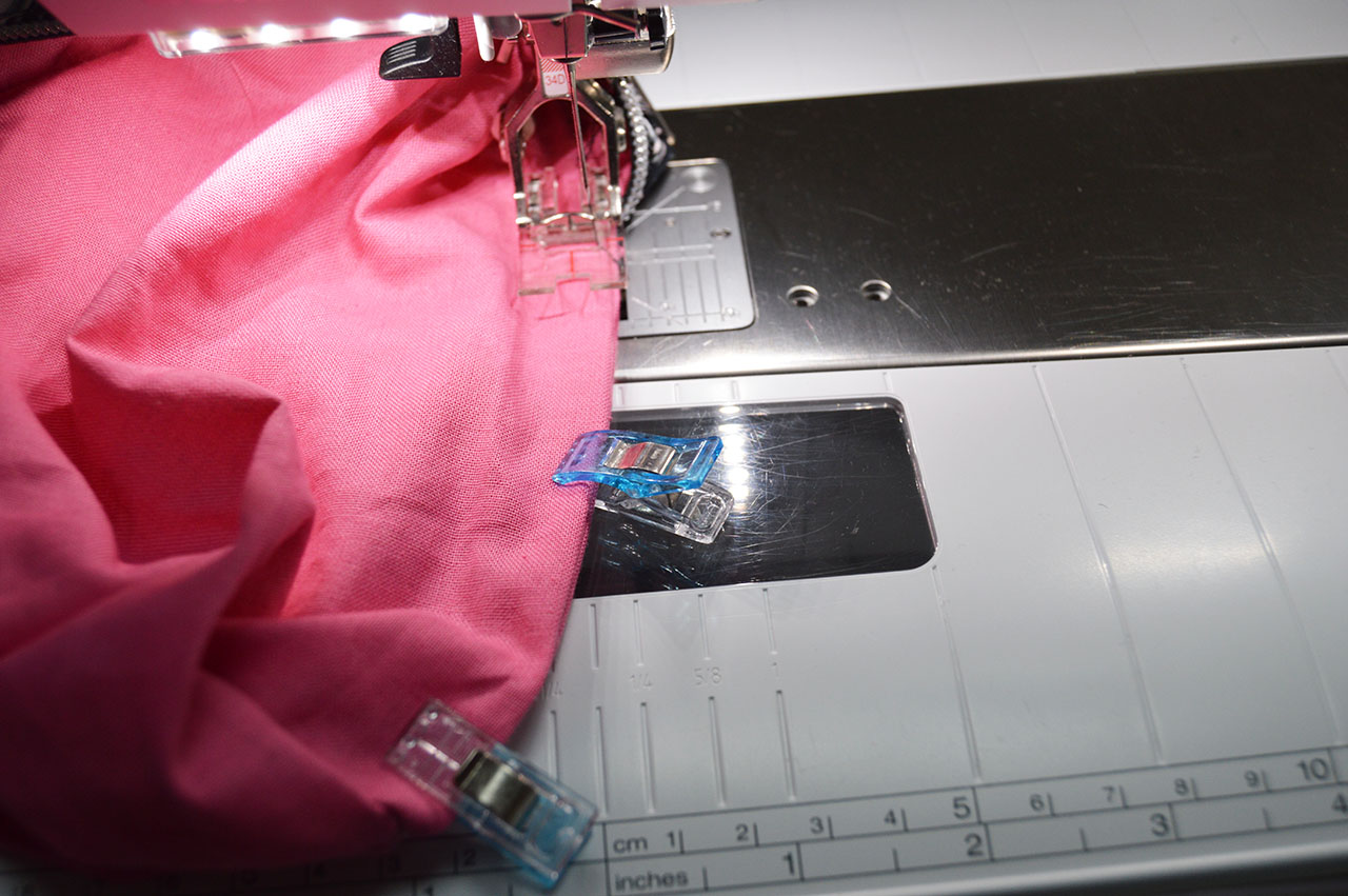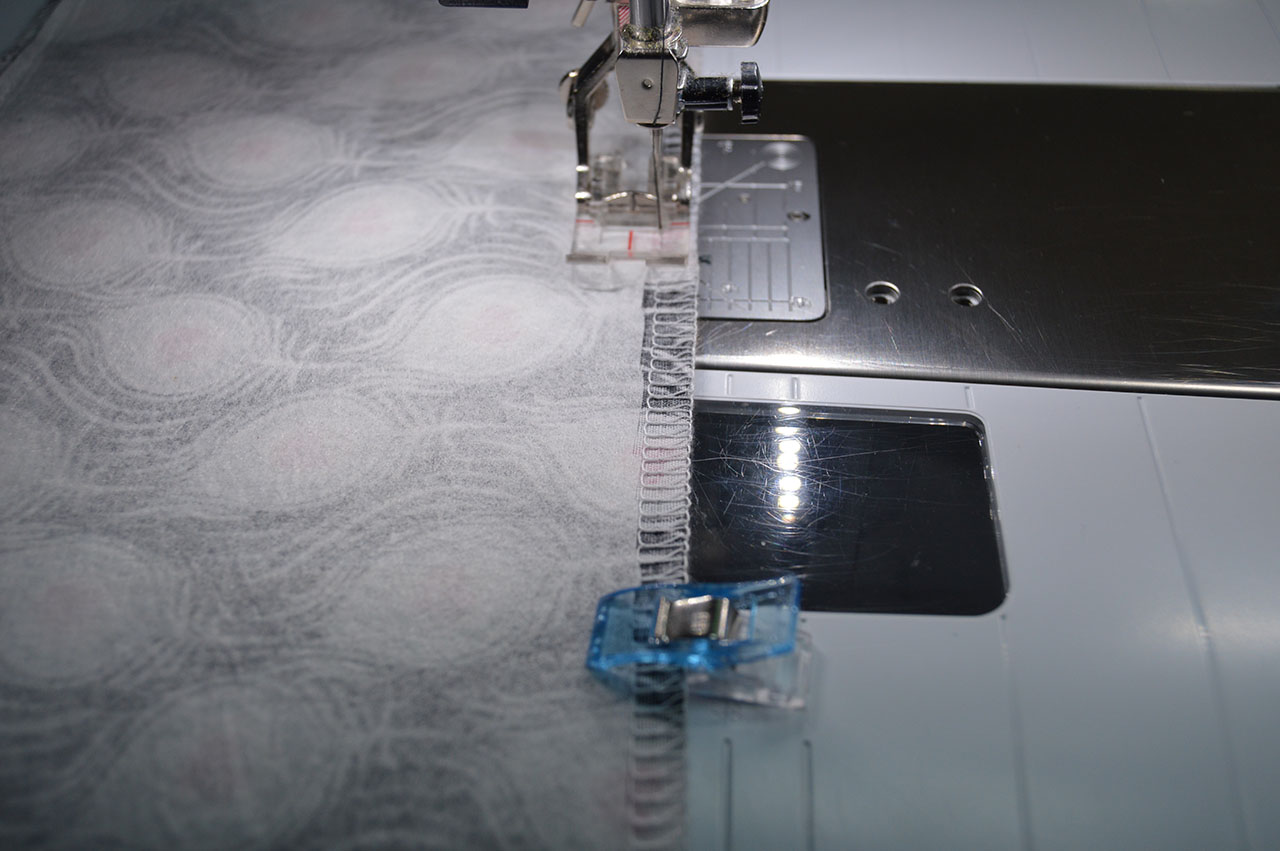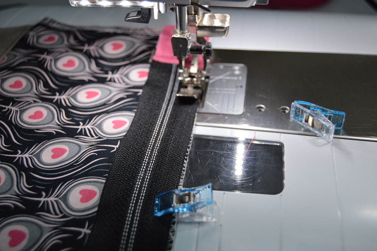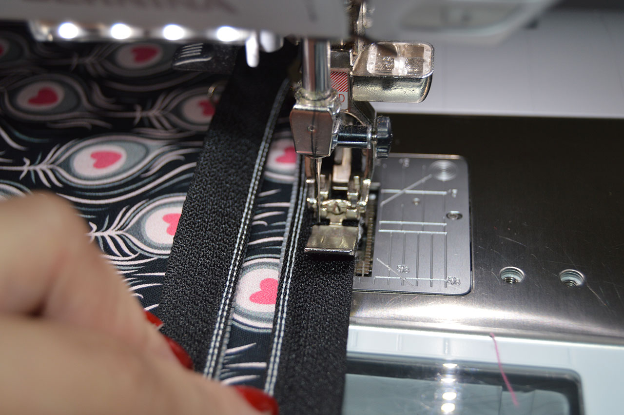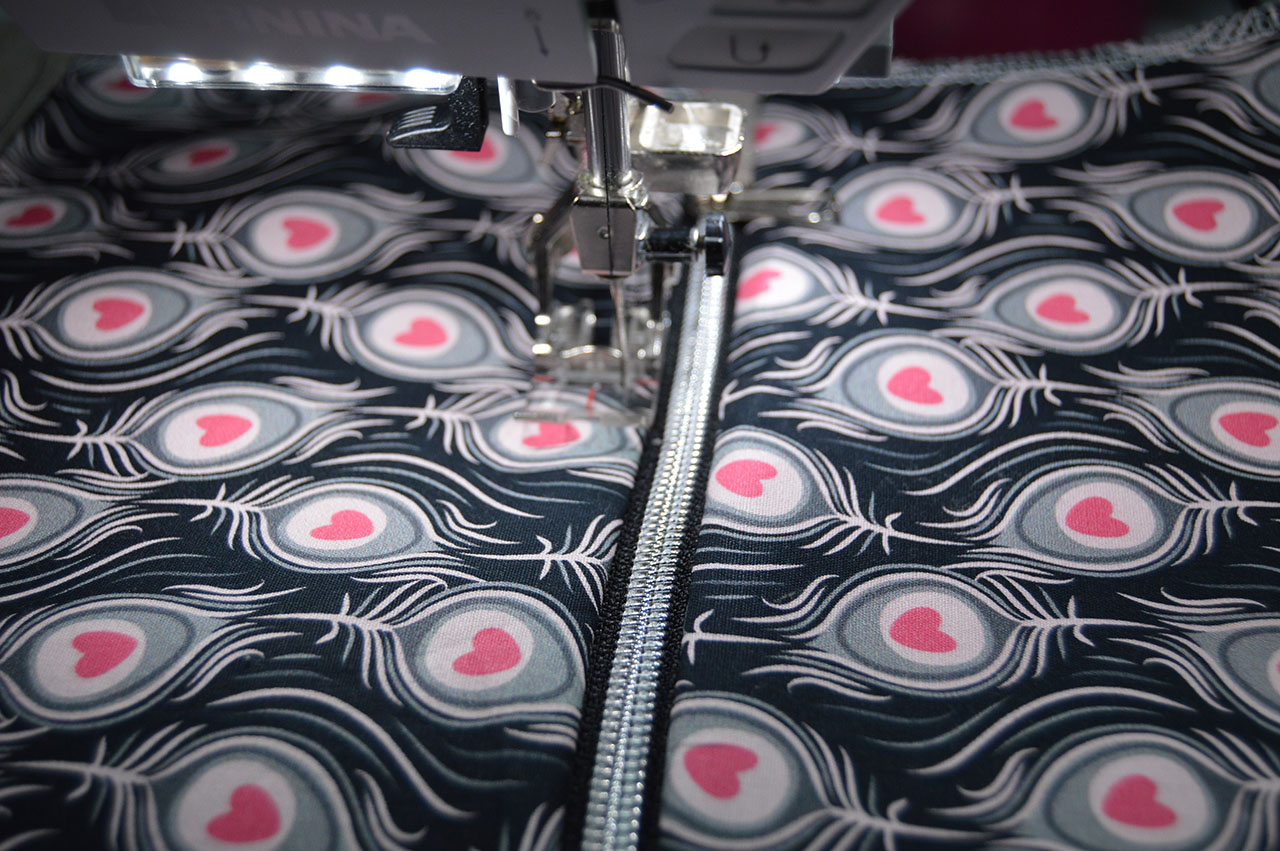 Achtung: Wenn Ihr in die Nähe vom Zipper kommt, stoppt kurz. Hebt Euren Nähfuß, aber lasst die Nadel unten. Zieht nun den Zipper ein Stück hinter den Nähfuß und senkt diesen wieder. Nun könnt Ihr weiternähen.