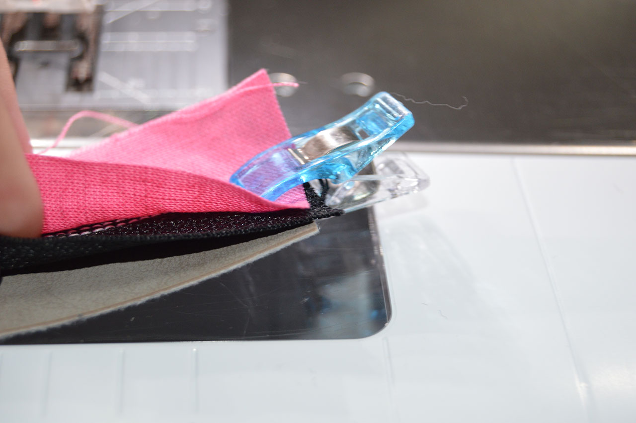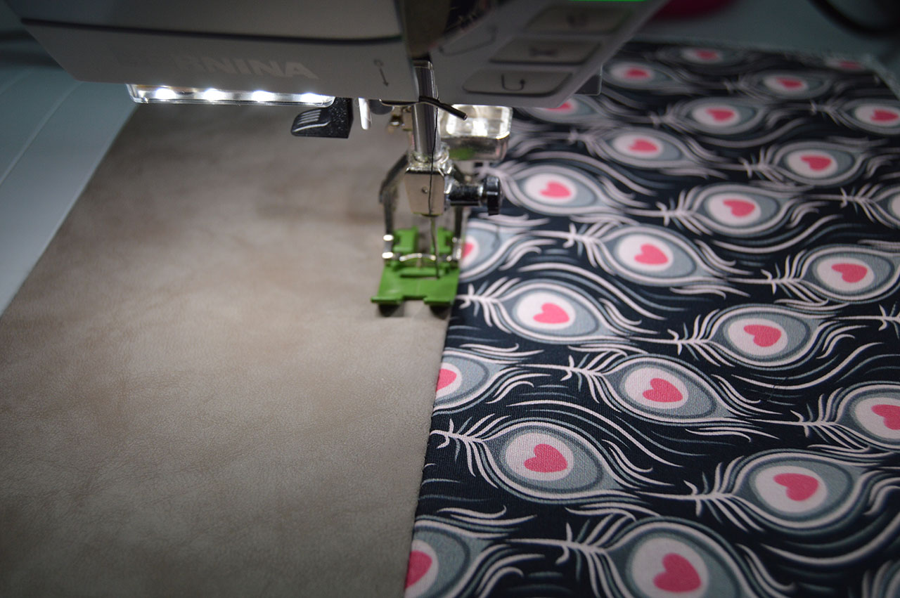 Anschließend legst Ihr das eben genähte Teil auf Euer Innenfutter und näht dieses auf die selbe Art und Weise fest. Achtet darauf, das Ihr genau auf der eben gesetzten Naht näht.