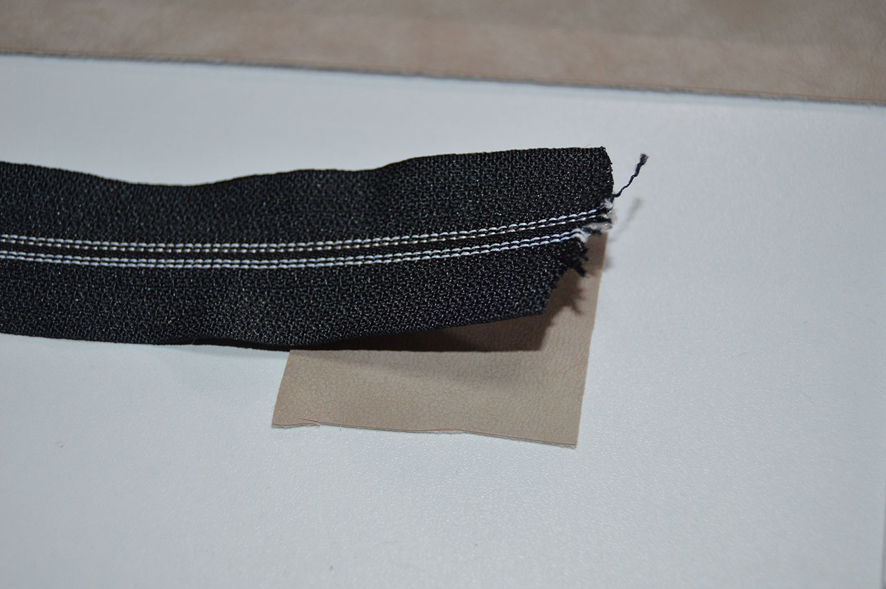 Nehmt Euch jetzt die herausgeschnittenen Ecken vom Kunstleder und Innenfutter zur Hand. Legt Euren Reißverschluss auf und kürzt die Stücke genau auf die Breite des Reißverschlusses ein. Dies sind nun Eure Reißverschlussendstücke mit dem der Reißverschluss eingefasst wird. Die Länge sollte ca. 5 cm betragen.