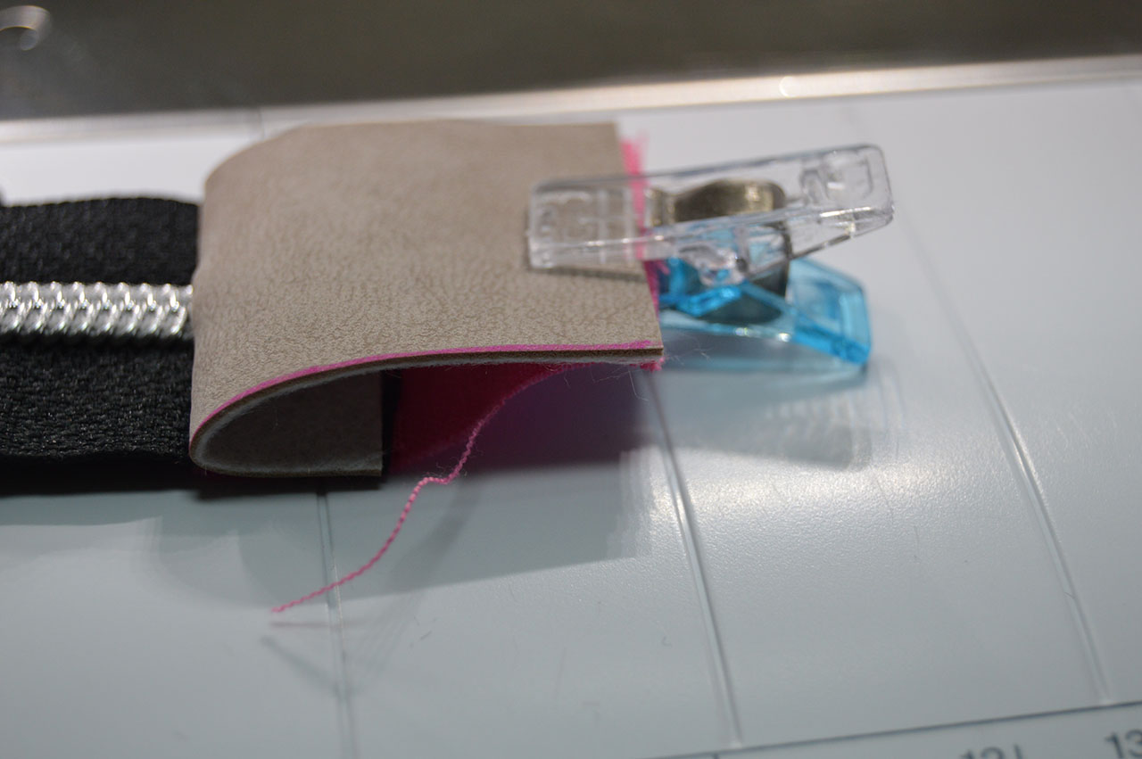 Als nächstes nehmt Ihr Euch einen Reißverschluss zur Hand und fädelt den Zipper auf. Danach legen wir das Reißverschluss-Endstück aus dem Außenstoff nach unten, darauf den Reißverschluss (Zähnchen auf das Kunstleder) und wiederum darauf das Endstück aus dem Innenstoff. Die rechten Seiten zeigen jeweils zum Reißverschluss.