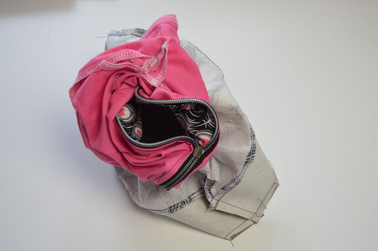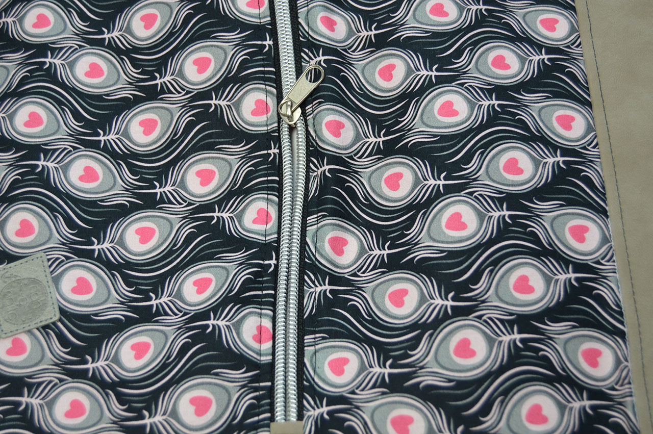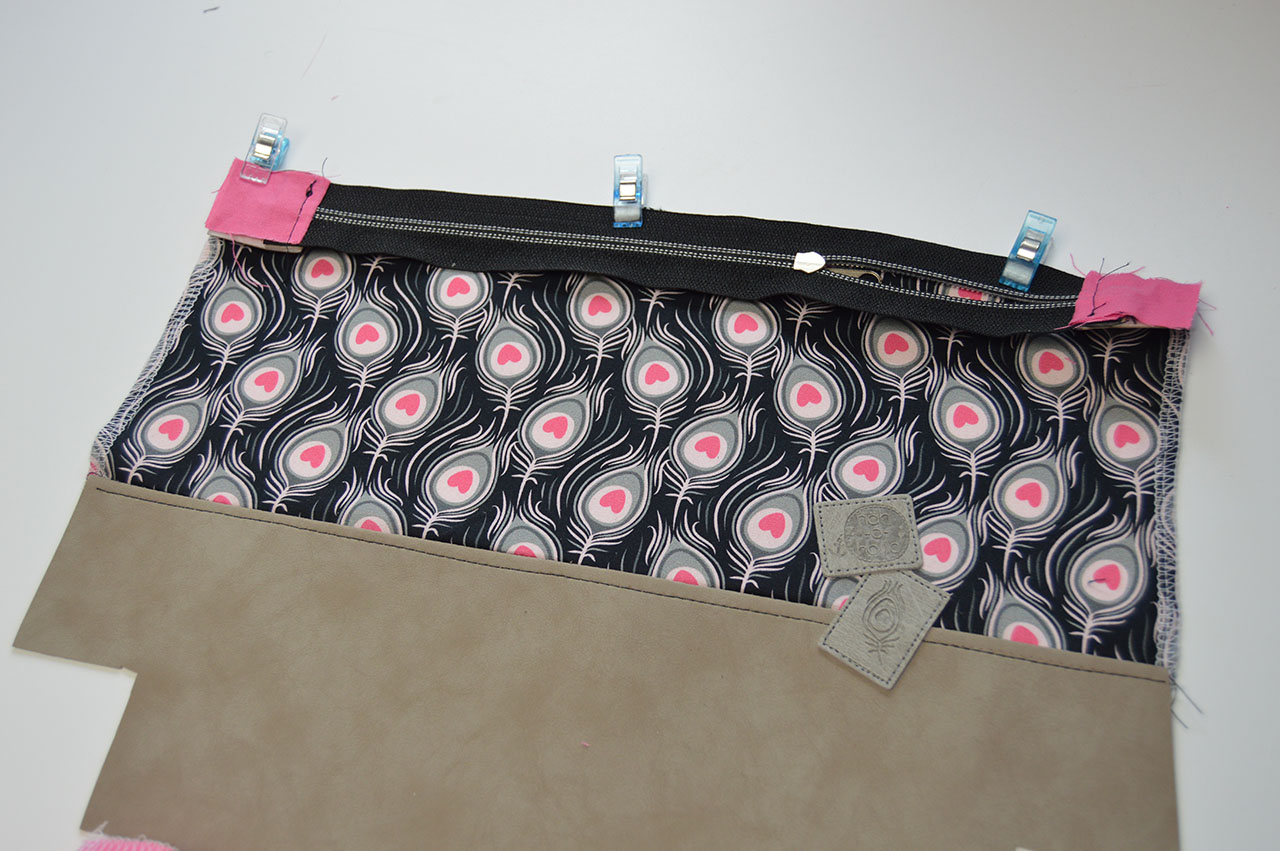 Auf dem unteren Bild sehr Ihr, dass sich die Reißverschluss-Entstücke Richtung Innenfutter wölben. Achtet beim zusammennähen darauf, dass sie in dieser Richtung liegen bleiben und außerdem, dass die Teilung ebenfalls aufeinander trifft.