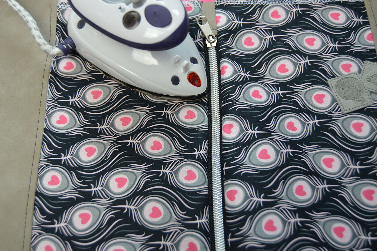 Habt Ihr dies erledigt, klappt Ihr alle Seiten auseinander, so dass Ihr den Reißverschluss mittig liegen habt. Je nach Stoffart könnt Ihr nun die Kanten am Reißverschluss bügeln. Wenn Ihr alles zurecht gerückt habt, steppt beide Seiten ab. Achtet darauf, dass auch das Innenfutter schön glatt liegt.