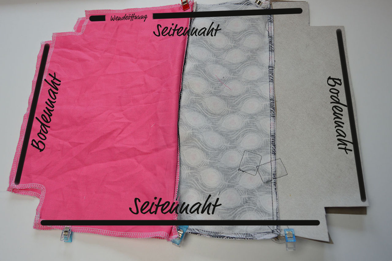 Nun näht Ihr zuerst die Seitenteile (siehe Markierung Foto) und dann den Boden zusammen, lasst im Futterstoff eine Wendeöffnung von mindestens 7 cm!