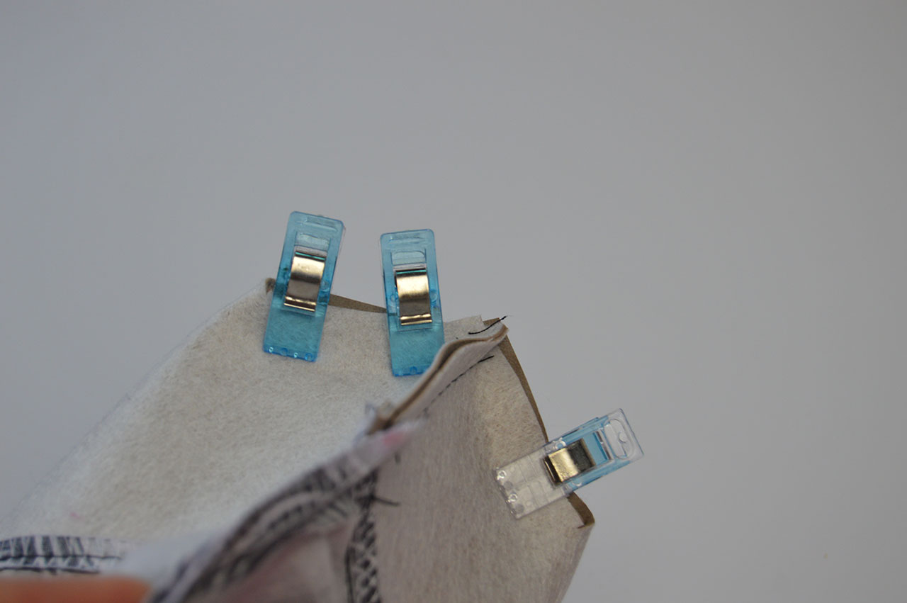 Jetzt sind die Ecken an der Reihe. Zieht die Stoffe an den Ecken nun so auseinander, dass sie wie auf dem Foto aufeinander liegen. Die Seitennaht trifft auf die Bodennaht. Steckt wieder alles gut fest.
