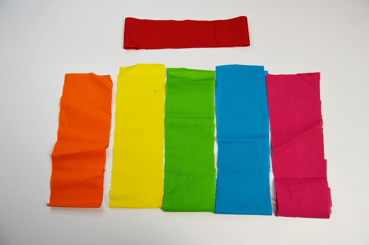 Als erstes schaut Ihr,welche Eurer Stoffreste Ihr nutzen wollt. Wir haben vom Zuschnitt noch Streifen mit einer Größe von ca. 48 cm x 8,5 cm pro Farbe über. Lediglich unser roter Streifen ist nur 5,5 cm hoch, deshalb werden wir diesen für den Tunnelzug des Beutels nutzen.
