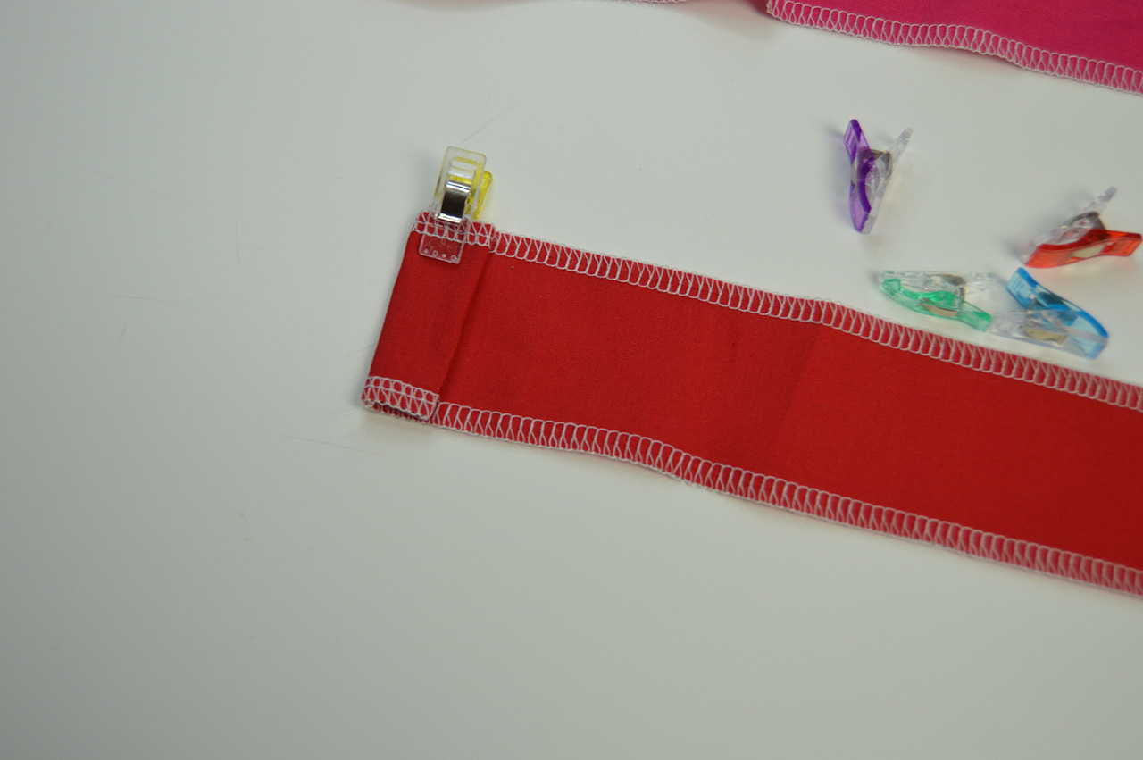 Nun bereiten wir die Tunnelzüge vor. Dazu seitlich jeweils links auf links erst einmal einen cm nach innen klappen und dann noch ein weiteres Mal um noch einen cm. Ihr könnt nun einmal die eben entstandene Kante überbügeln und im Anschluss absteppen. Ob Ihr hier ein oder zwei Nähte setzt, könnt Ihr selbst entscheiden. Dies wiederholt auch an der anderen Seite des Stoffstreifens.