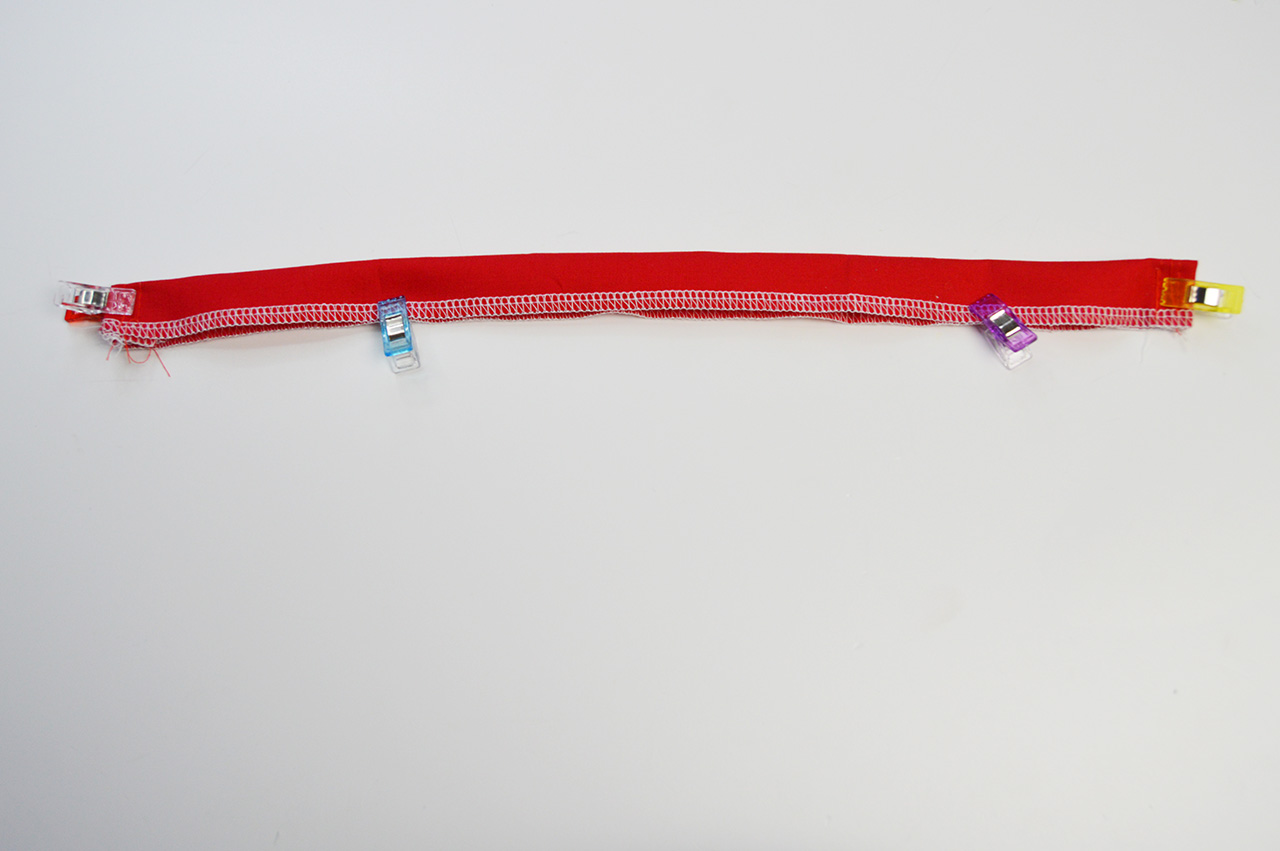 Der Tunnel wird anschließend in der Höhe auf die Hälfte links auf links gefaltet und ebenfalls gebügelt.