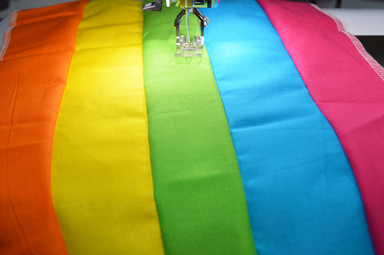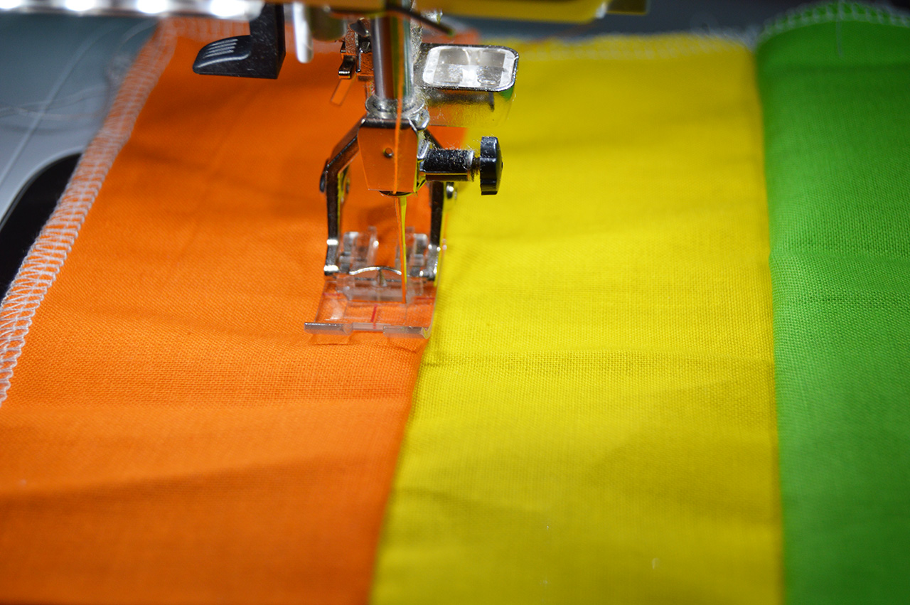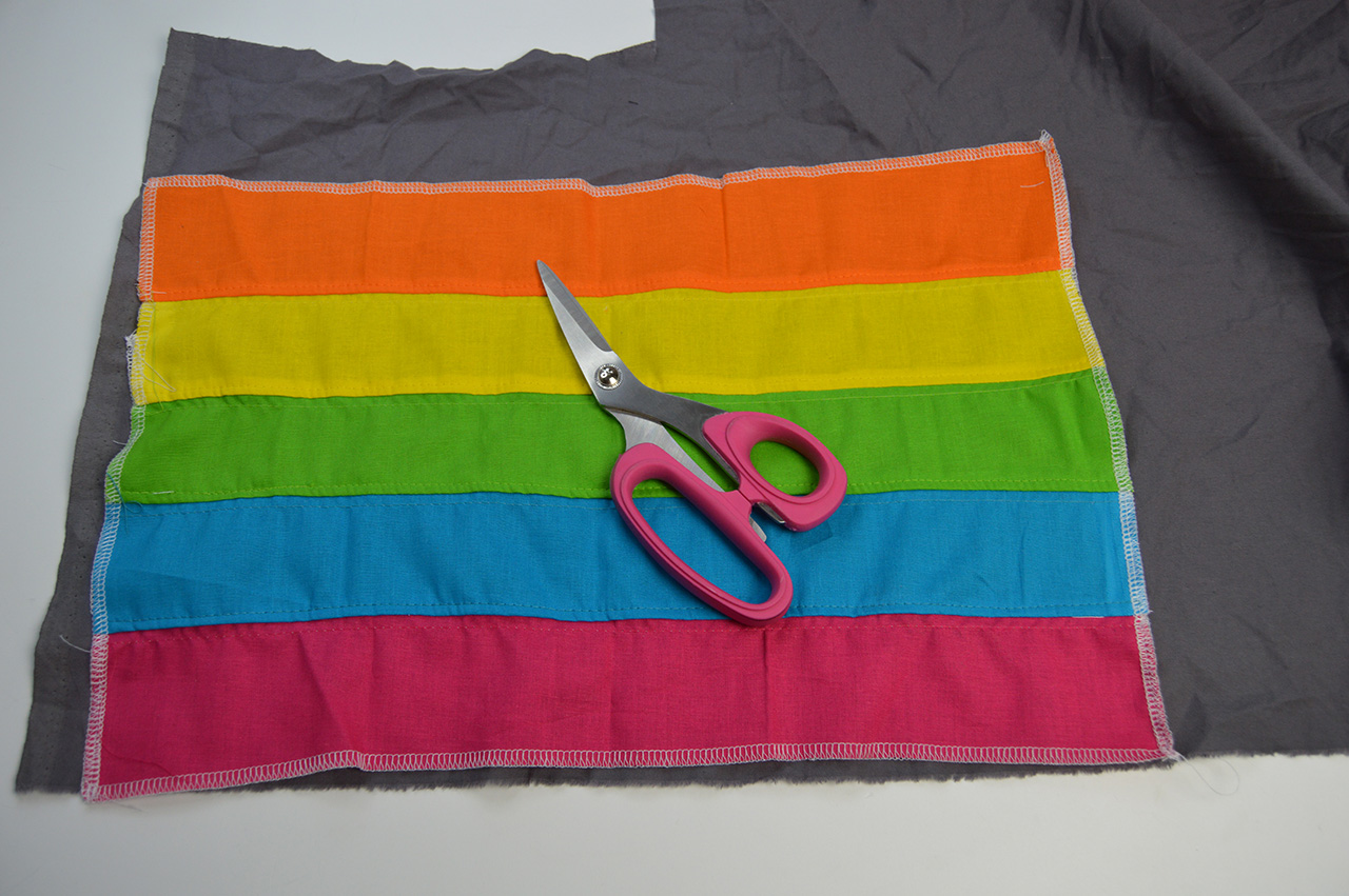 Näht jetzt für Euren Außenbeutel Eure Stoffstreifen an der langen Seite aneinander, beachtet hierbei Eure Farbabfolge. Den Streifen für den Tunnelzug, also den Streifen, den Ihr für ganz oben gewählt habt, legt Ihr zur Seite. Diesen nähen wir erst später an.