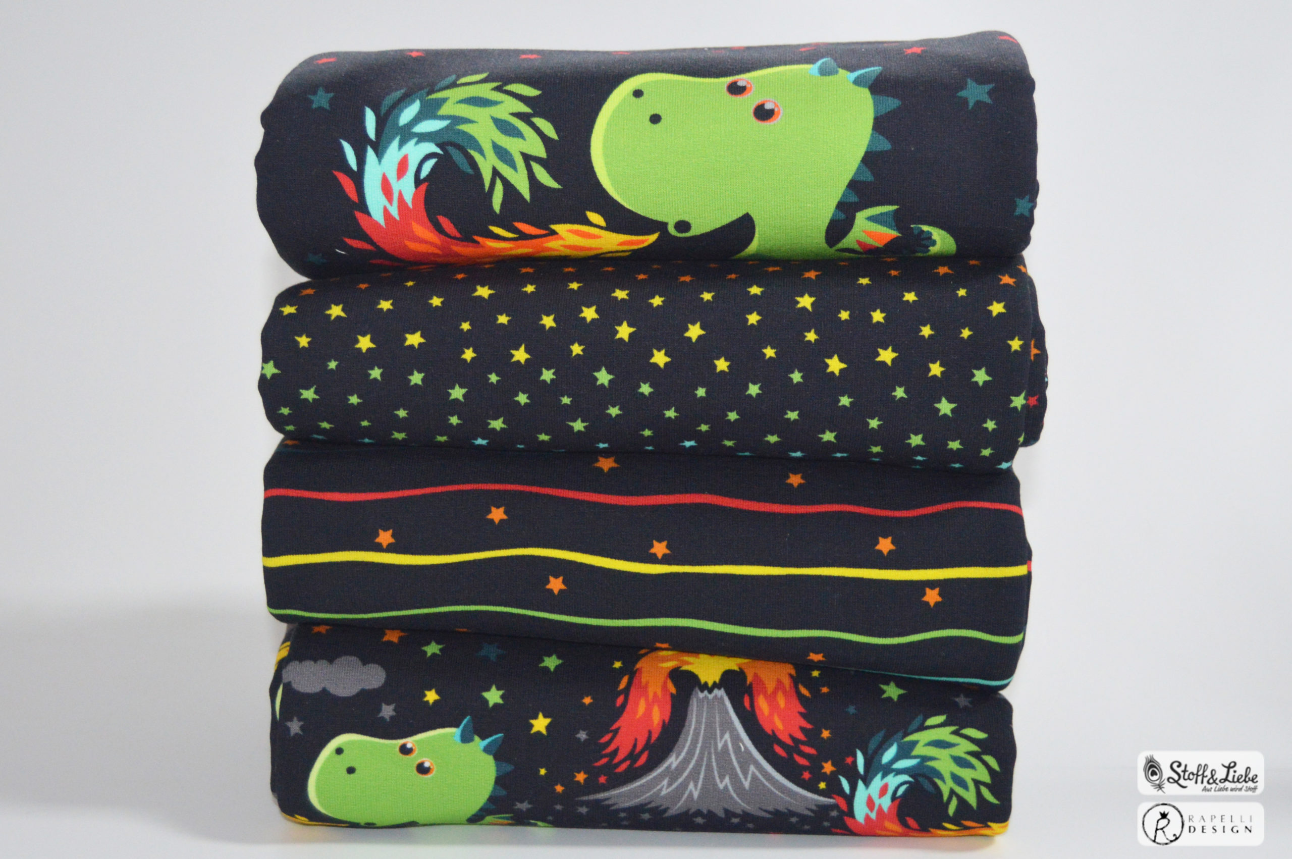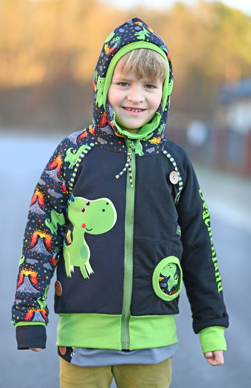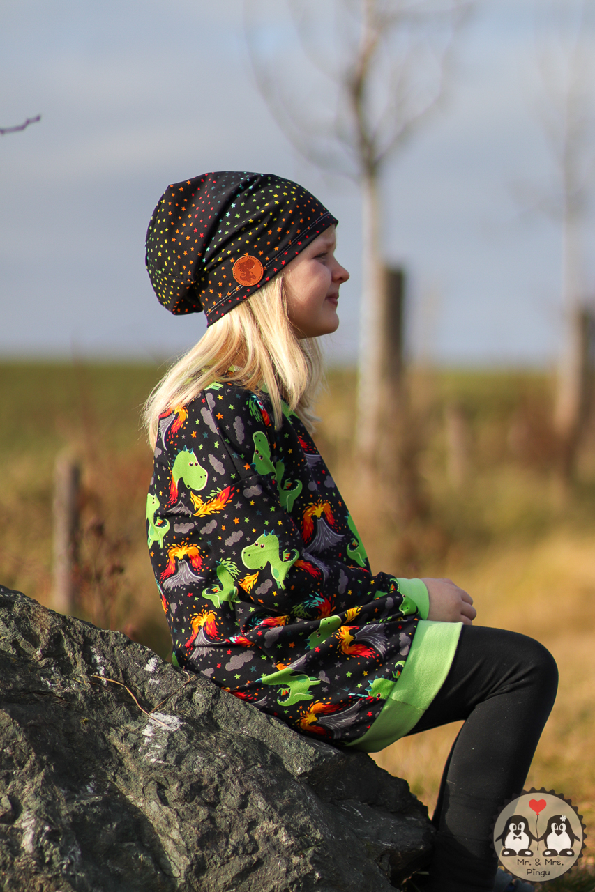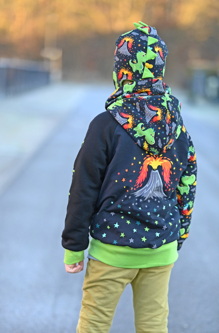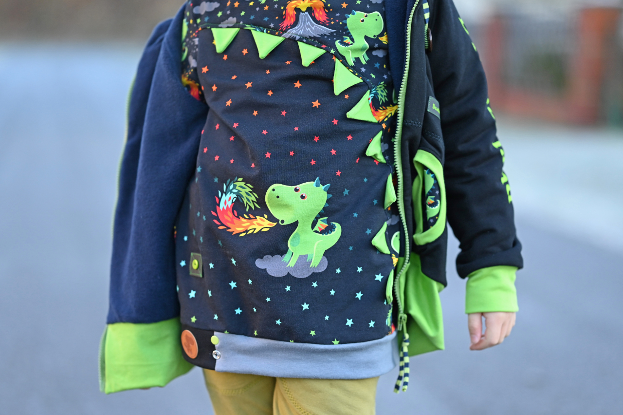 Als Hauptstoff haben wir einen Allover für Euch, der Euch bestimmt an den Allover aus unserer allerersten Kollektion erinnert, oder? Der Stoff ist schwarzgrundig und besticht durch seine leuchtenden, bunten Motive. Die Drachen haben eine Höhe von ca. 7 cm und somit die perfekte Größe für Teile in kleinen Größen, aber auch absolut perfekt vernähbar für größere Größen.