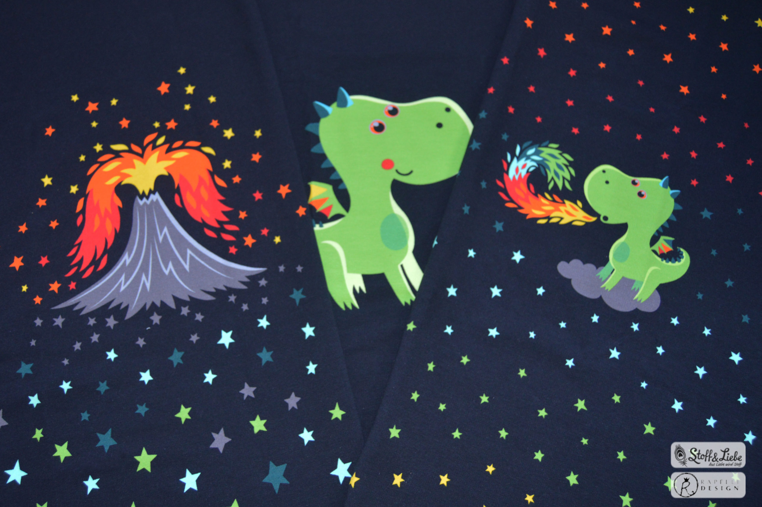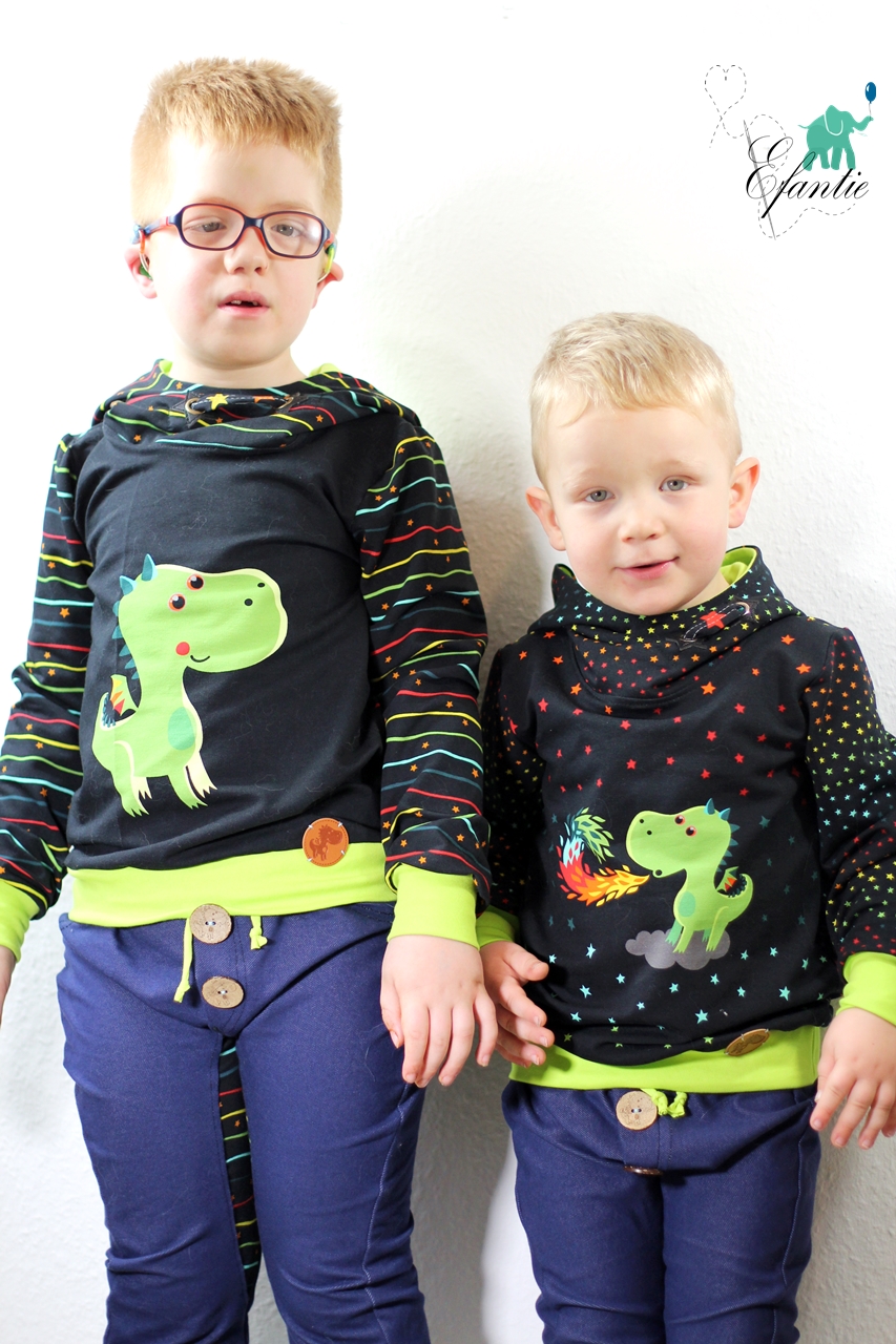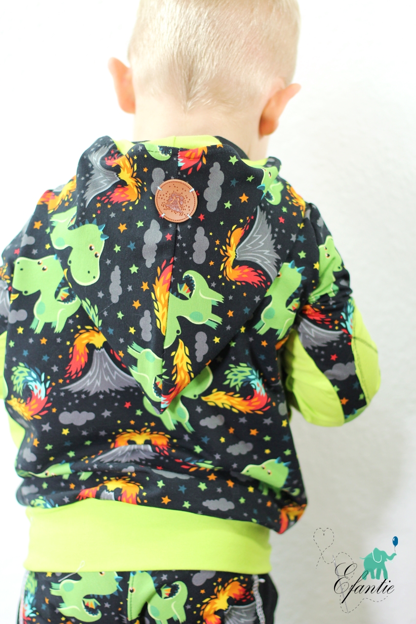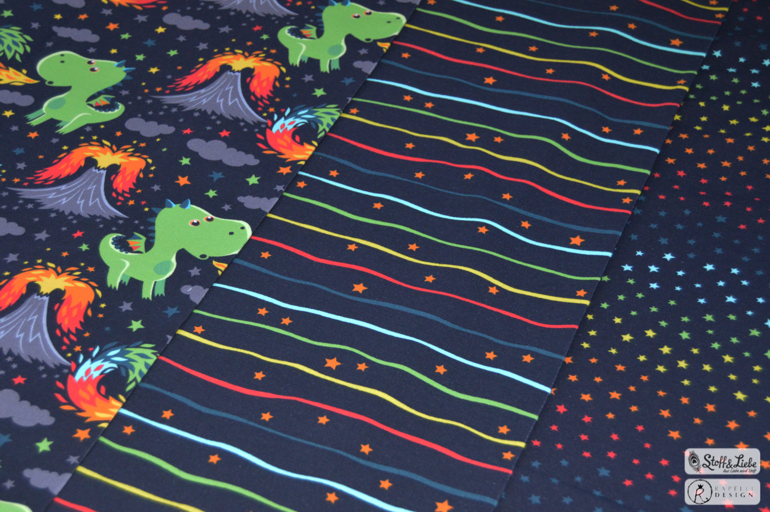 Als Hauptstoff haben wir einen Allover für Euch, der Euch bestimmt an den Allover aus unserer allerersten Kollektion erinnert, oder? Der Stoff ist schwarzgrundig und besticht durch seine leuchtenden, bunten Motive. Die Drachen haben eine Höhe von ca. 7 cm und somit die perfekte Größe für Teile in kleinen Größen, aber auch absolut perfekt vernähbar für größere Größen.