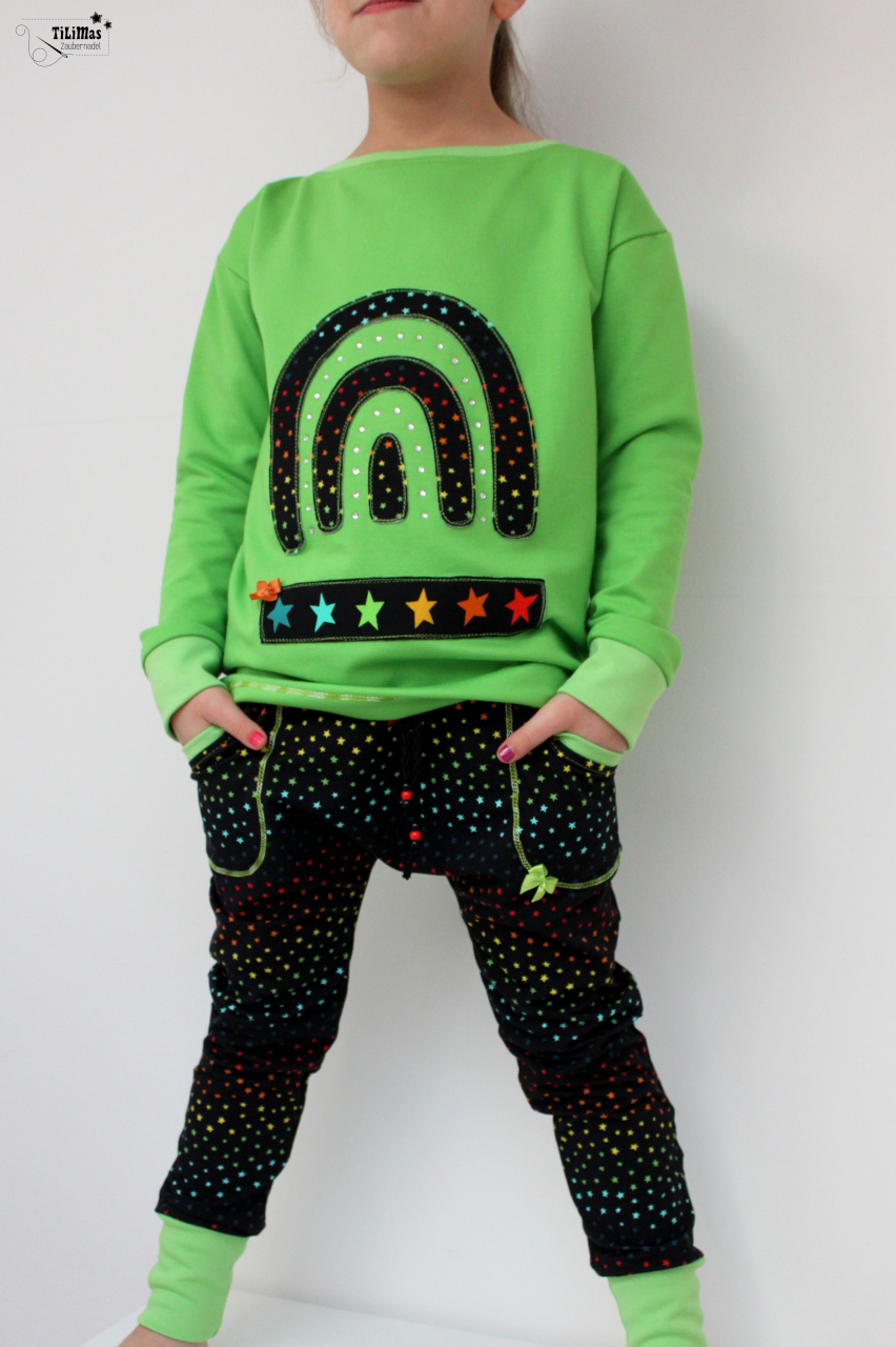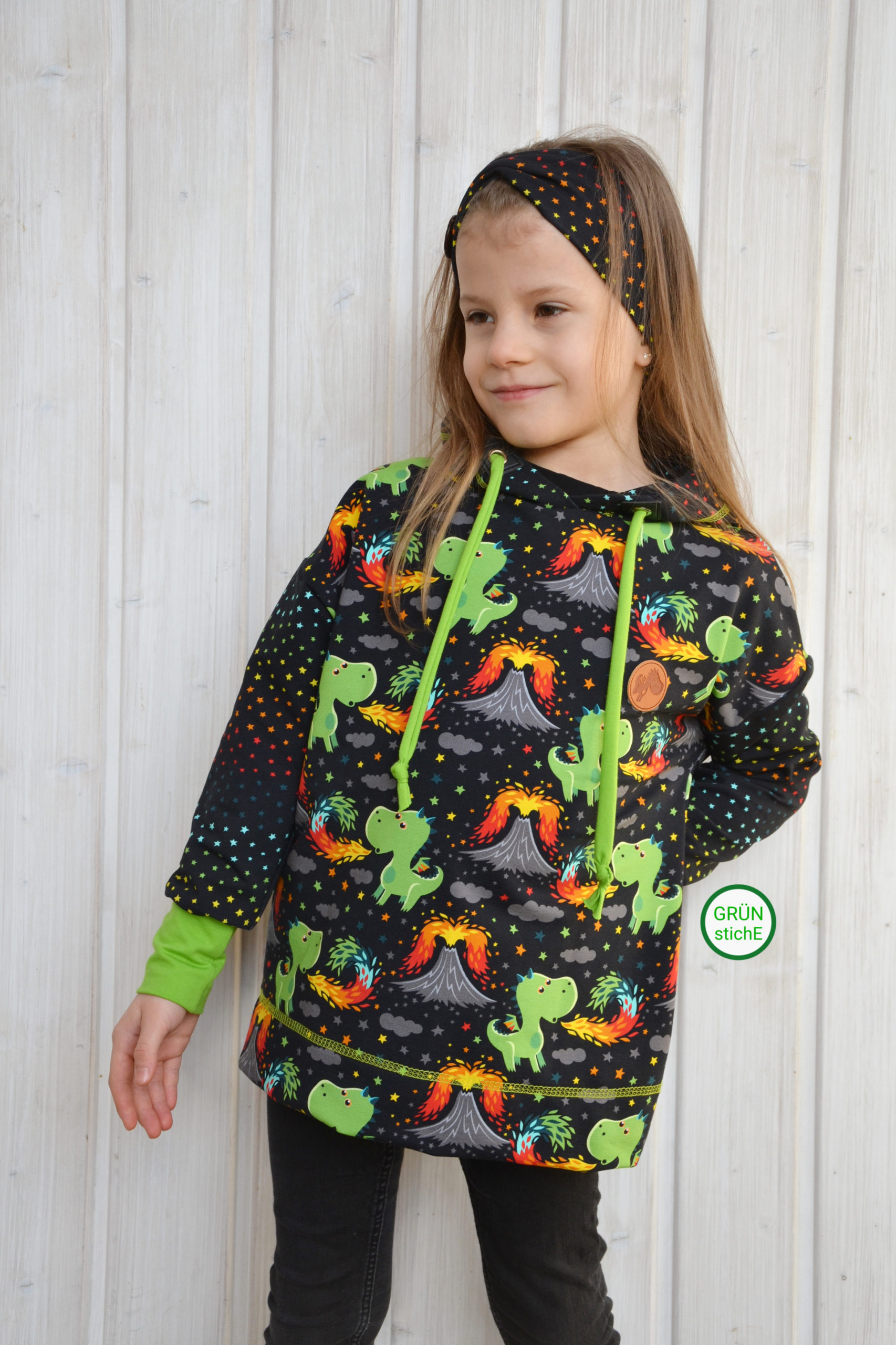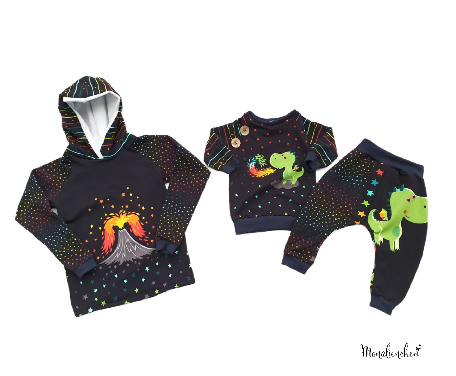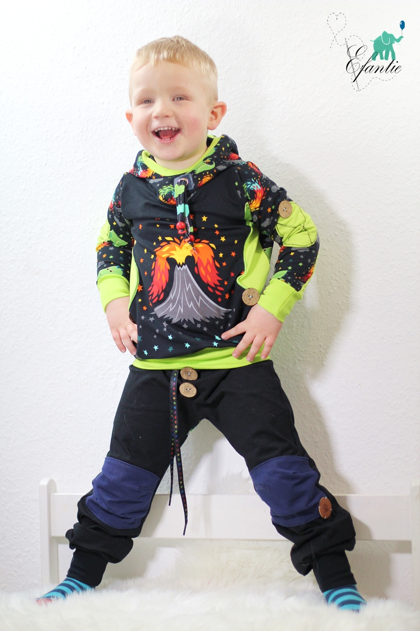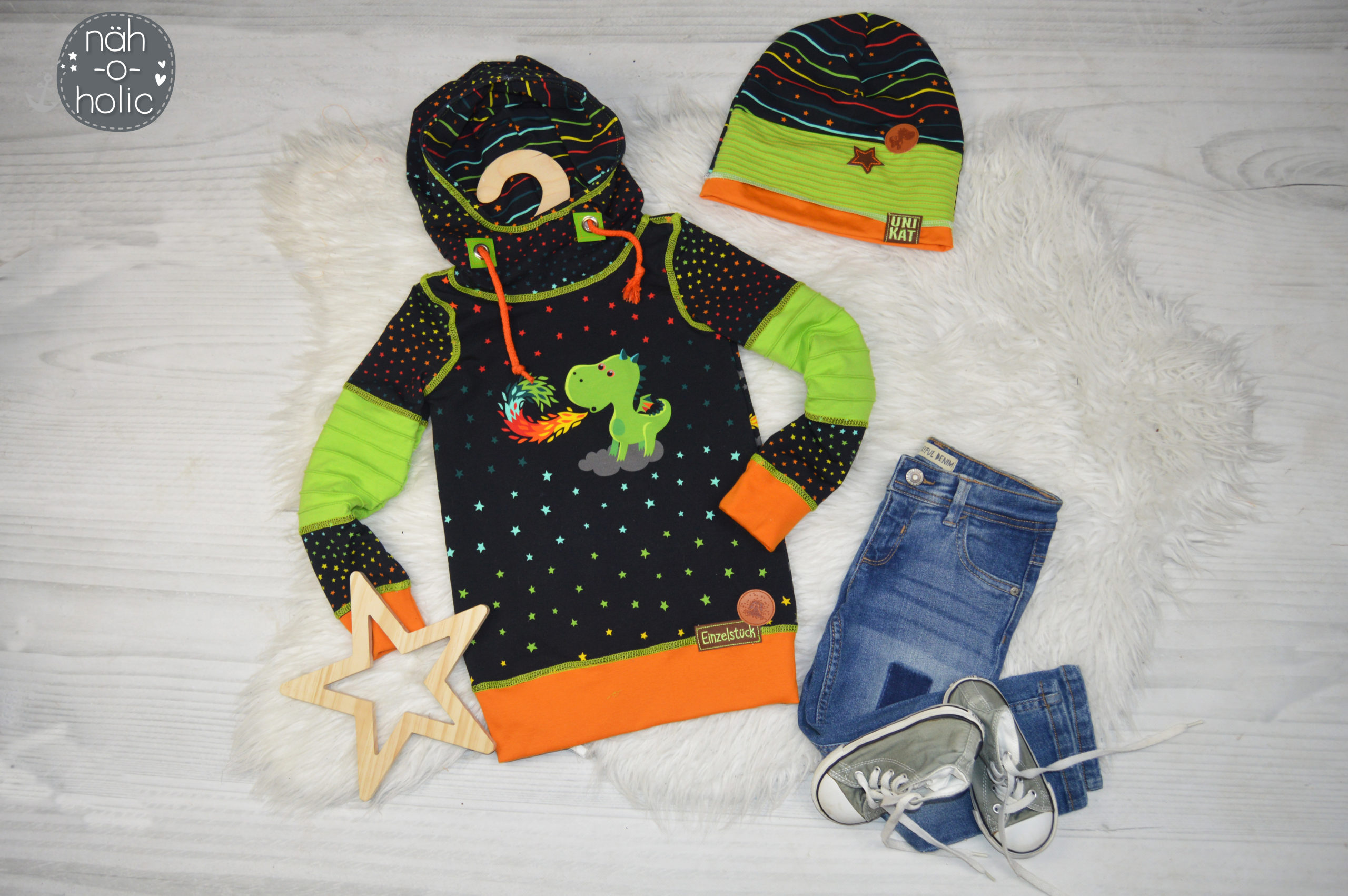 Als Hauptstoff haben wir einen Allover für Euch, der Euch bestimmt an den Allover aus unserer allerersten Kollektion erinnert, oder? Der Stoff ist schwarzgrundig und besticht durch seine leuchtenden, bunten Motive. Die Drachen haben eine Höhe von ca. 7 cm und somit die perfekte Größe für Teile in kleinen Größen, aber auch absolut perfekt vernähbar für größere Größen.