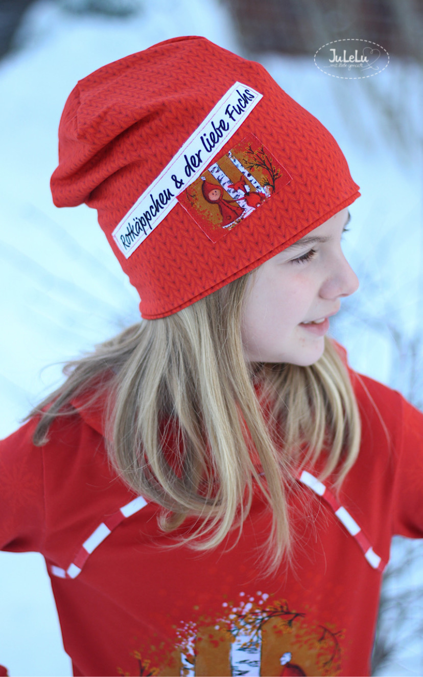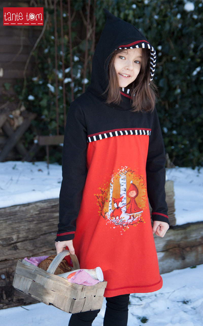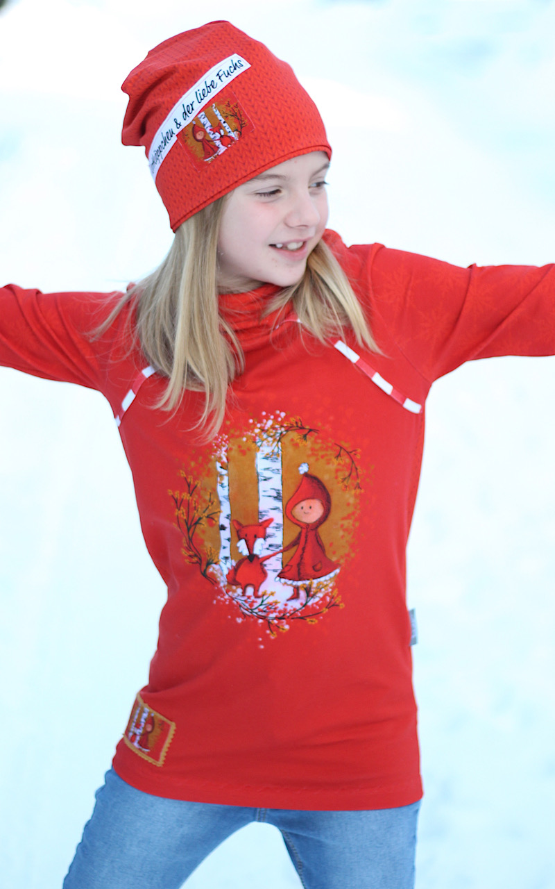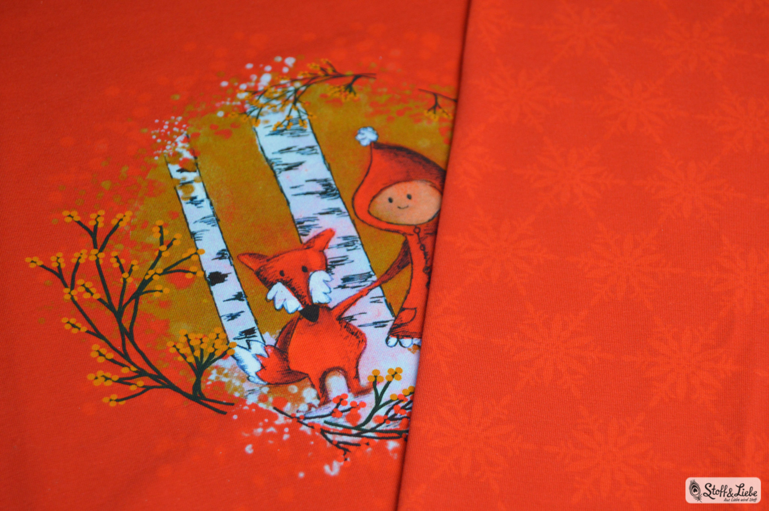 Das Panel ist im Verhältnis 1/3 zu 2/3 aufgeteilt. Auf dem ersten Drittel findet Ihr das zuckersüße, detailreiche Motiv „Rotkäppchen und der liebe Fuchs“ und auf dem zweiten Drittel befinden sich (hauchfein zu erkennen) Schneeflocken im Allover Design. So habt Ihr mit dem Panel alle Möglichkeiten für tolle Outfits. Wie wäre es zum Beispiel mit einem schicken Shirt? Einem Kleid oder einem kuscheligen Hoodie?