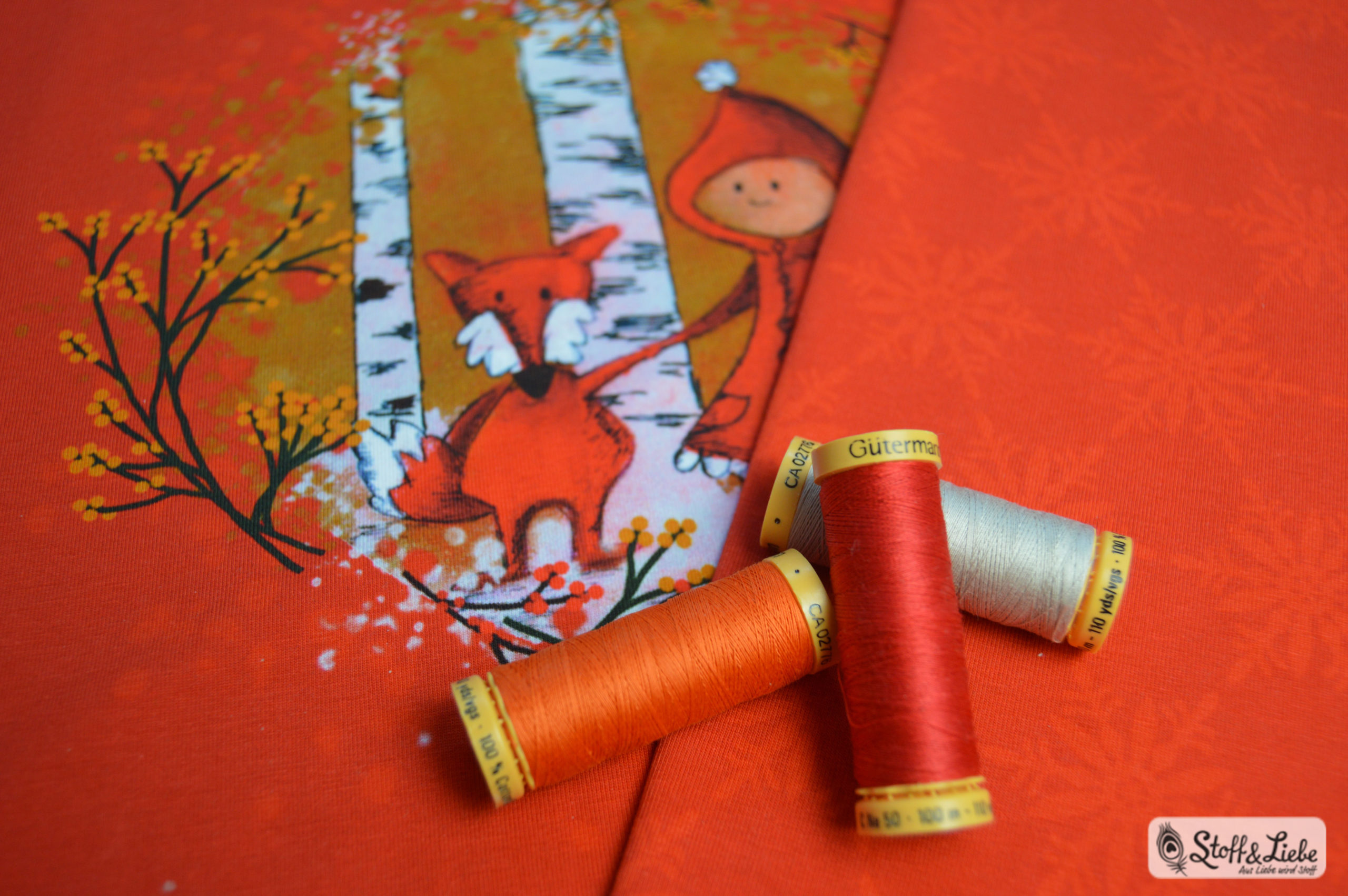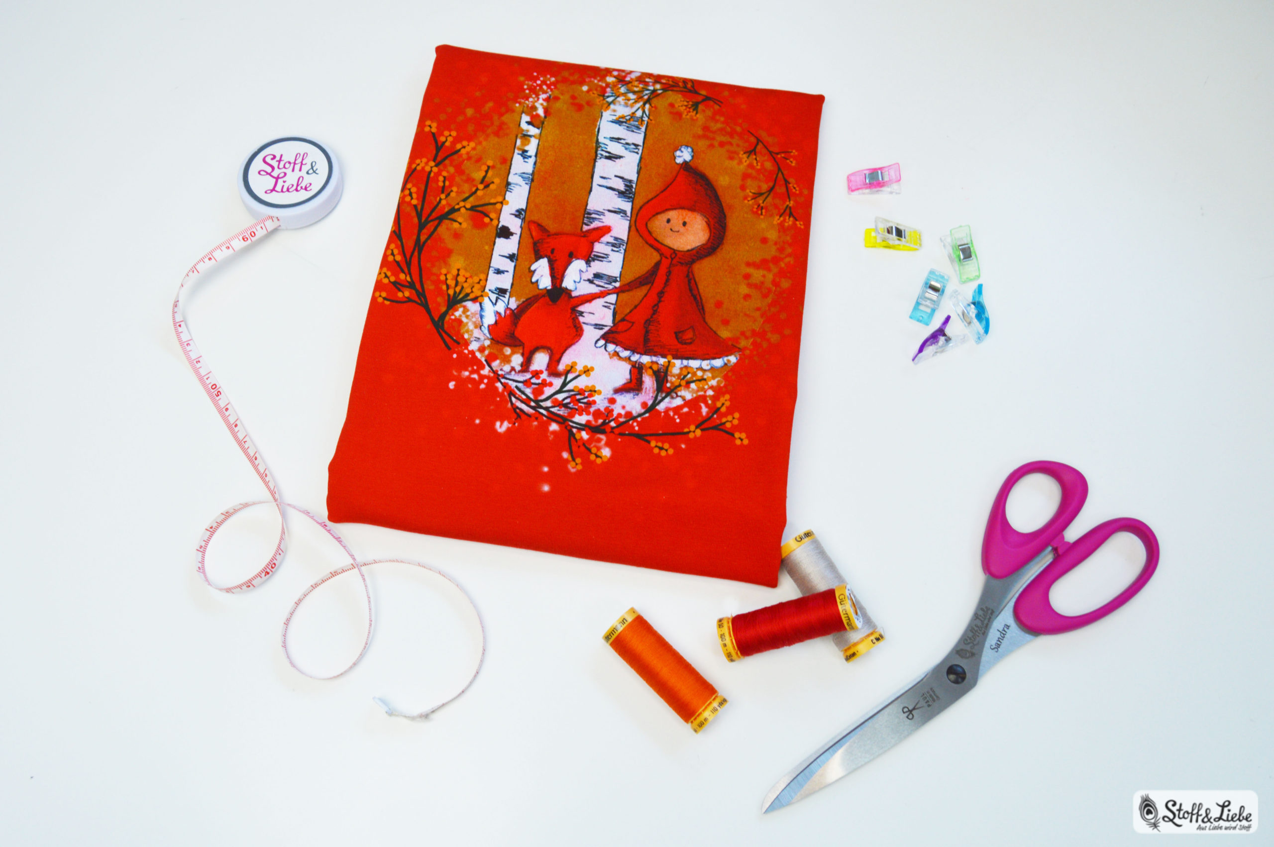 Rotkäppchen und der liebe Fuchs erscheint als Panel auf weichem, fließendem Jersey mit einer Materialzusammensetzung von 95 % Baumwolle und 5 % Elasthan. Die Höhe des Panel beträgt ca. 63 cm.