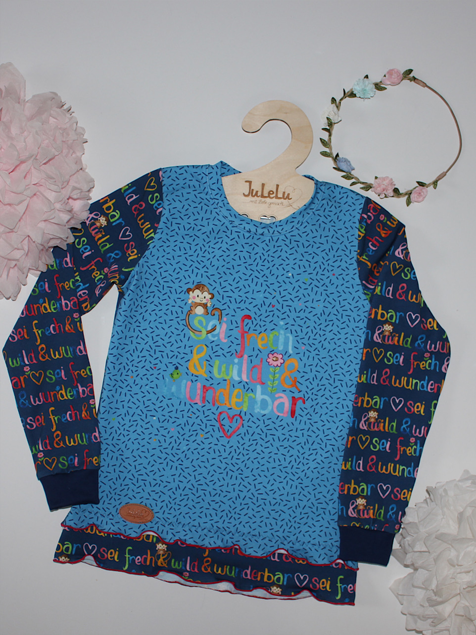 Die Paneele haben eine Höhe von ca. 60 cm bei voller Stoffbreite. Wie auch das Canvas Panel haben wir eine Aufteilung von 1/3 zu 2/3. Auf dem ersten Teil befindet sich das Motiv mit gemustertem Hintergrund und auf dem zweiten Teil die Frech & Wild Schrift als Allover.
