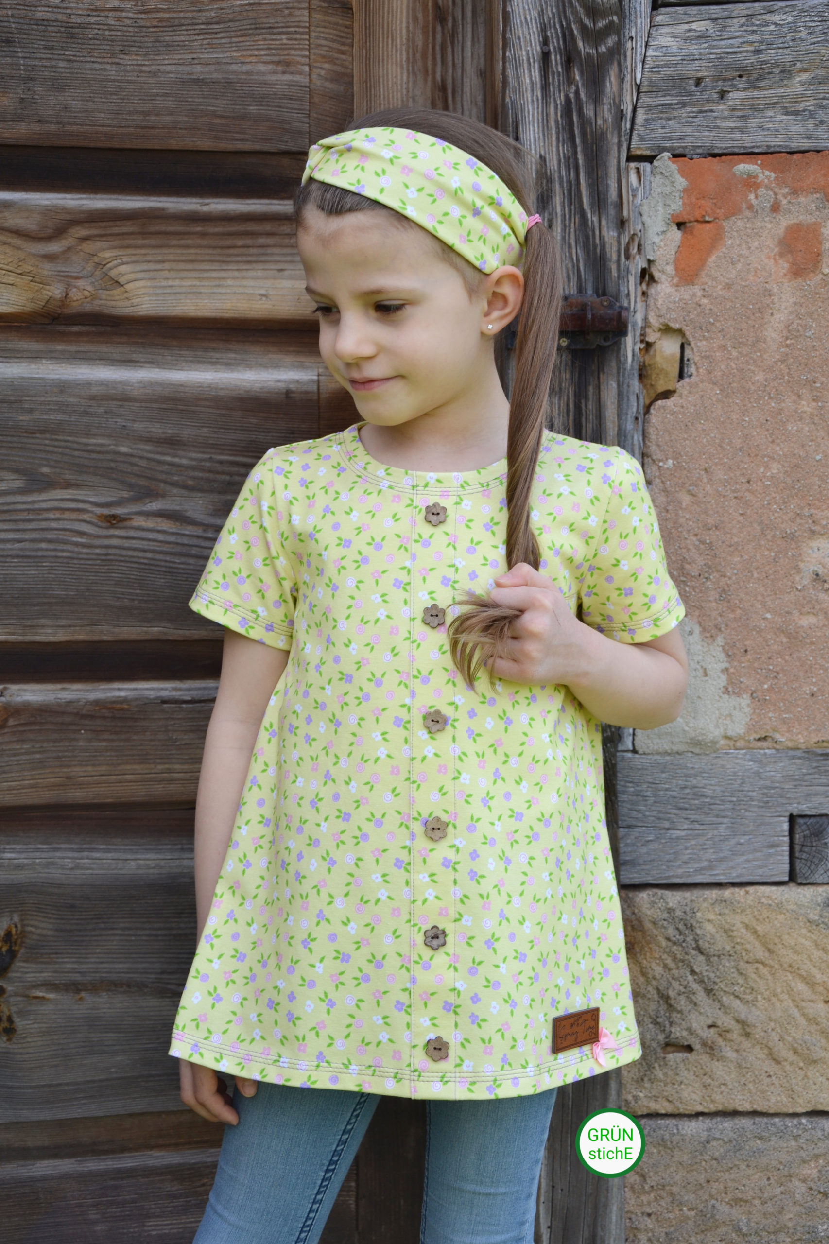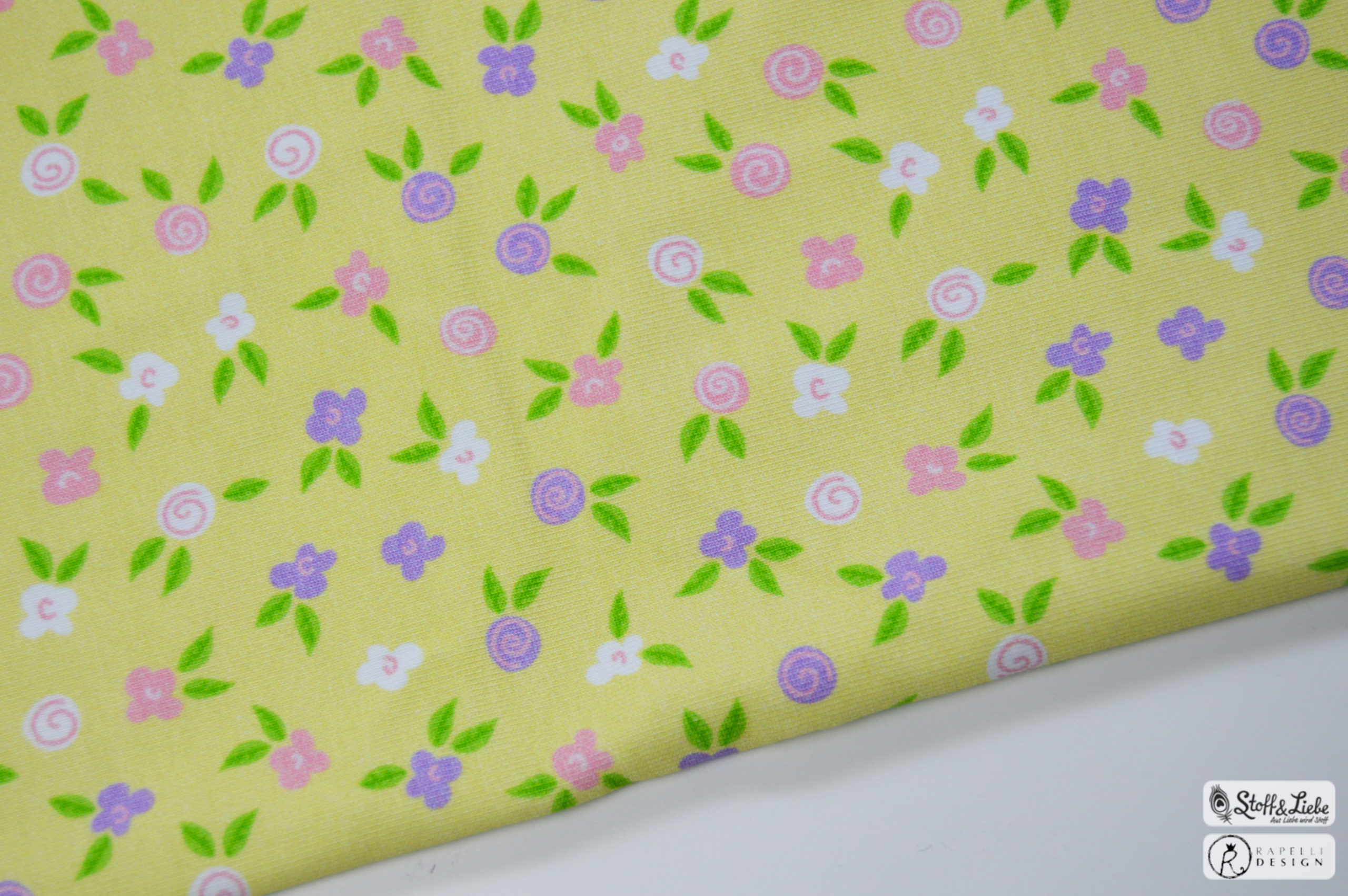 Ein Stoff der auch prima für tolle Sommeroutifts Solo vernäht werden kann sind unsere Fairy Flowers. In einem sanften Gelb mit den farbigen Blümchen ist es der Frühlingsstoff schlechthin.