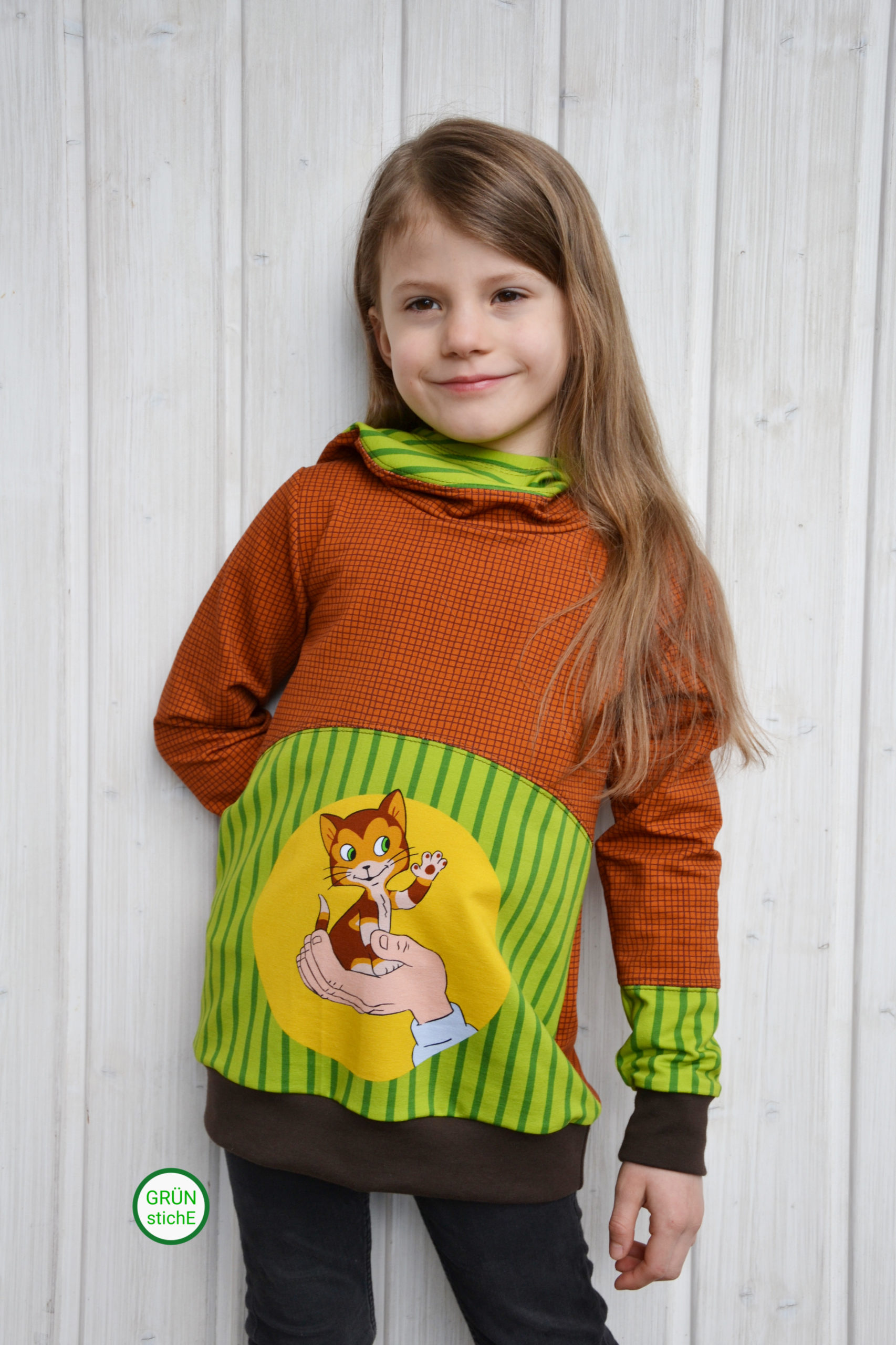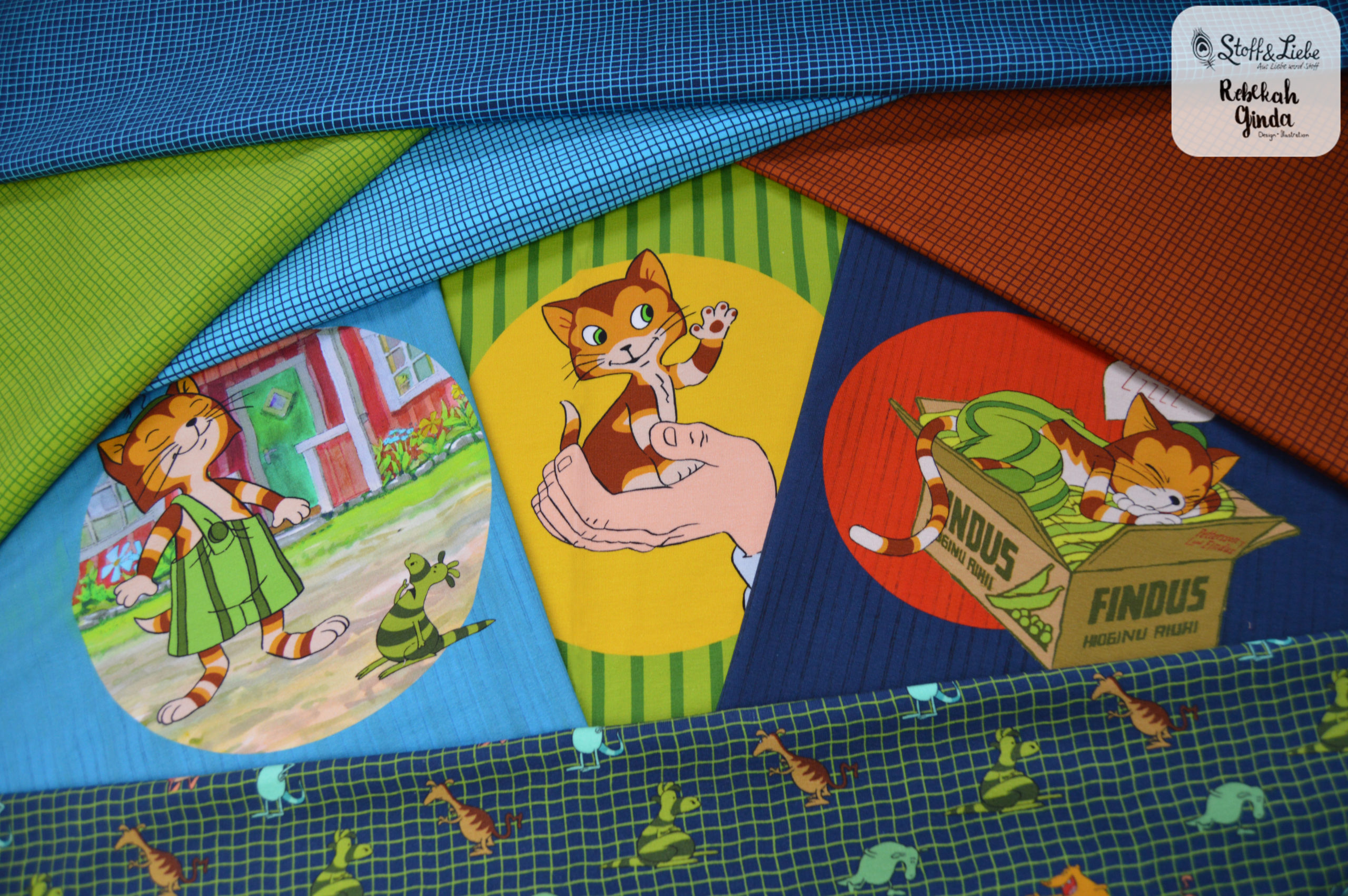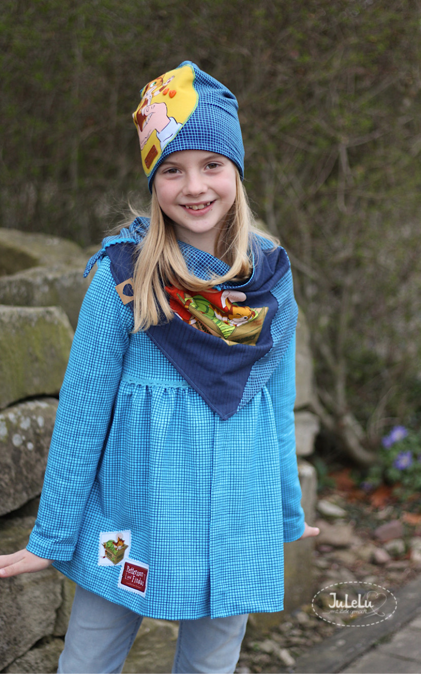 Das Panel mit einer Höhe von 64 cm hält für Euch drei zuckersüße Motive bereit. Durch die Höhe des Panels kann man die Panelteile auch prima für Longhoodies, Kleider oder einfach auch Shirts in größeren Größen nutzen. Die Hintergründe, zum einen in Holzoptik in Blautönen gehalten und zum anderen grün gestreift im typischen Findus-Look.