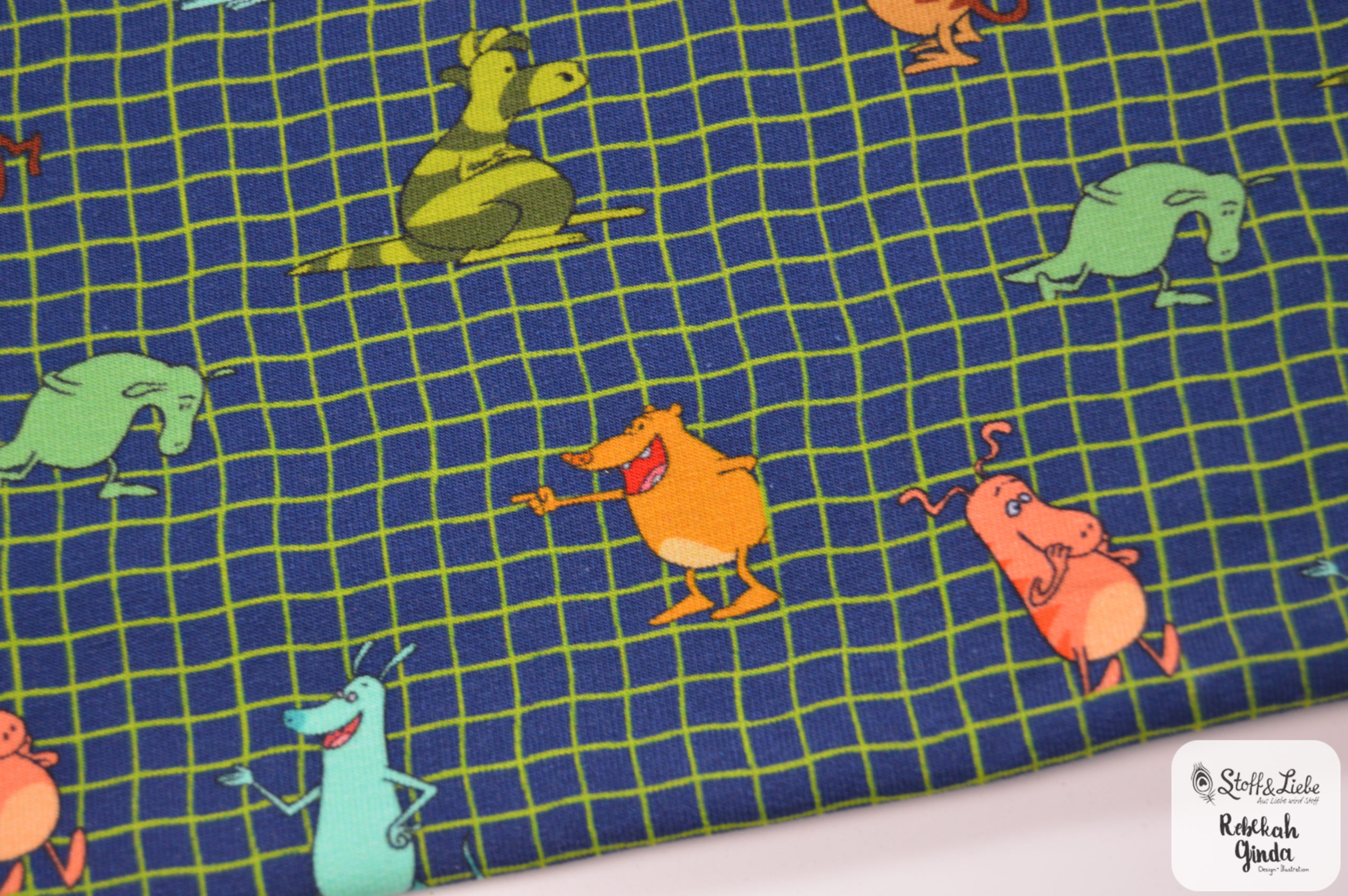 Die Muklas haben es sich auf unserem Kombistoff „Muklas Pläd“ gemütlich gemacht. Hinterlegt mit einem Gitterdesign, ist der Stoff nicht nur süß, sondern auch lässig und prima geeignet für allerlei Outfits. Wir sehen schon jede Menge Shirts, Hoodies und lässige Hosen vor uns. Aber auch Kleider und Röcke können wir uns richtig gut vorstellen. Der Grundton des Allovers ist ein tolles Nachtblau.