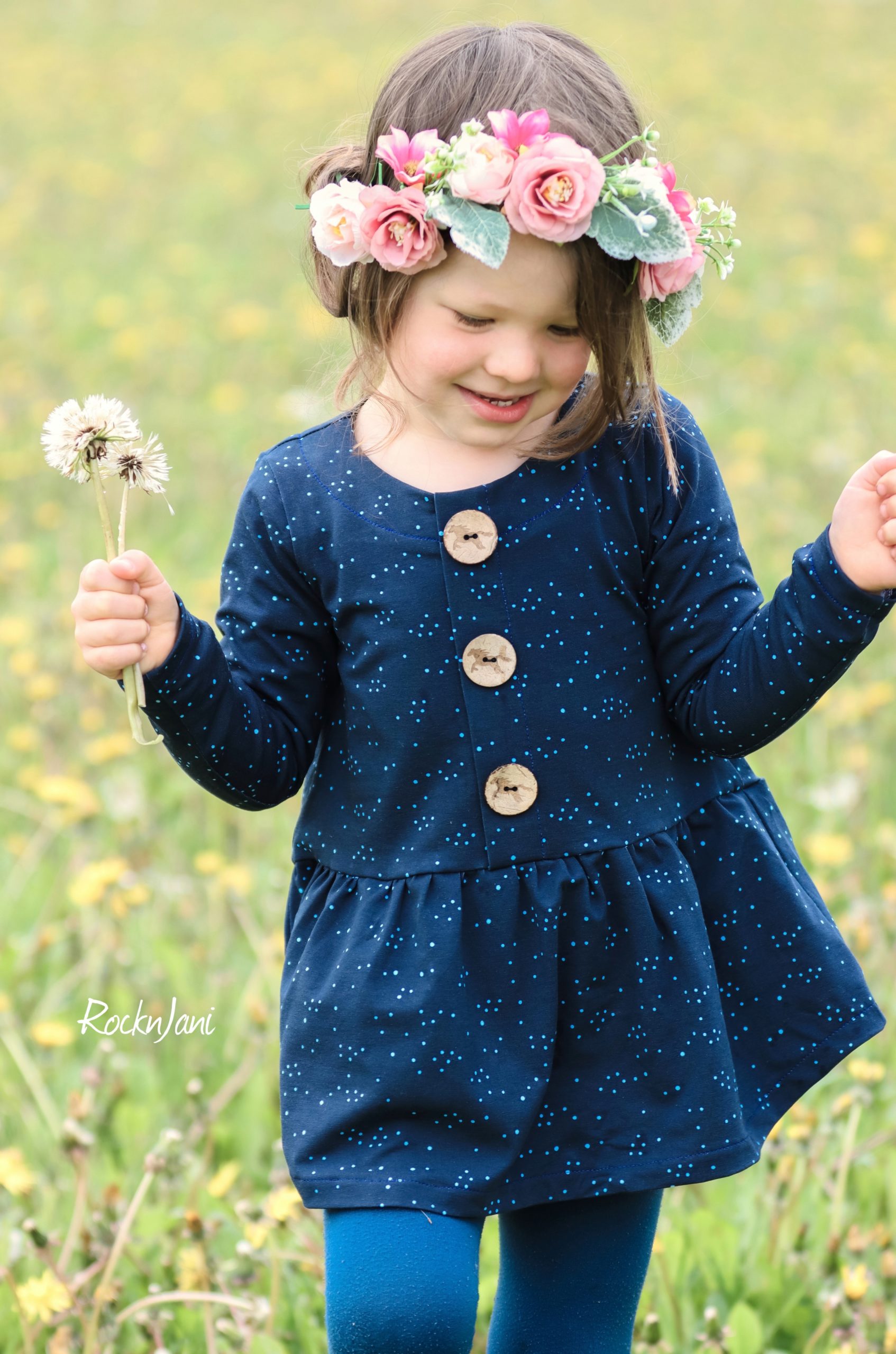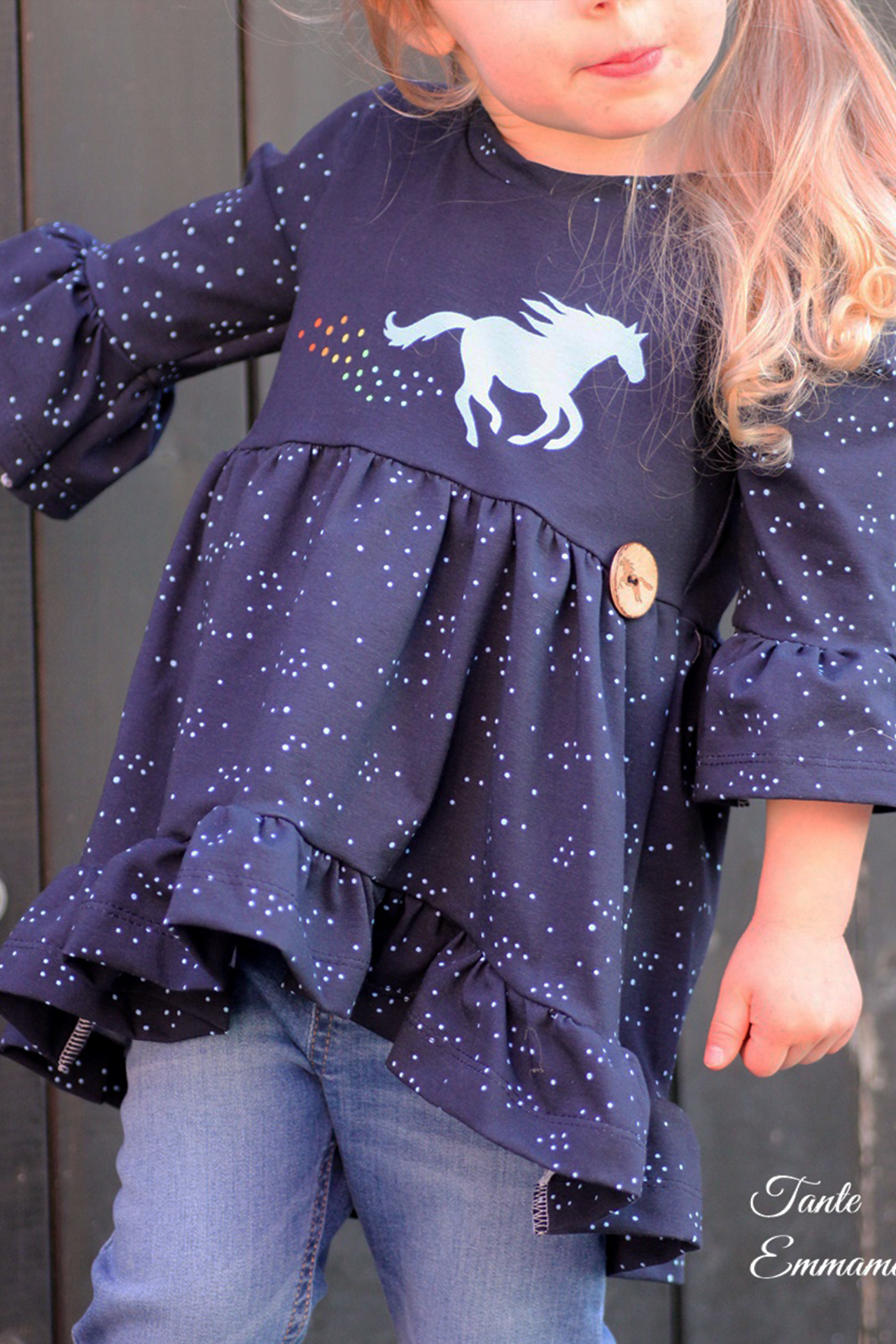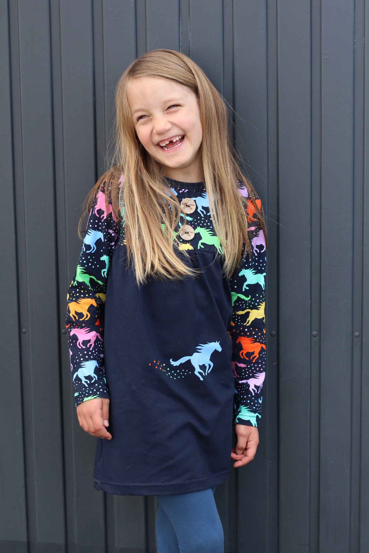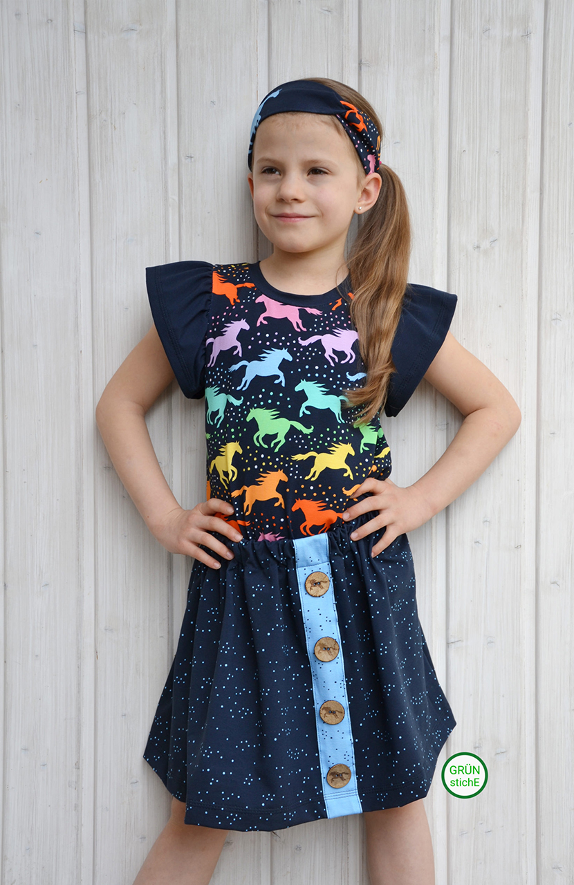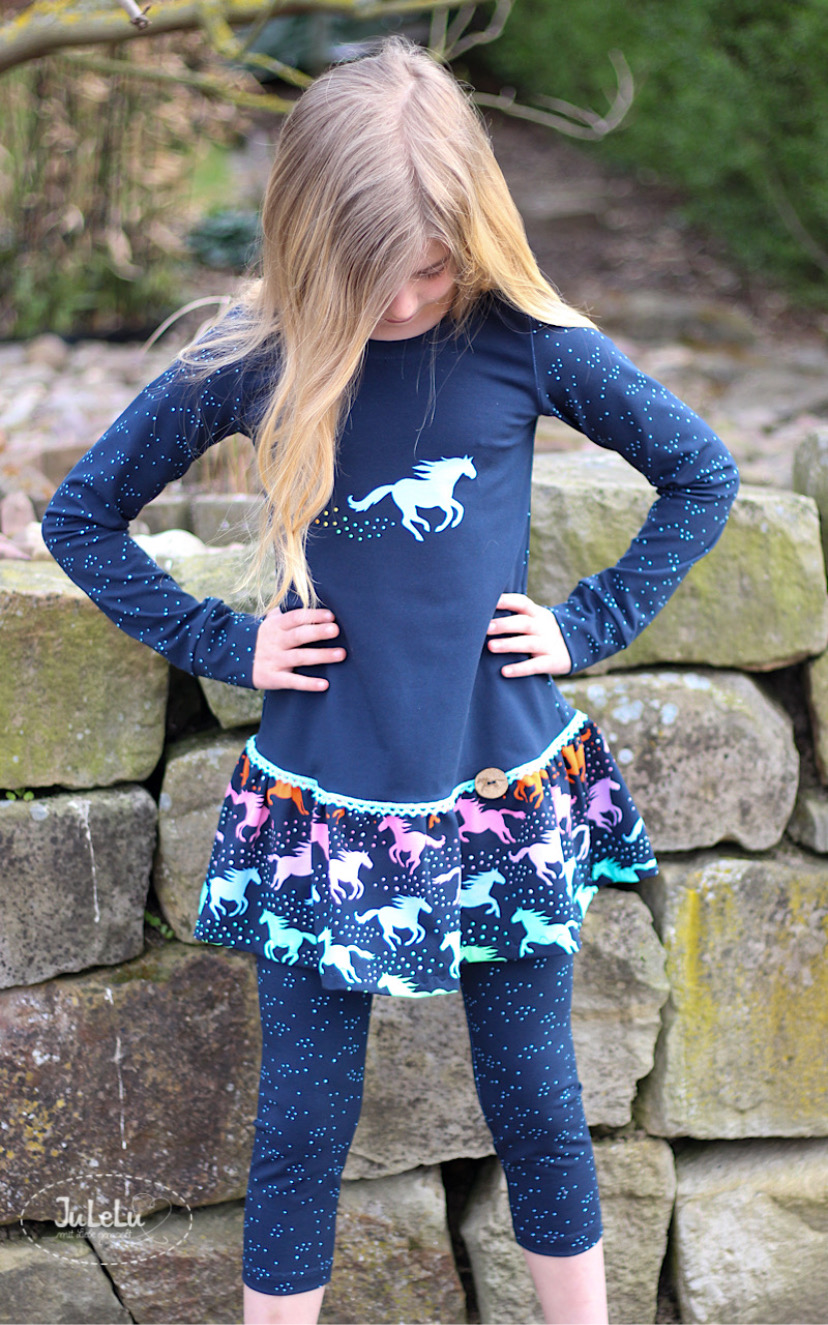 Sehr schönes Regenbogenstöffchen – ich liebe Farbverläufe!😉 Könnt Ihr vielleicht verraten, welchen Schnitt Julelu für das Kleid/die Tunika verwendet hat?