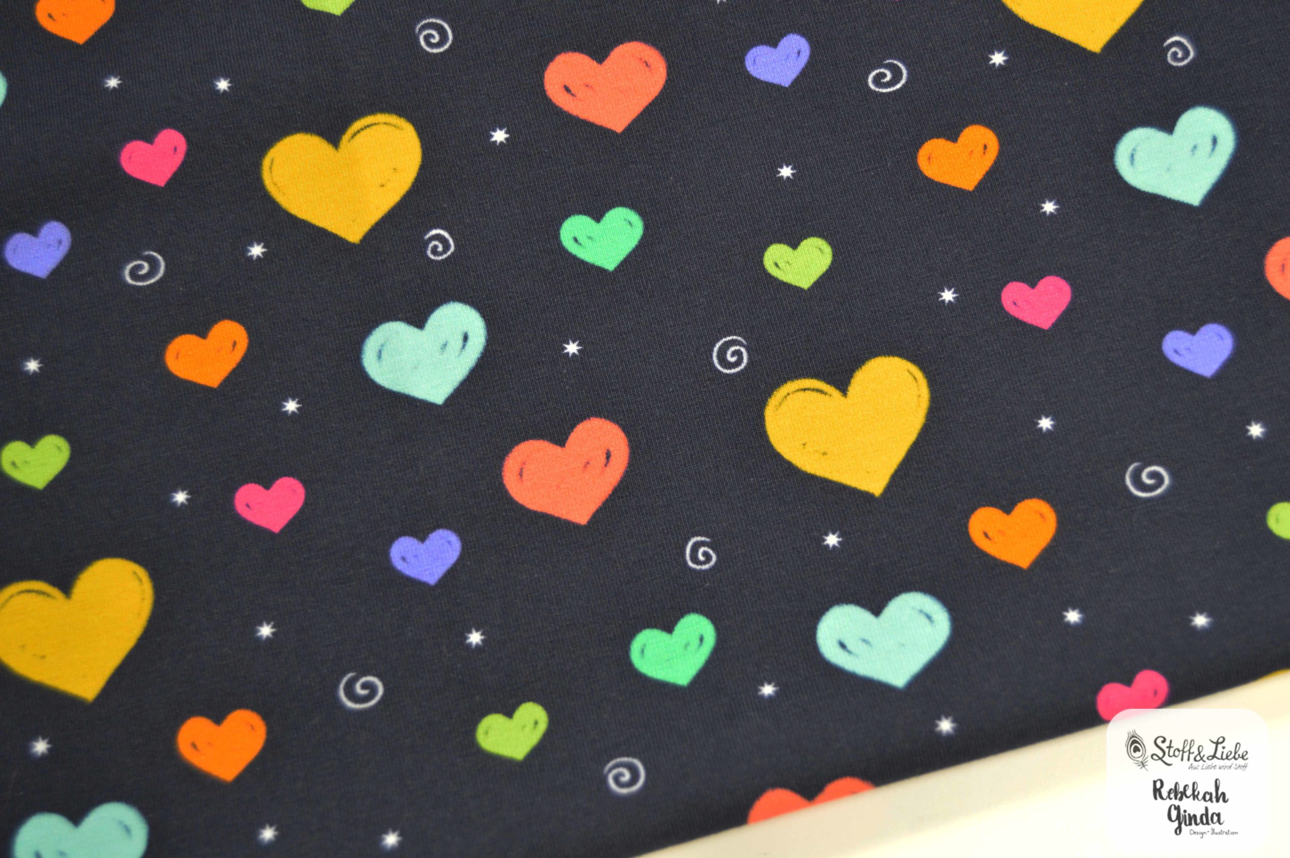 Neu dabei und einfach zauberhaft sind die Flying Hearts! Bunte Herzen in unterschiedlichen Größen, kombiniert mit Kringeln und Sternen auf schwarzblauem Hintergrund, machen diesen Stoff zum totalen Hingucker.