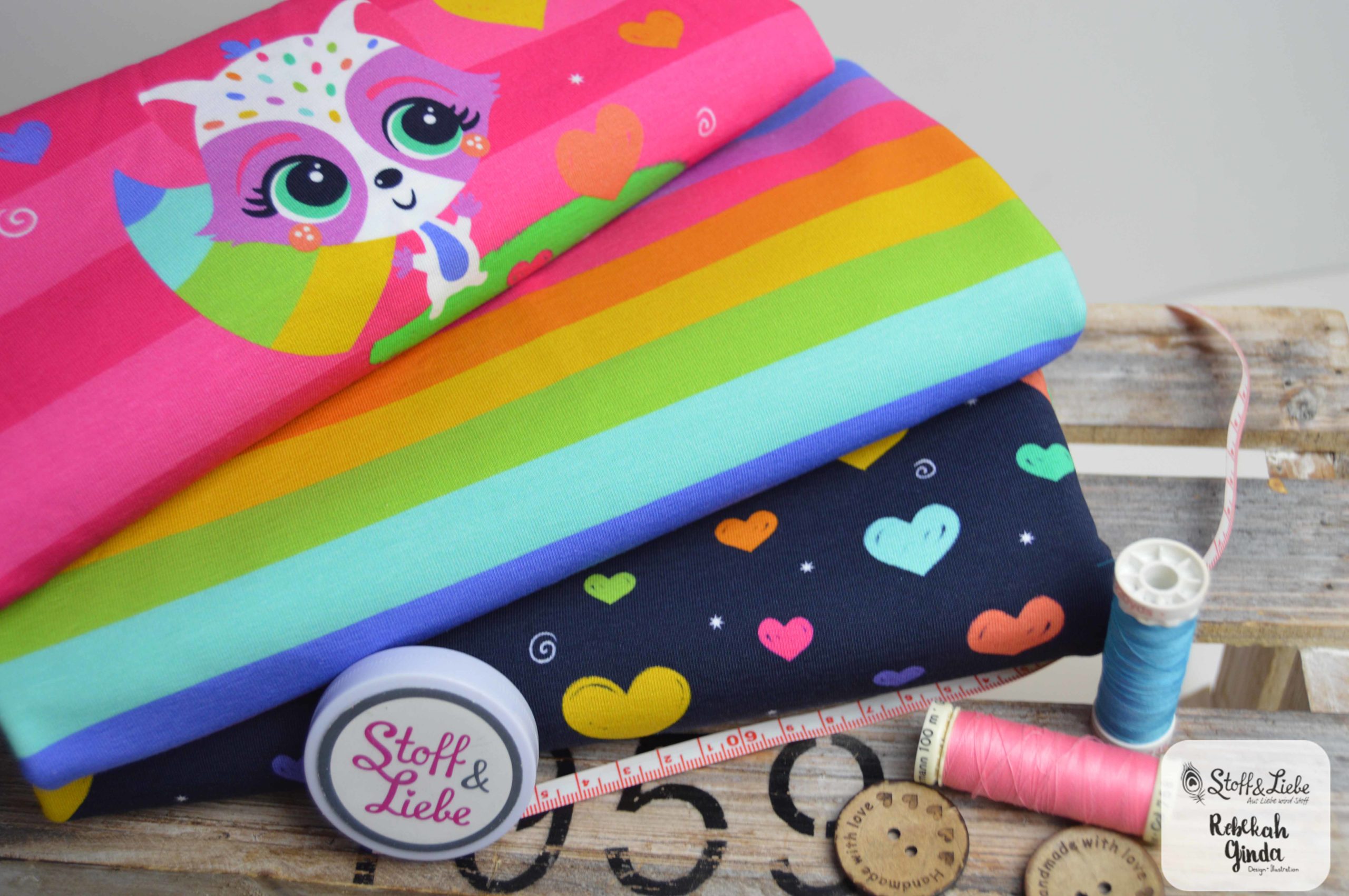 Die Kollektion besteht aus einem Panel und zwei Kombistoffen. Alle Stoffe erhaltet Ihr auf Jersey mit einer Materialzusammensetzung von 95 % Baumwolle und 5 % Elasthan. Das Design stammt aus der Feder von Rebekah Ginda.
