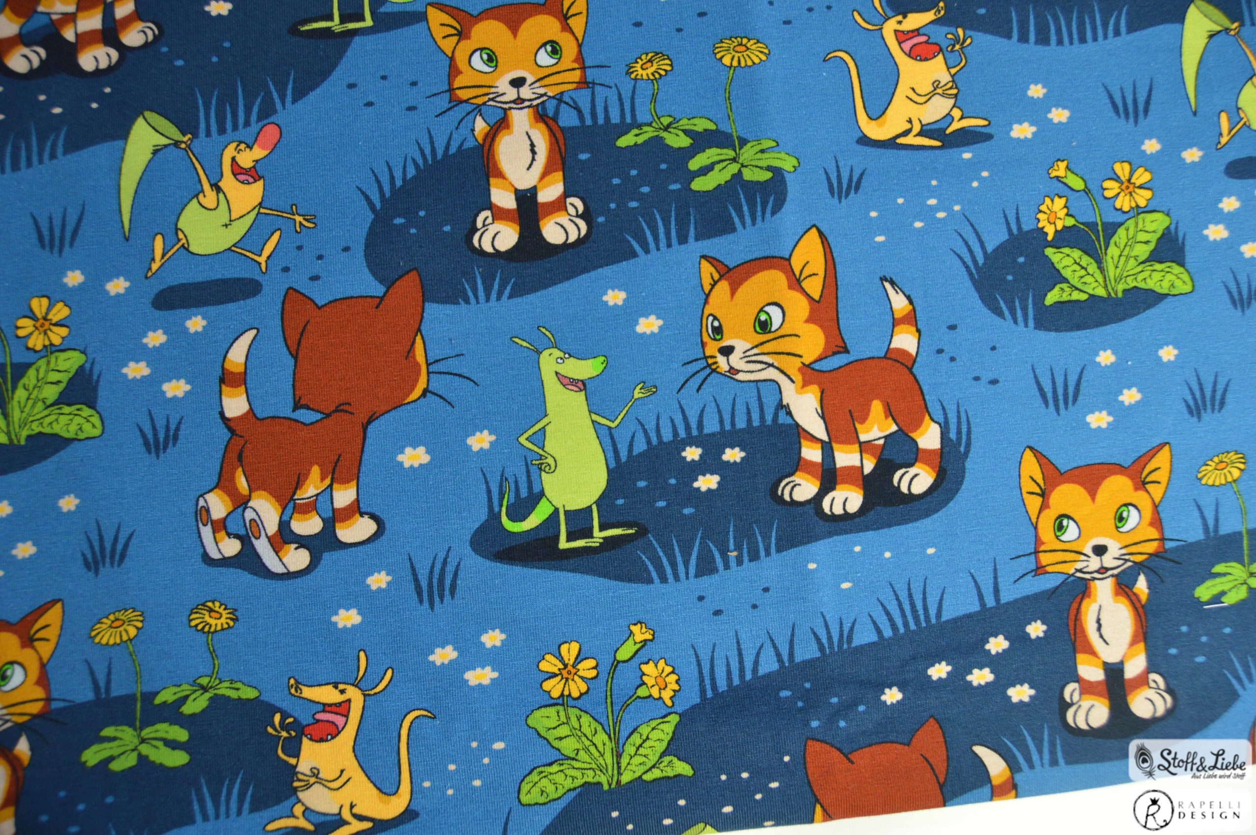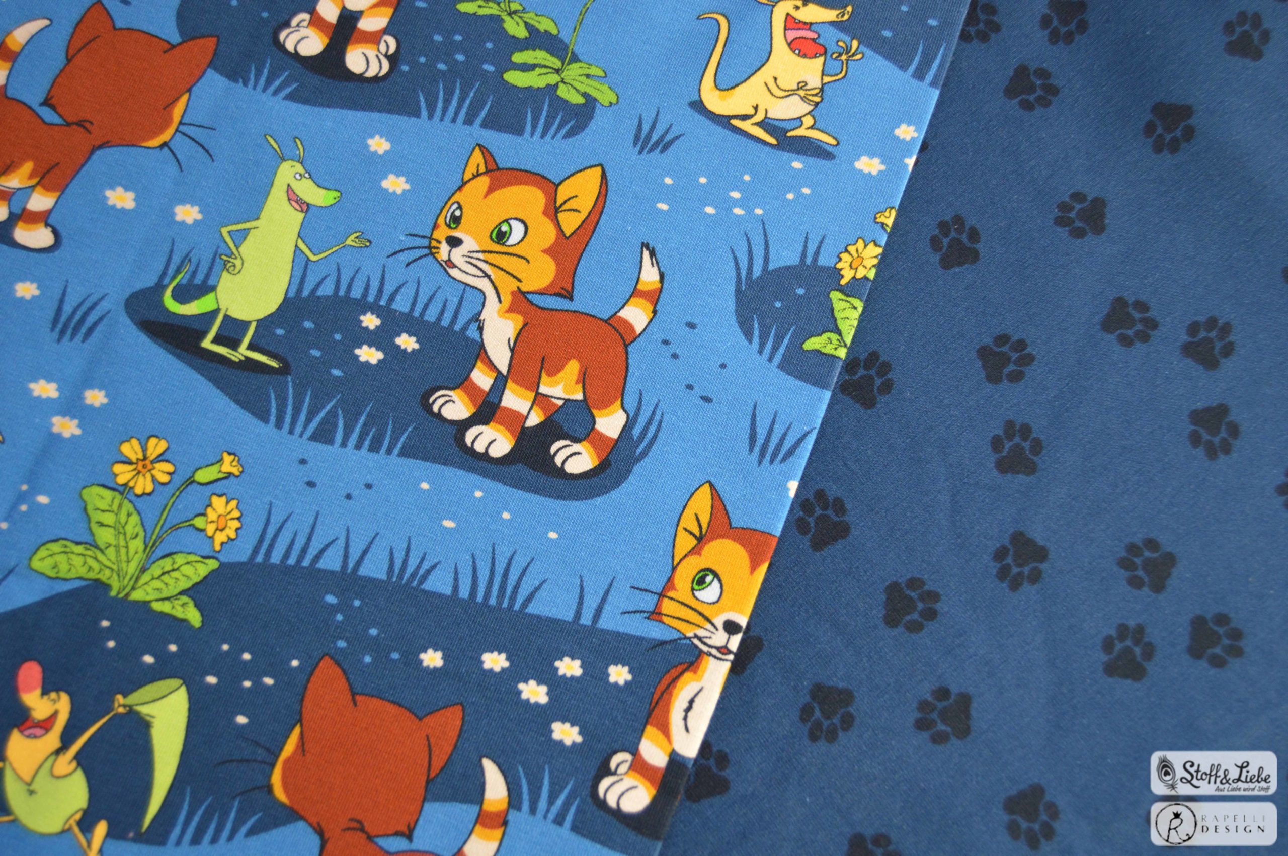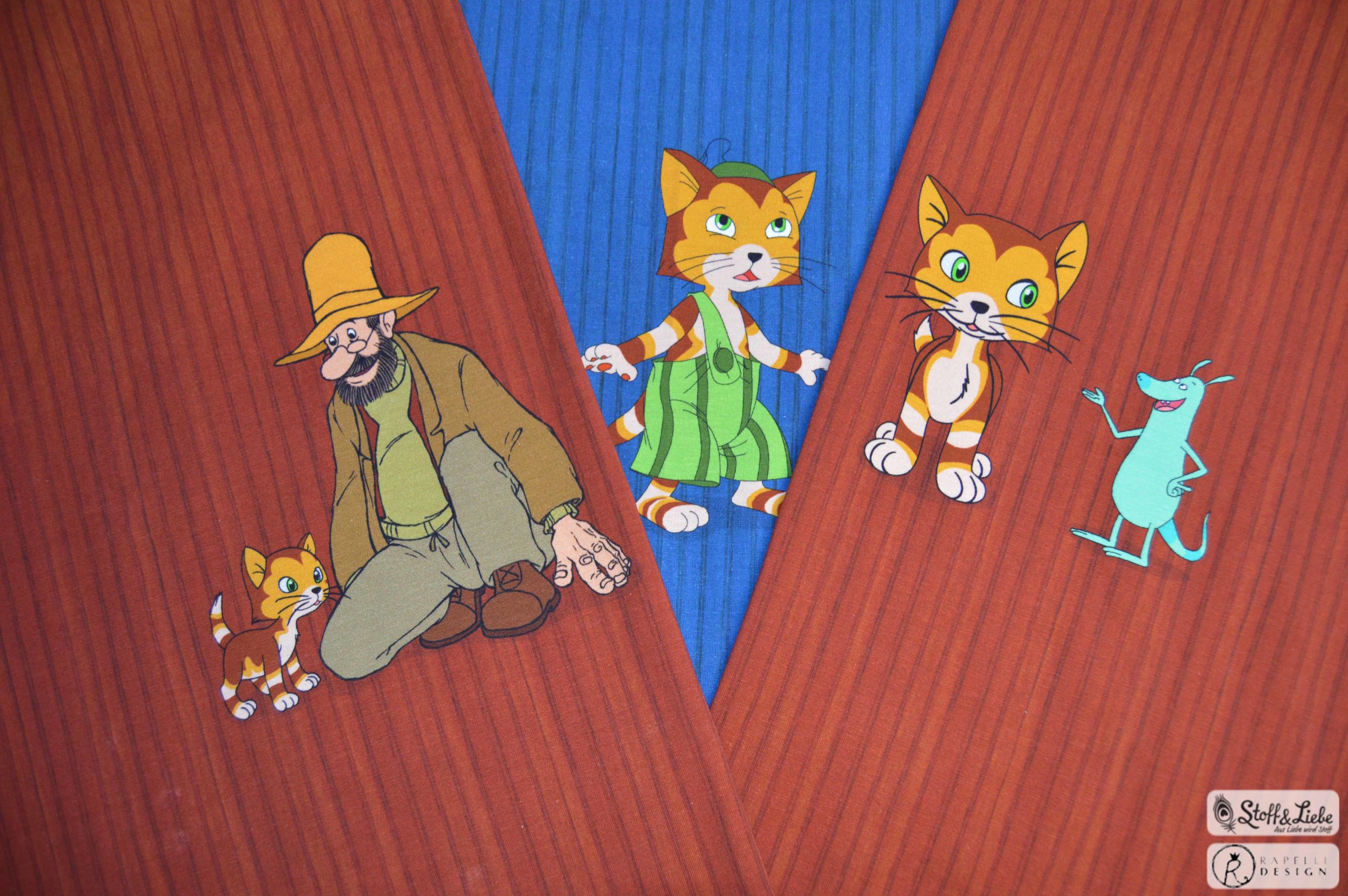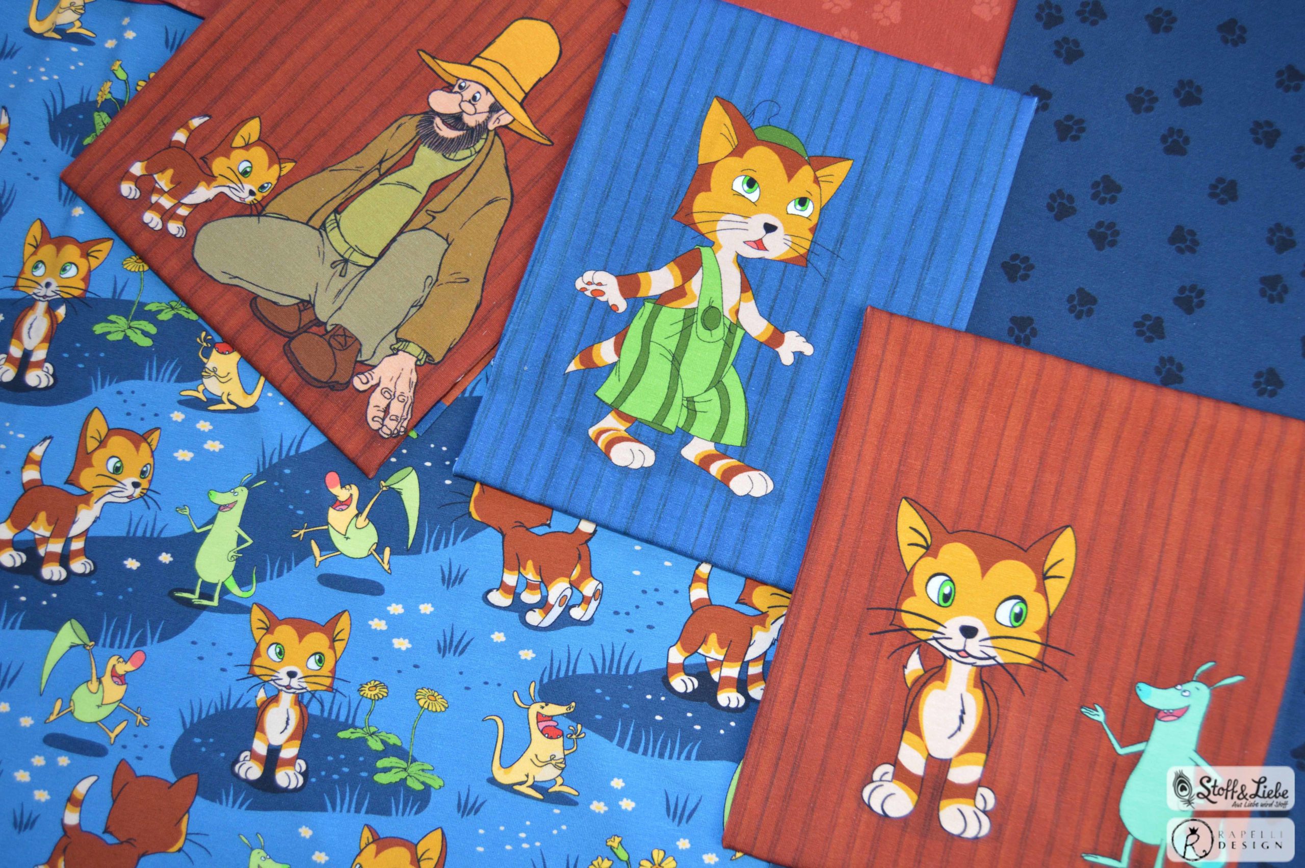 Beim Hauptstoff „Findus klein“ im Alloverdesign wurden die Motive um ca. 50% vergrößert. Diesmal ist der Allover in Blautönen gehalten und ist durch die Farbvielfalt im Design klasse kombinierbar. Hier können wir Euch aus unserer Pamuklinie zum Beispiel 260 Senf, 019 Polizeiblau, 435 Kastanie und 300 Dunkelkiwi empfehlen.