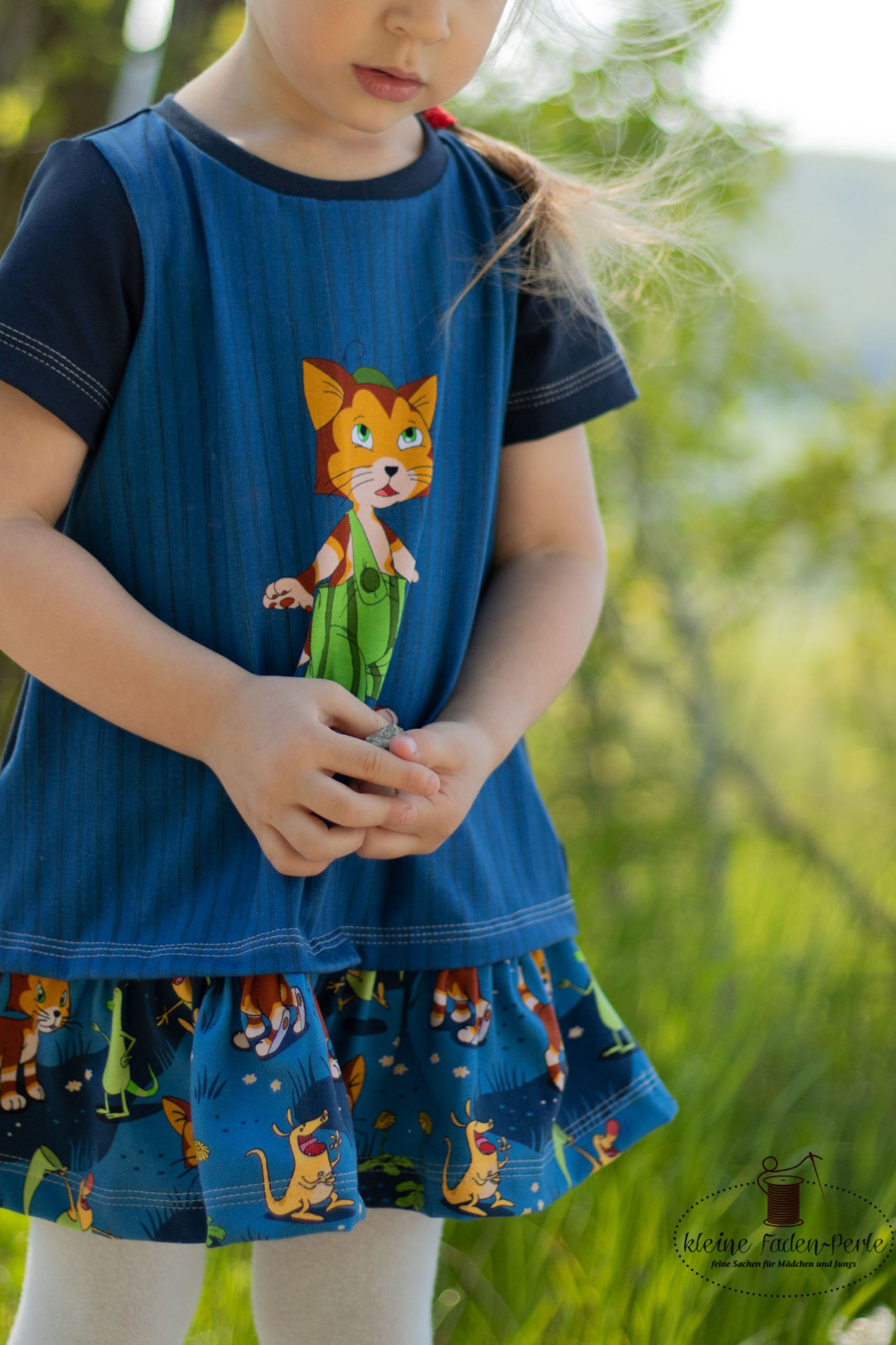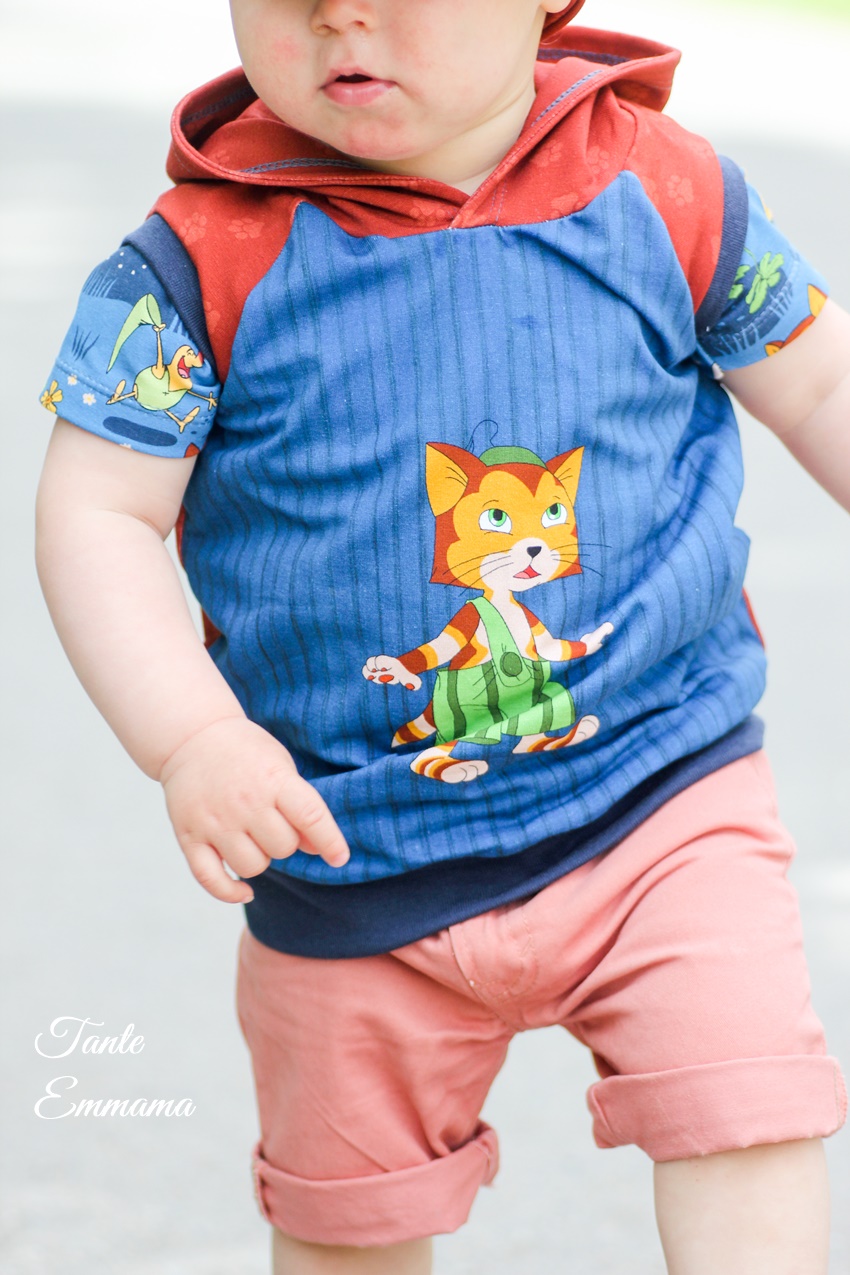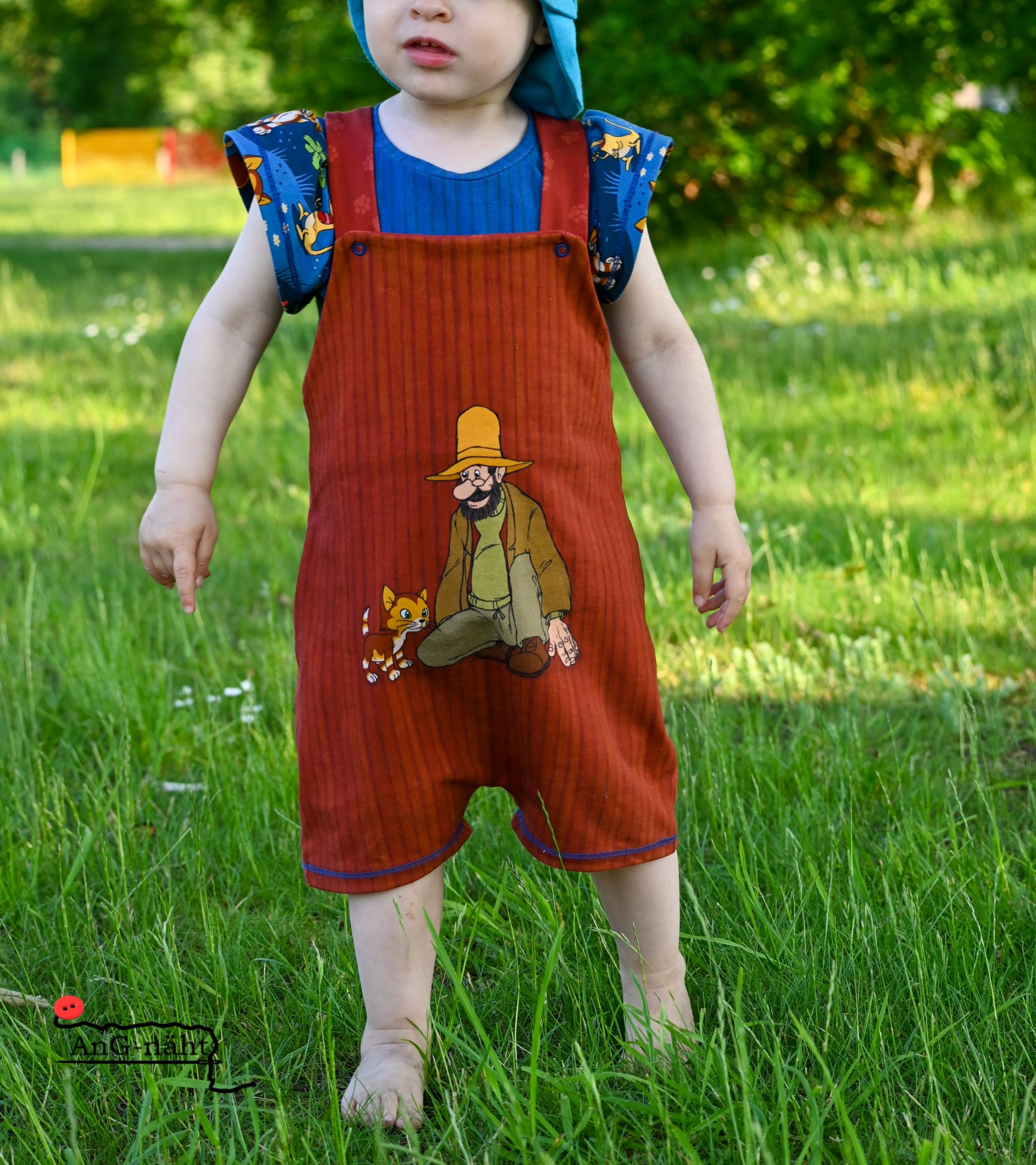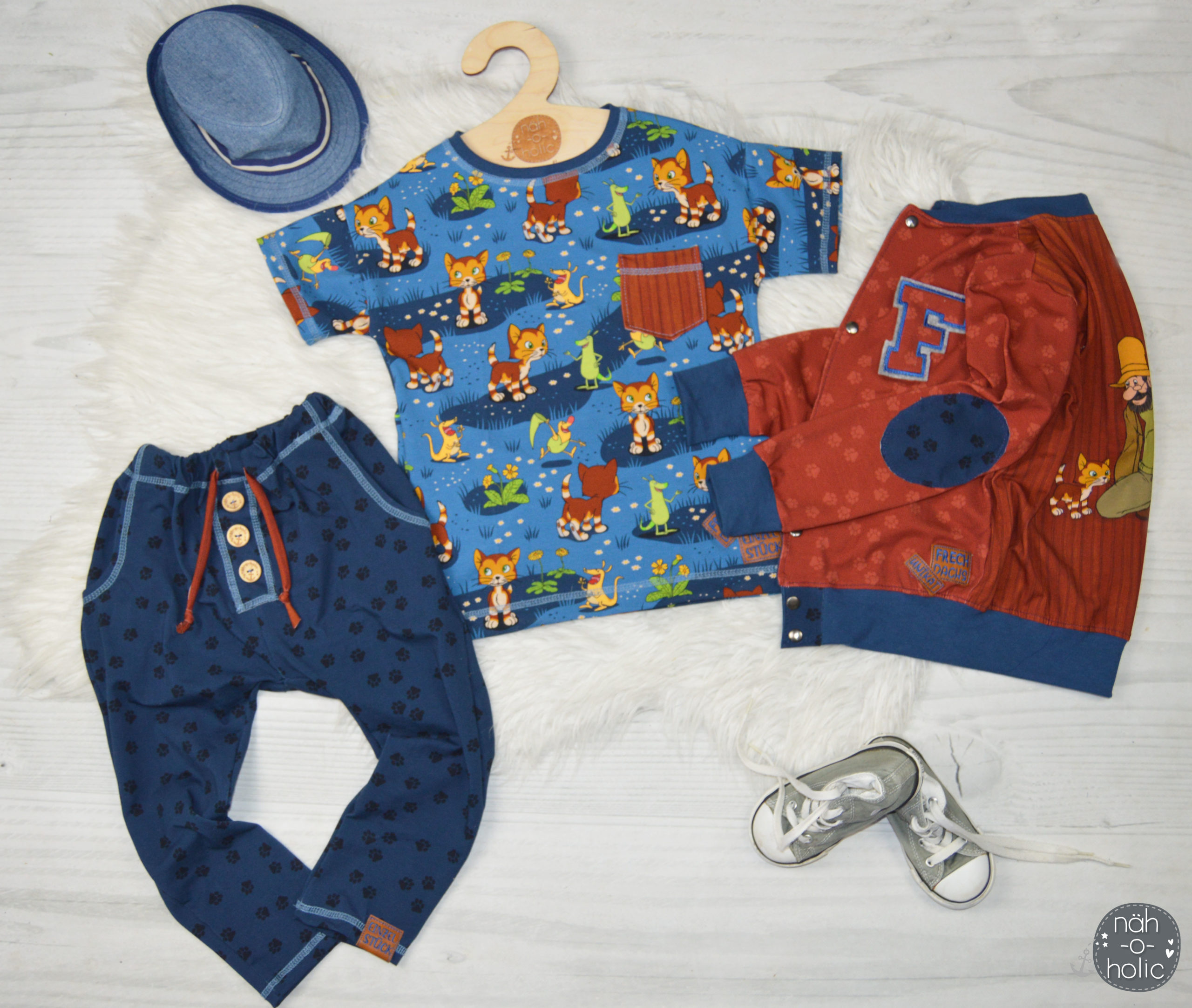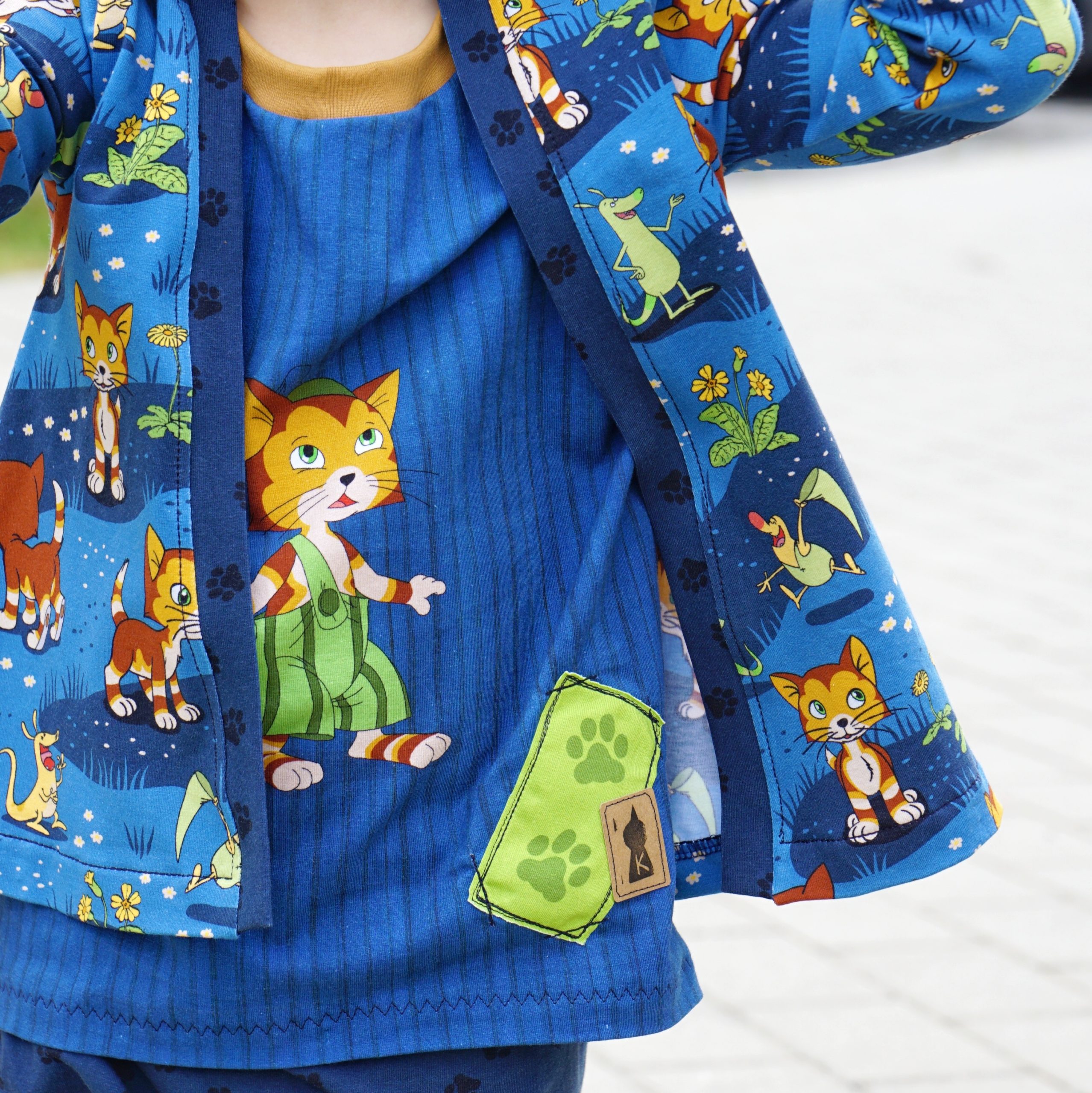 Beim Hauptstoff „Findus klein“ im Alloverdesign wurden die Motive um ca. 50% vergrößert. Diesmal ist der Allover in Blautönen gehalten und ist durch die Farbvielfalt im Design klasse kombinierbar. Hier können wir Euch aus unserer Pamuklinie zum Beispiel 260 Senf, 019 Polizeiblau, 435 Kastanie und 300 Dunkelkiwi empfehlen.