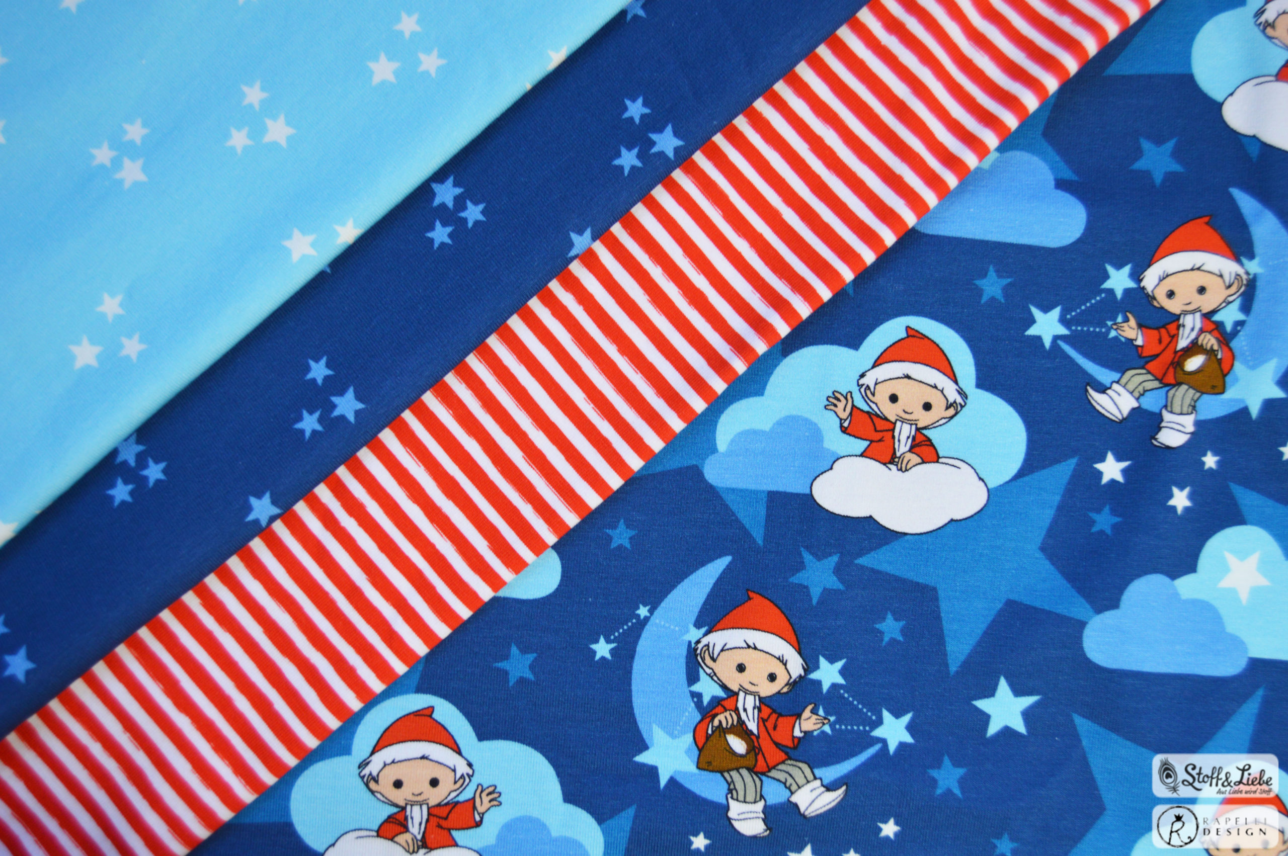 „Unser Sandmännchen – Süße Träume“ in Abendblau macht den Anfang. Hier haben wir für Euch den Sandmann als Allover in wunderschönen Blautönen. Passend dazu wird es die Classix Sterne in Himmelblau und Abendblau geben. Außerdem die Maccaronies in Fliegenpilzrot. Sie sind nahezu identisch zu den Maccaronies, die Ihr aus der Kollektion „Der kleine Maulwurf – Halli Galli“ kennt.