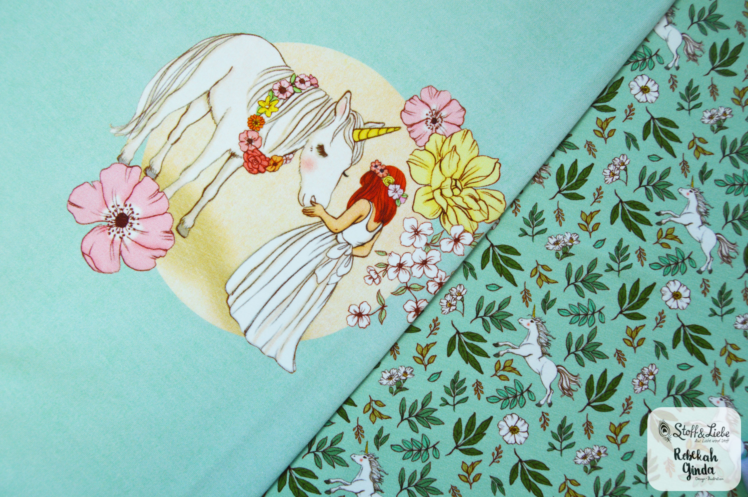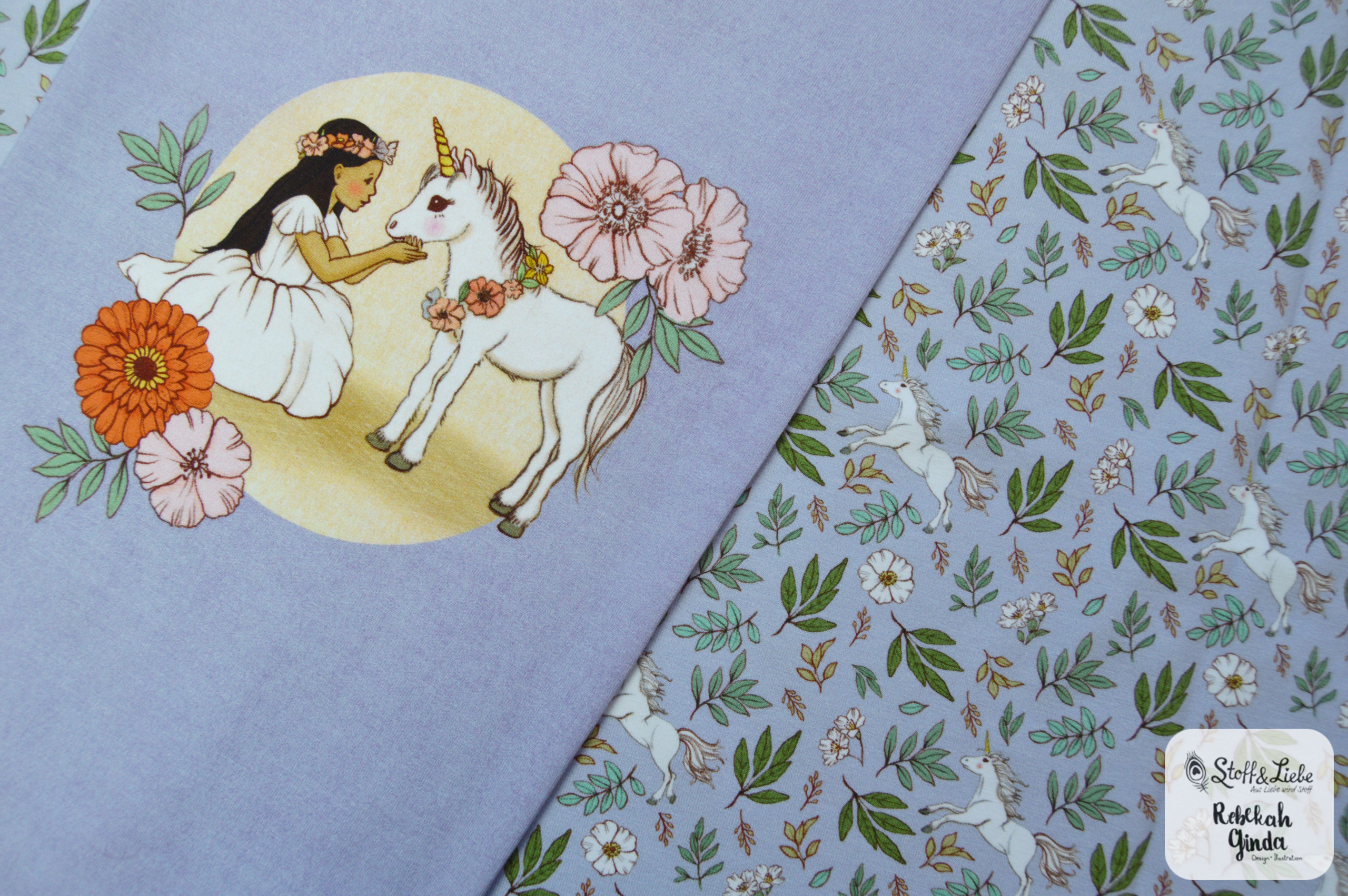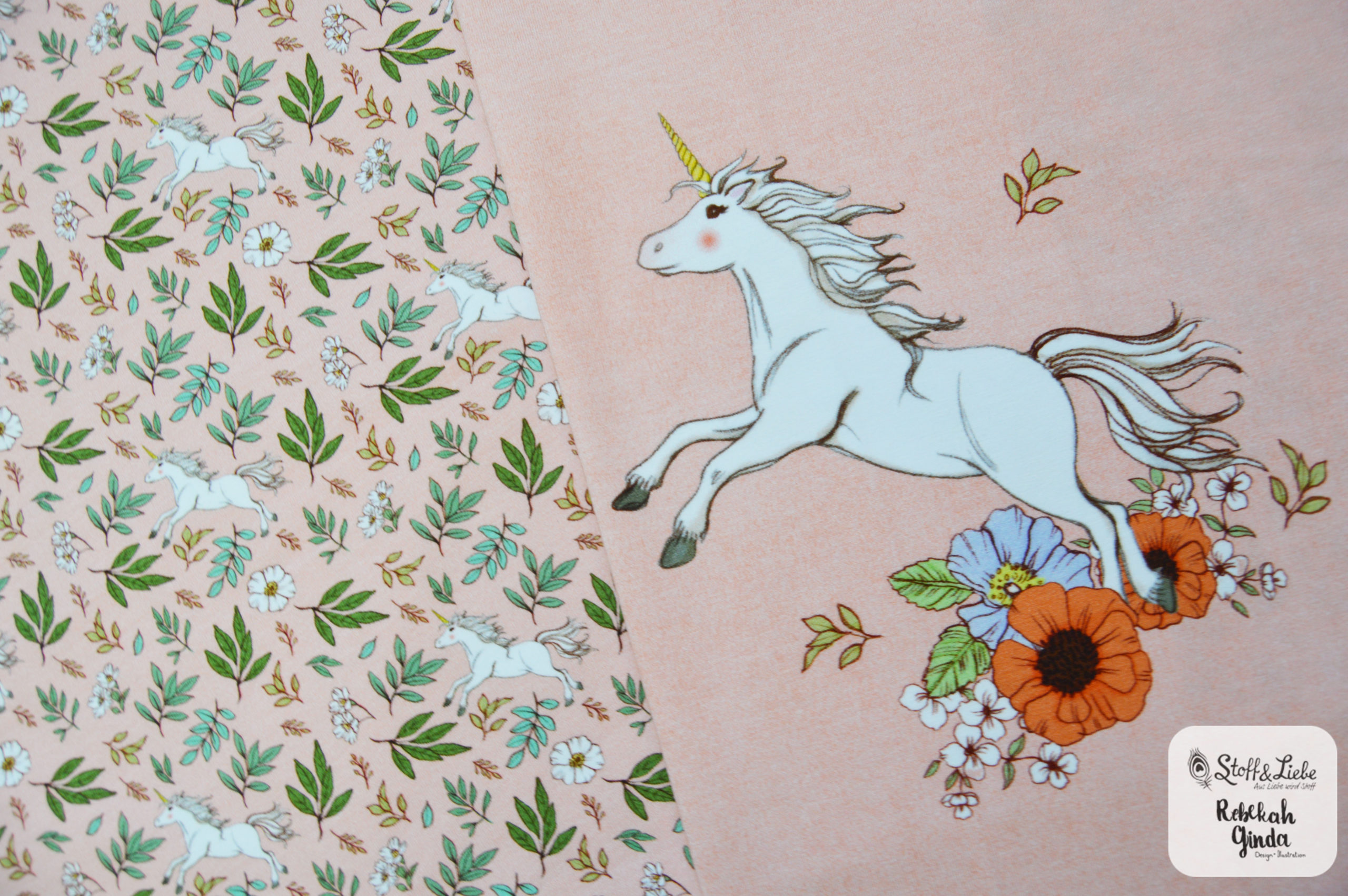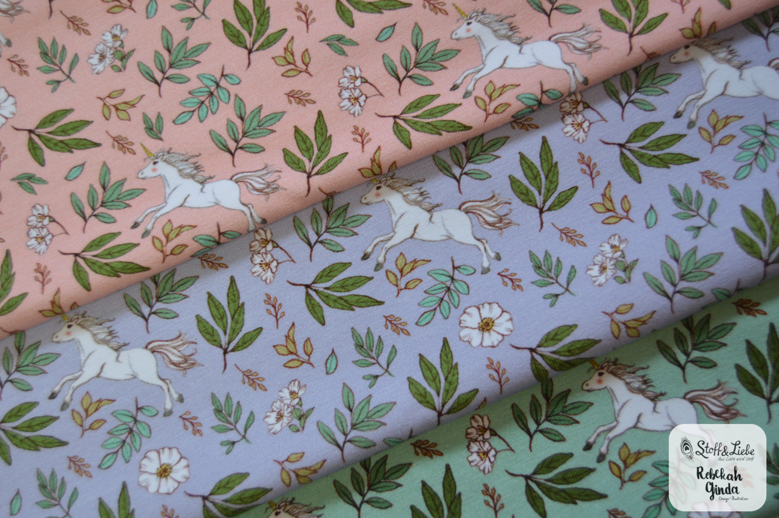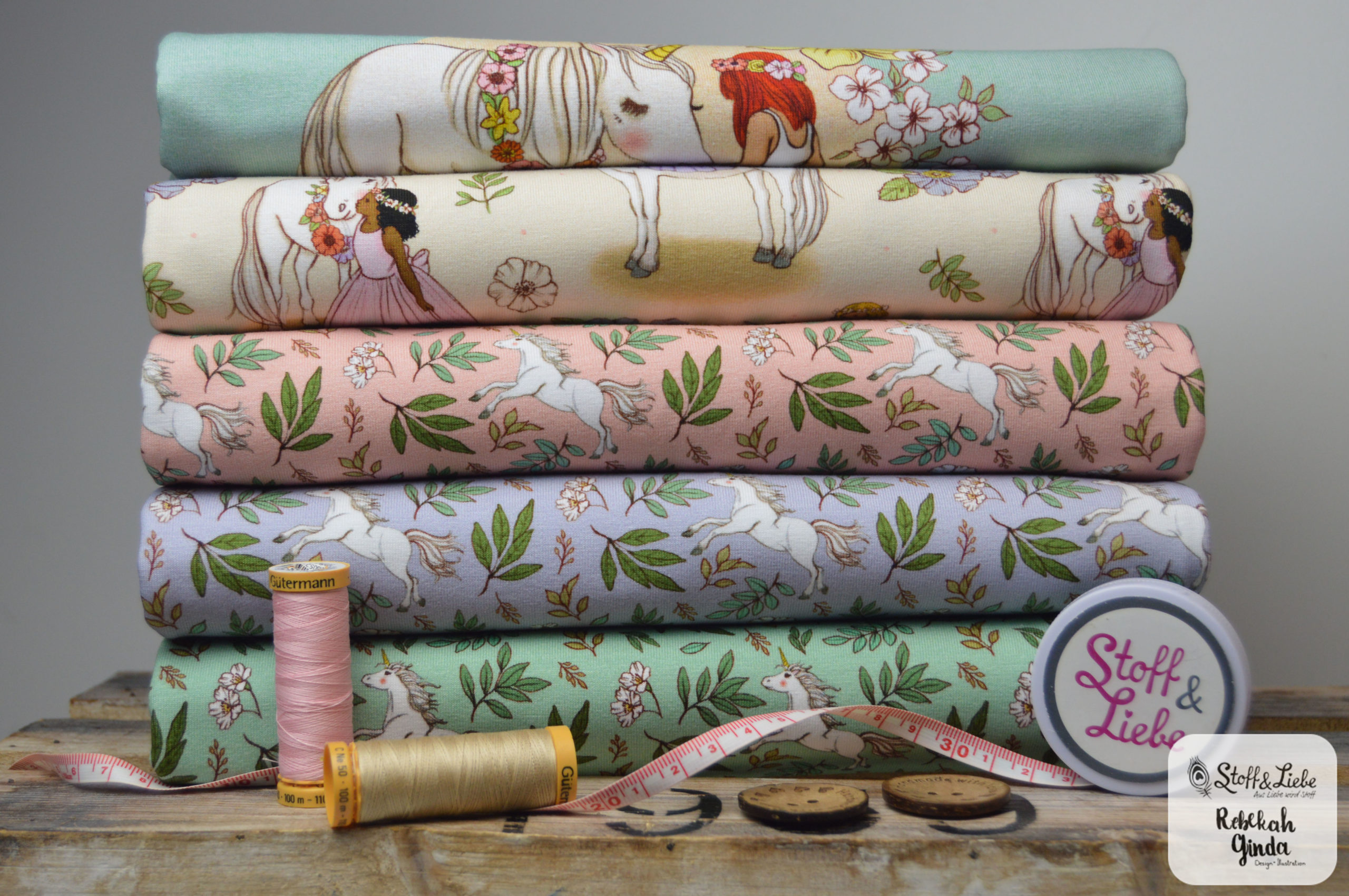 Unser Belle & Boo Unicorn Kollektion aus der Feder von Rebekah Ginda  hält ein Panel, einen Hauptstoff und drei Kombistoffe für Euch bereit.  Alle Stoffe erscheinen auf Jersey und haben eine Materialzusammensetzung von 95 % Baumwolle und 5 % Elasthan.