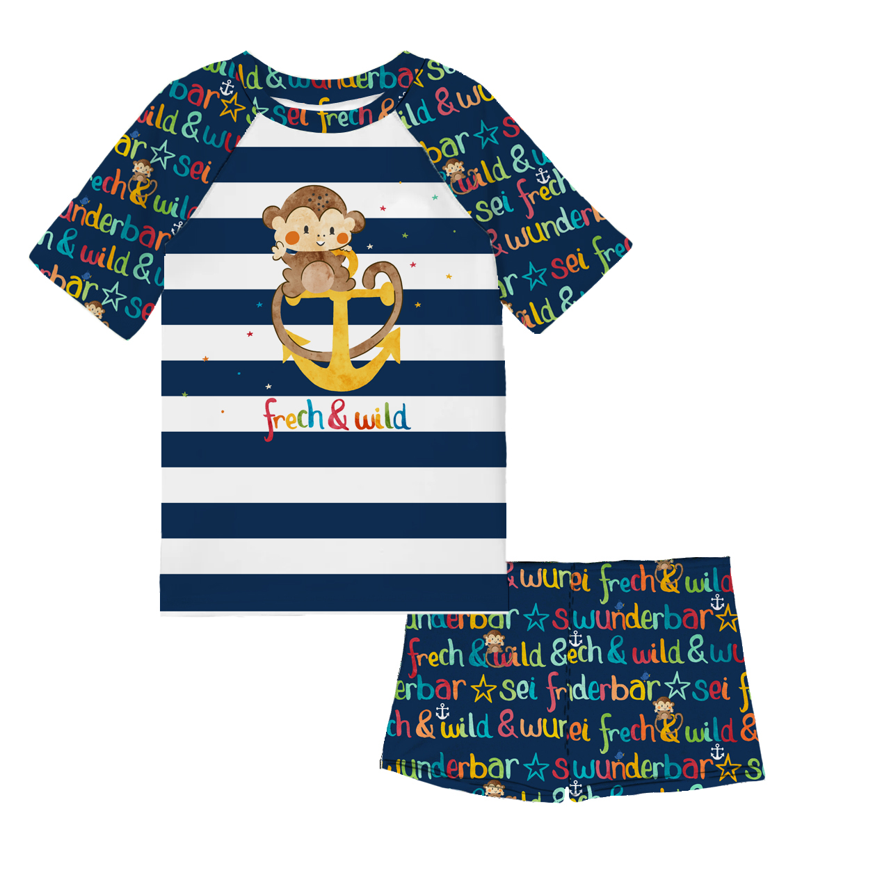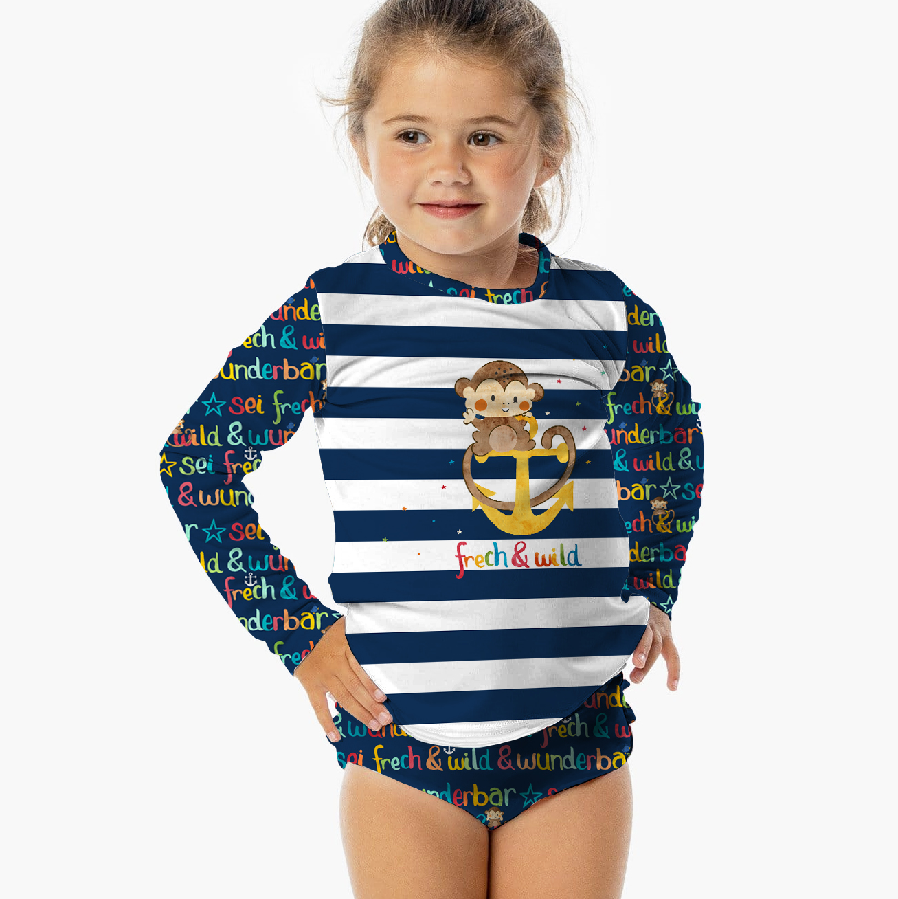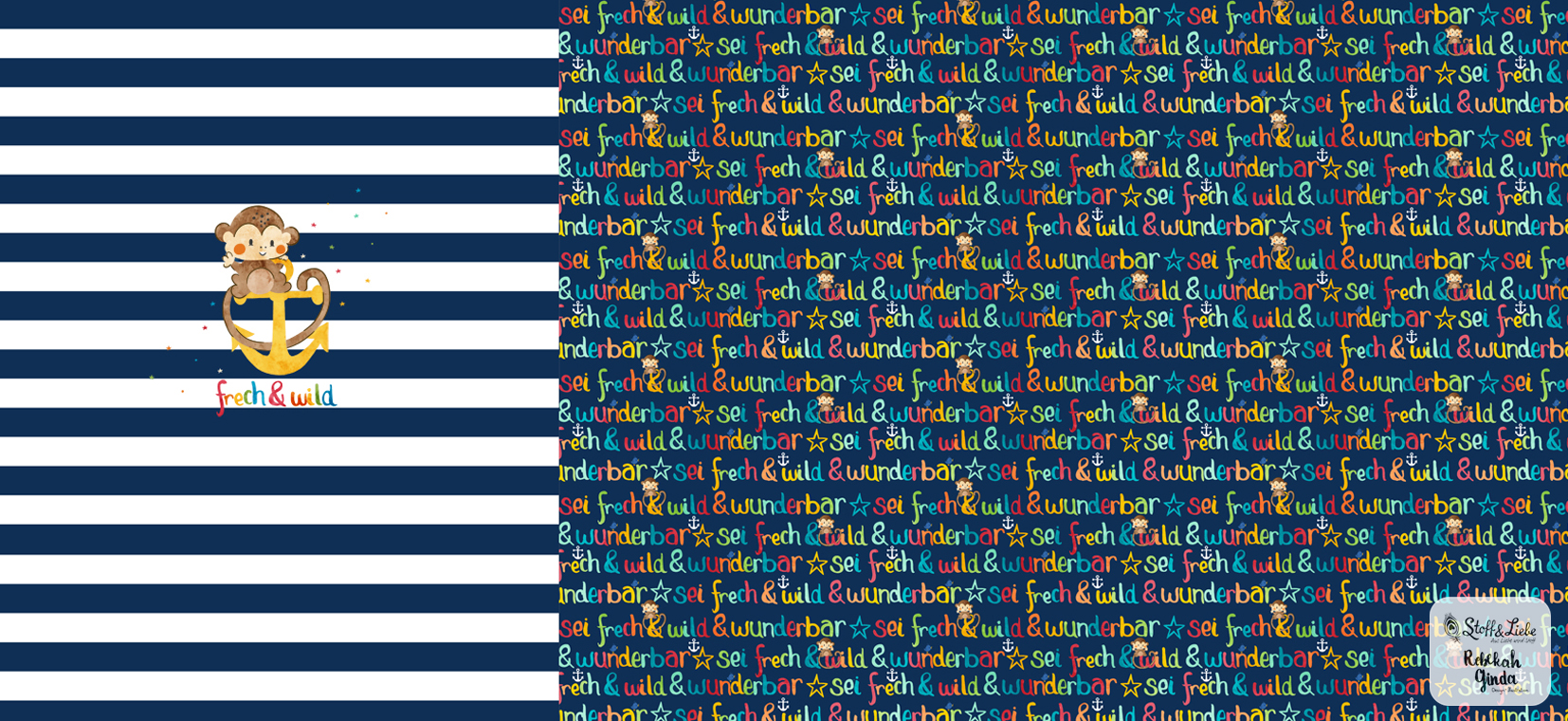 Hier erwartet Euch in Panel  in einer 1/3 zu 2/3 Aufteilung. Auf dem ersten Teil findet Ihr das zuckersüße Äffchen auf einem Anker mit Blockstreifen im Hintergrund. Der zweite Teil beinhaltet den beliebten „Frech & wild“ Allover auf Dunkelblau. Somit habt Ihr direkt zwei tolle Designs auf einem Panel. Jeder Teil kann ganz wunderbar einzeln vernäht oder eben aber auch toll kombiniert werden.