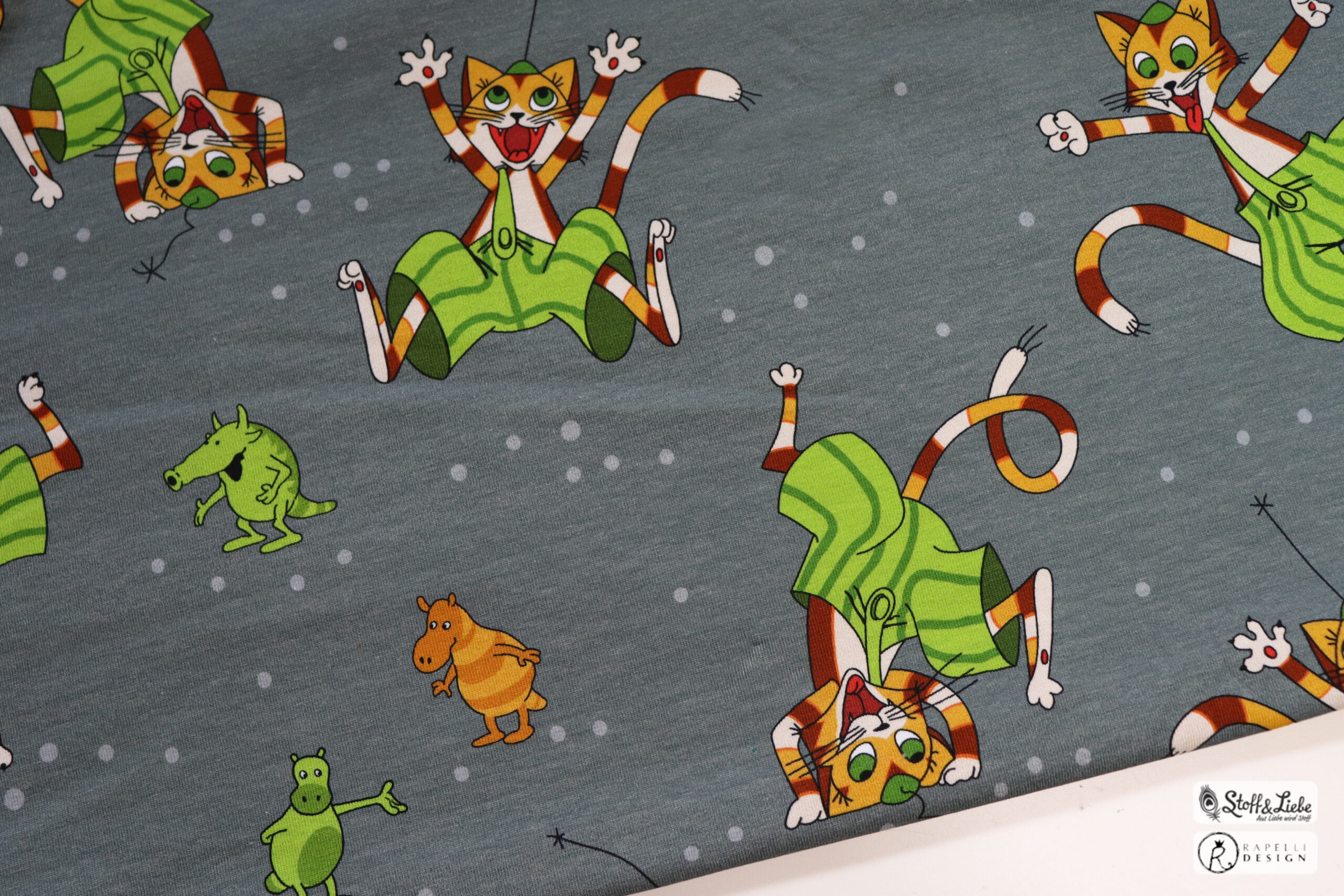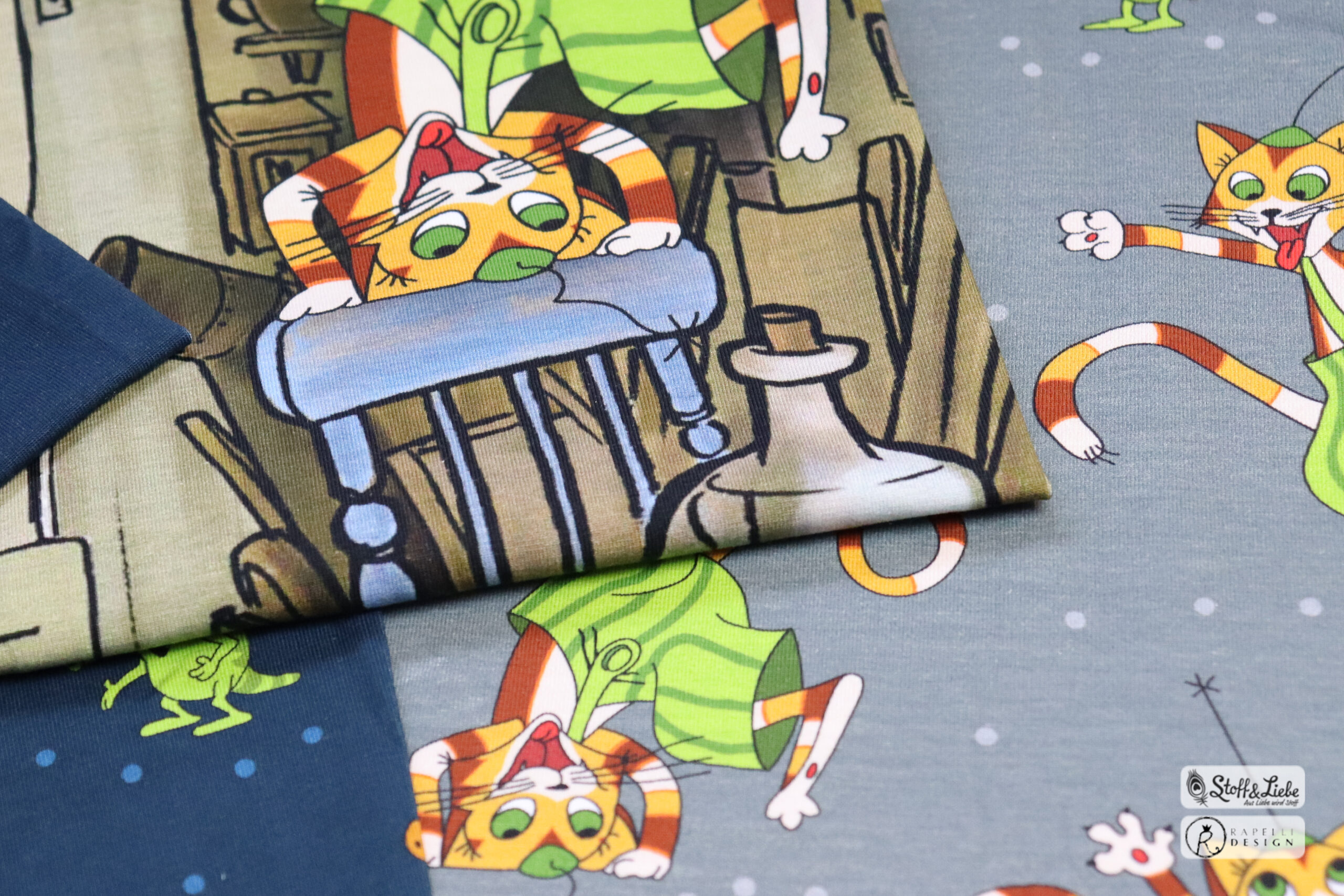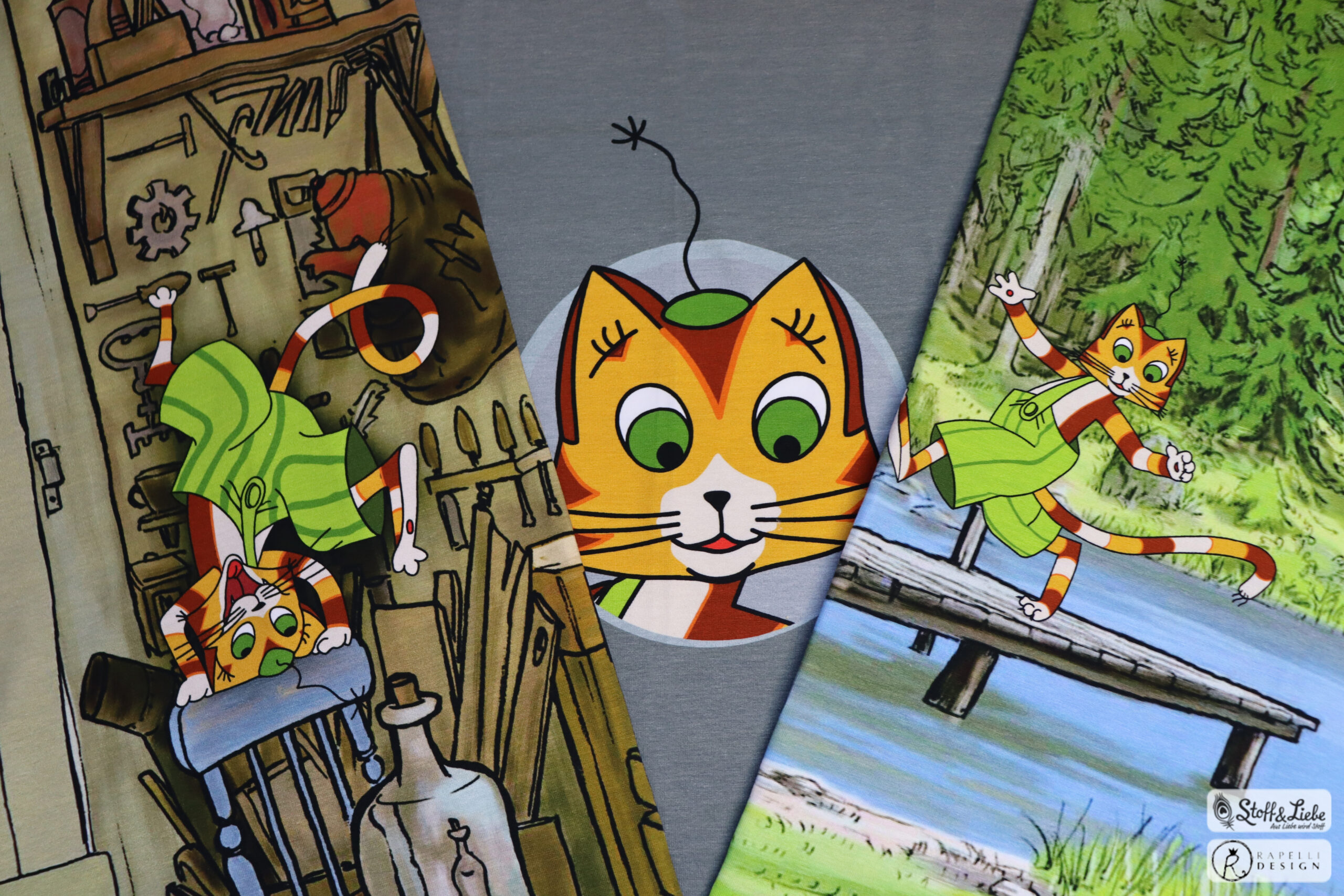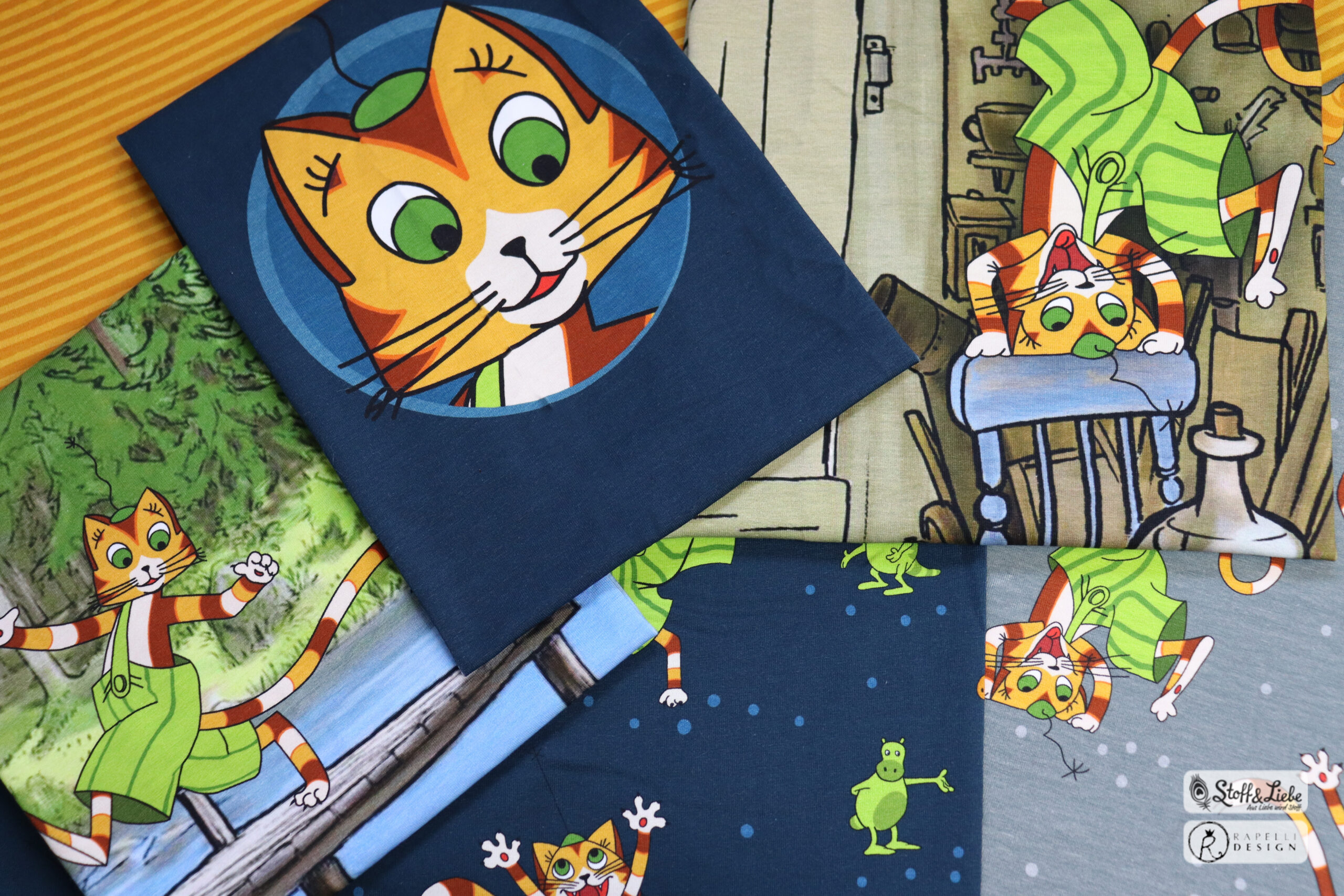 Unsere „Hurra Findus“ Kollektion stammt aus der Feder von Rapelli Design und hält ein Design in zwei Farben für Euch bereit. Pro Farbstellung gibt es ein Panel, einen Hauptstoff und passend zu beiden einen passenden Kombistoff.  Die Stoffe dieser Kollektionen erscheinen auf Jersey und haben eine Materialzusammensetzung von 95 % Baumwolle und 5 % Elasthan.