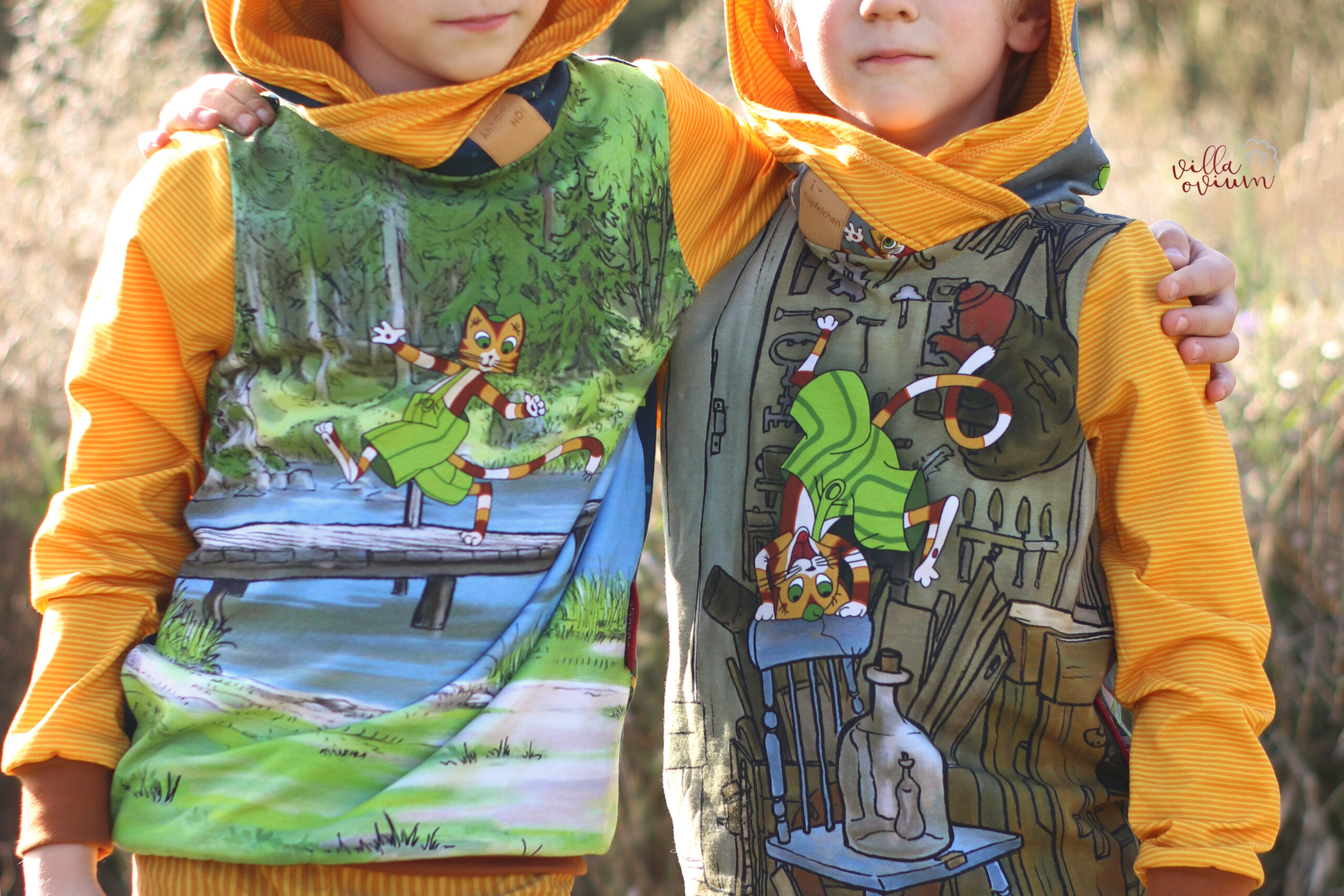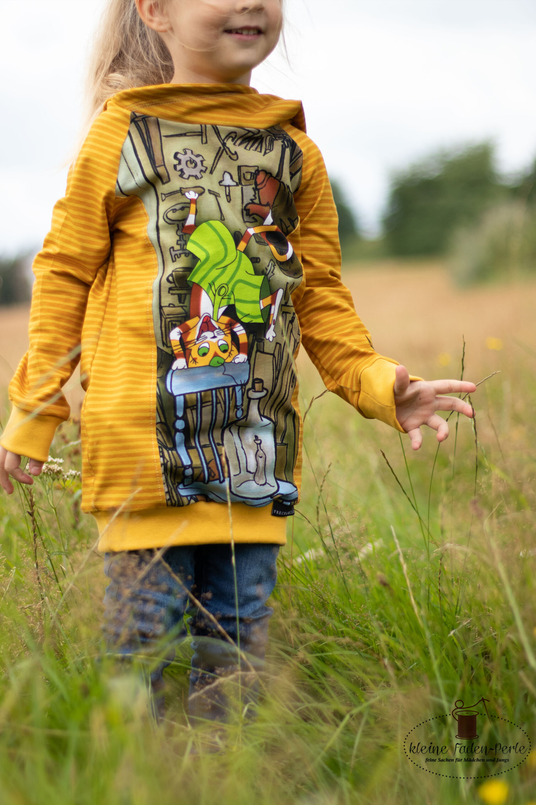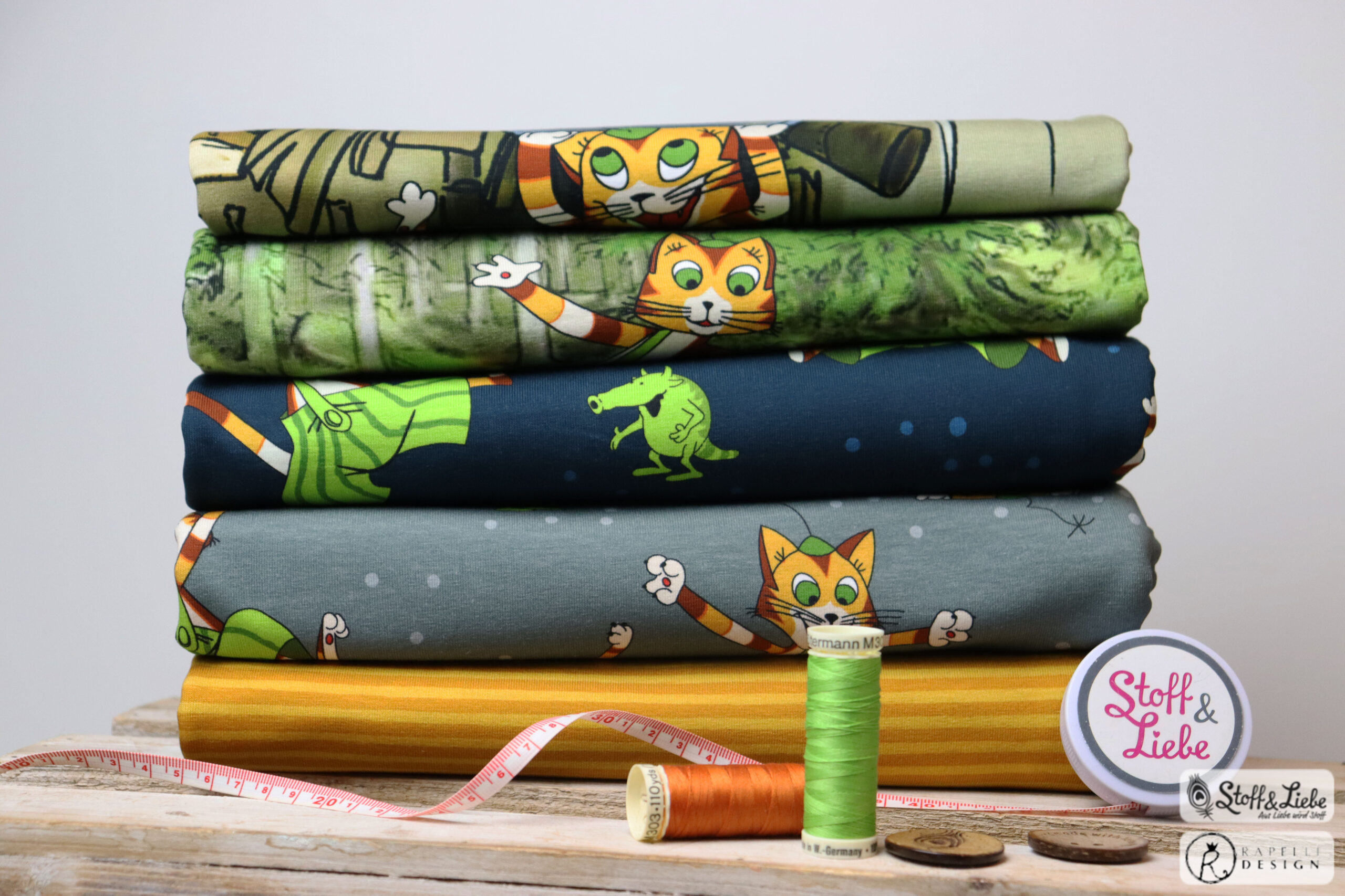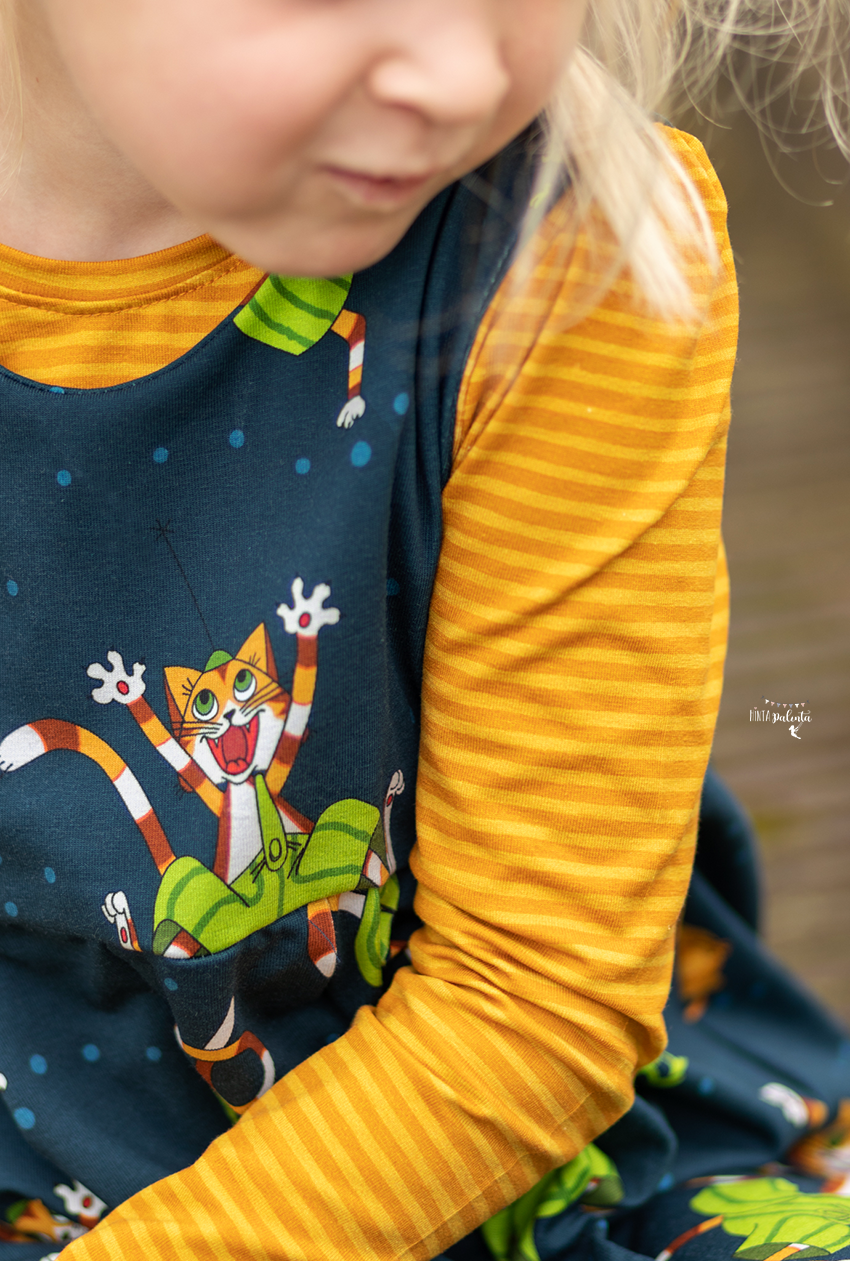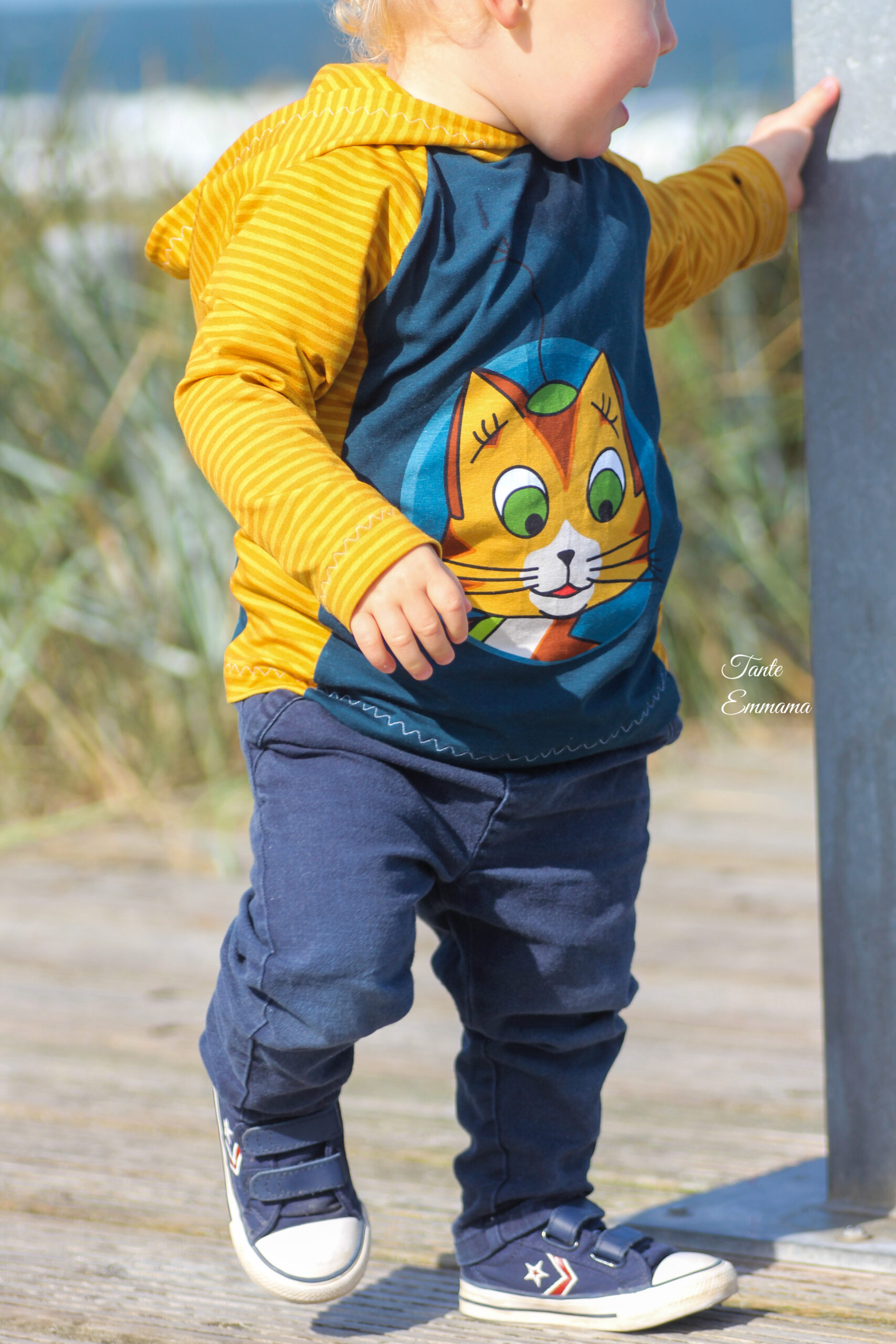 Diesmal haben wir als Kombistoff wieder unsere Maccaronies für Euch und zwar in der Farbe Honig, die perfekt zum kleinen, frechen Kater passt.