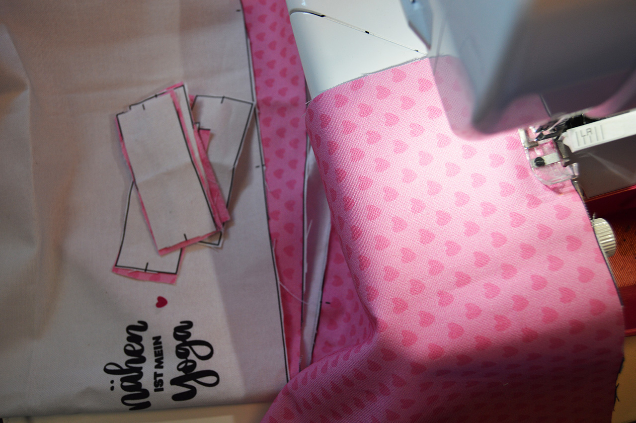 Um Eurem Utensilo jetzt noch ein wenig mehr Halt zu geben und die Lagen miteinander zu verbinden, steppen wir uns jetzt noch Taschen im Vorderteil ab.