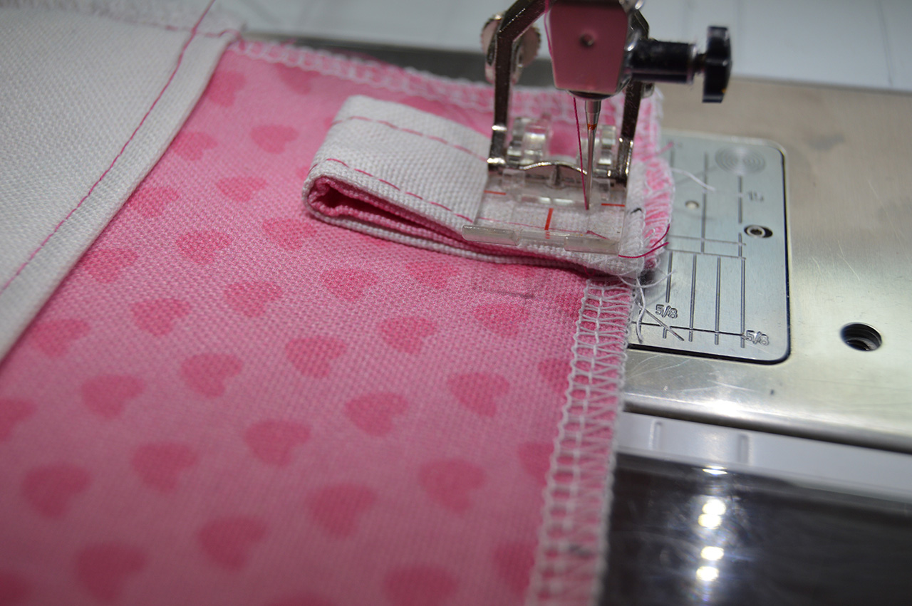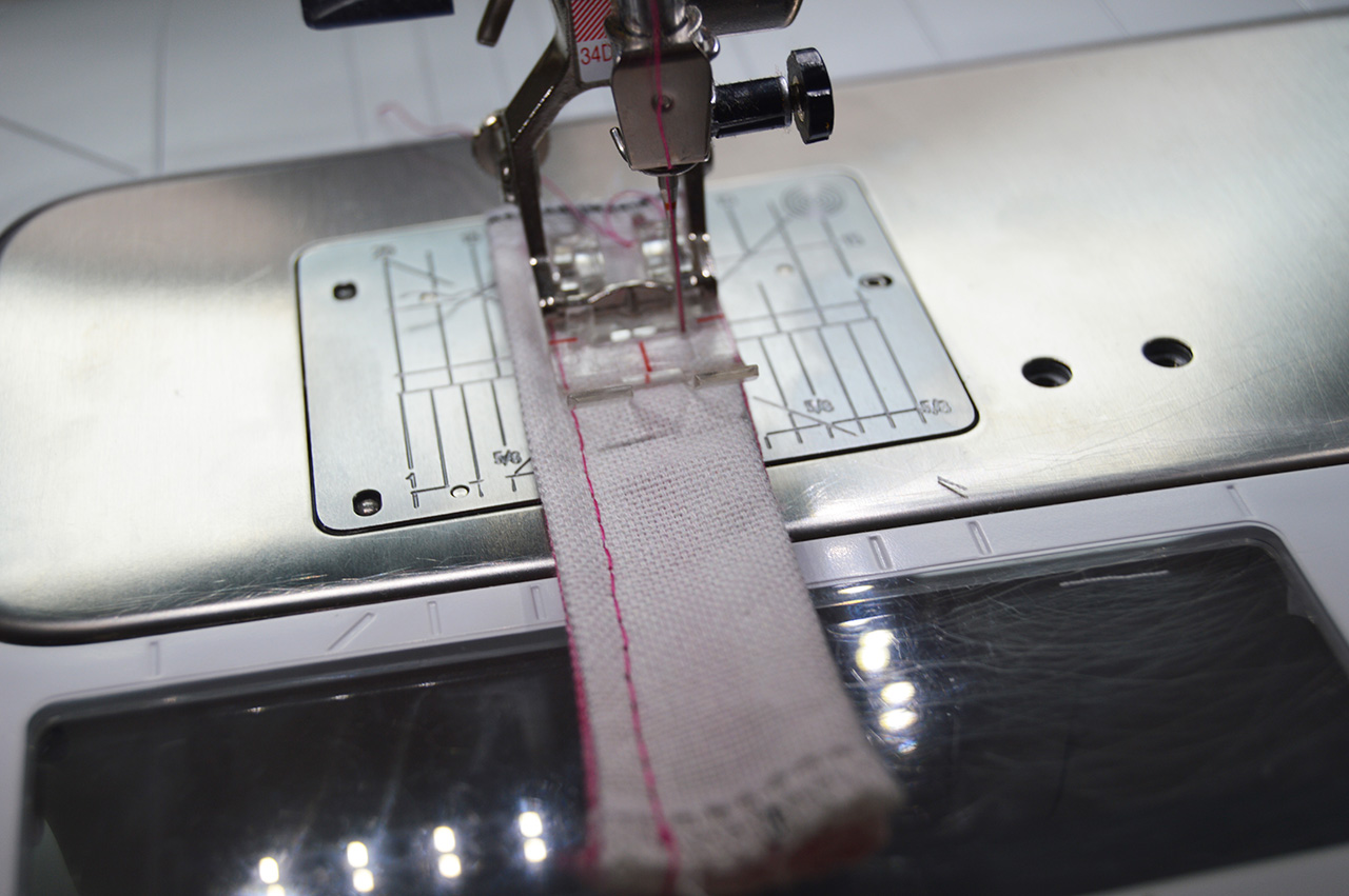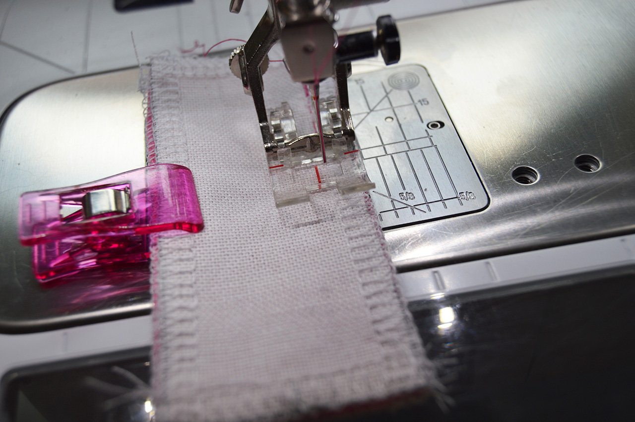 Anschließend werden jeweils die langen Seiten einmal abgesteppt. Verlängert hierzu Eure Stichlänge etwas. Habt Ihr dies erledigt, legt die Aufhängungen erst einmal zur Seite.
