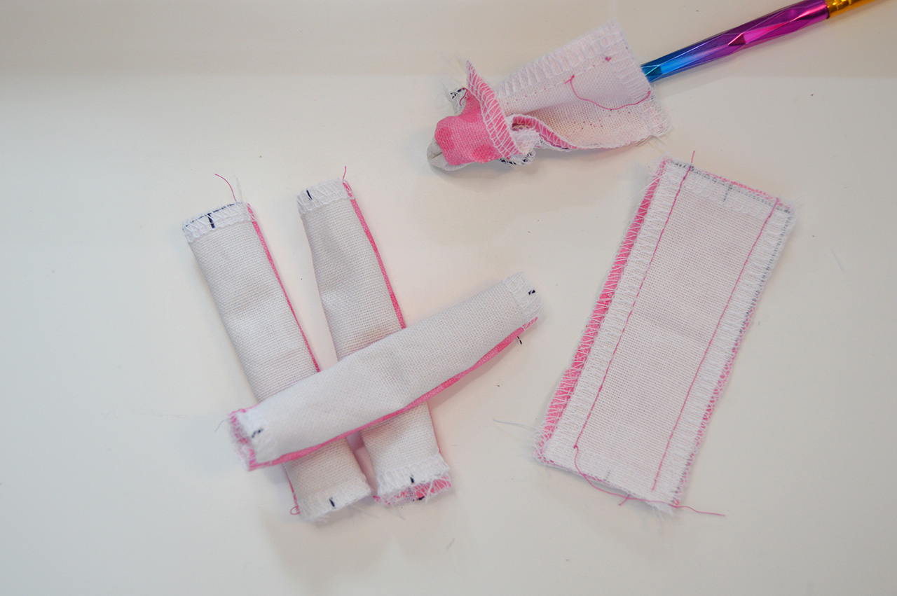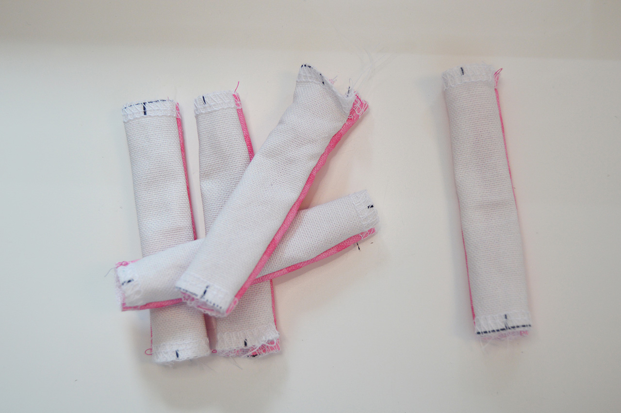 Habt Ihr dies erledigt, wendet Ihr Eure Teile. Am besten geht dies mit Hilfe eines Stabes. Bügelt alle fünf Aufhänger schön aus.