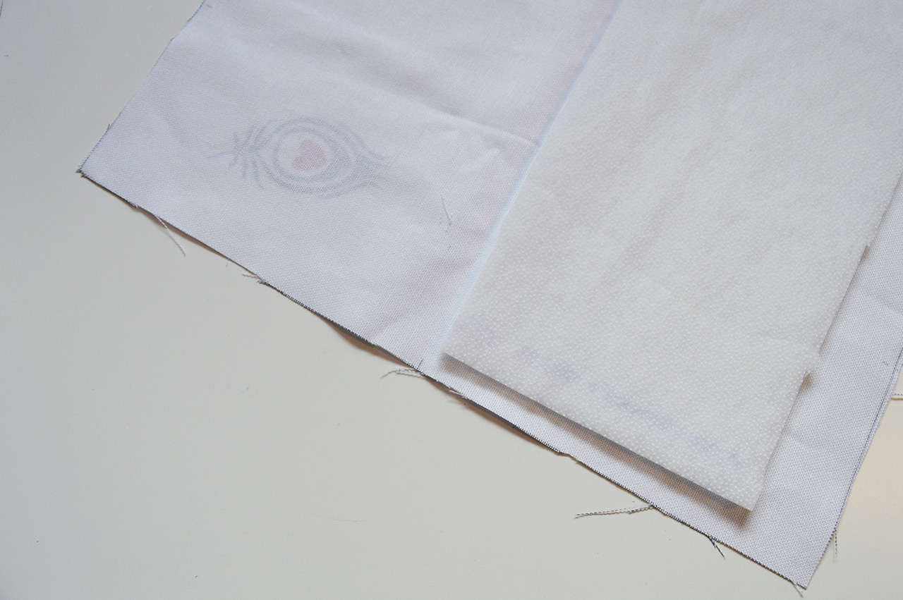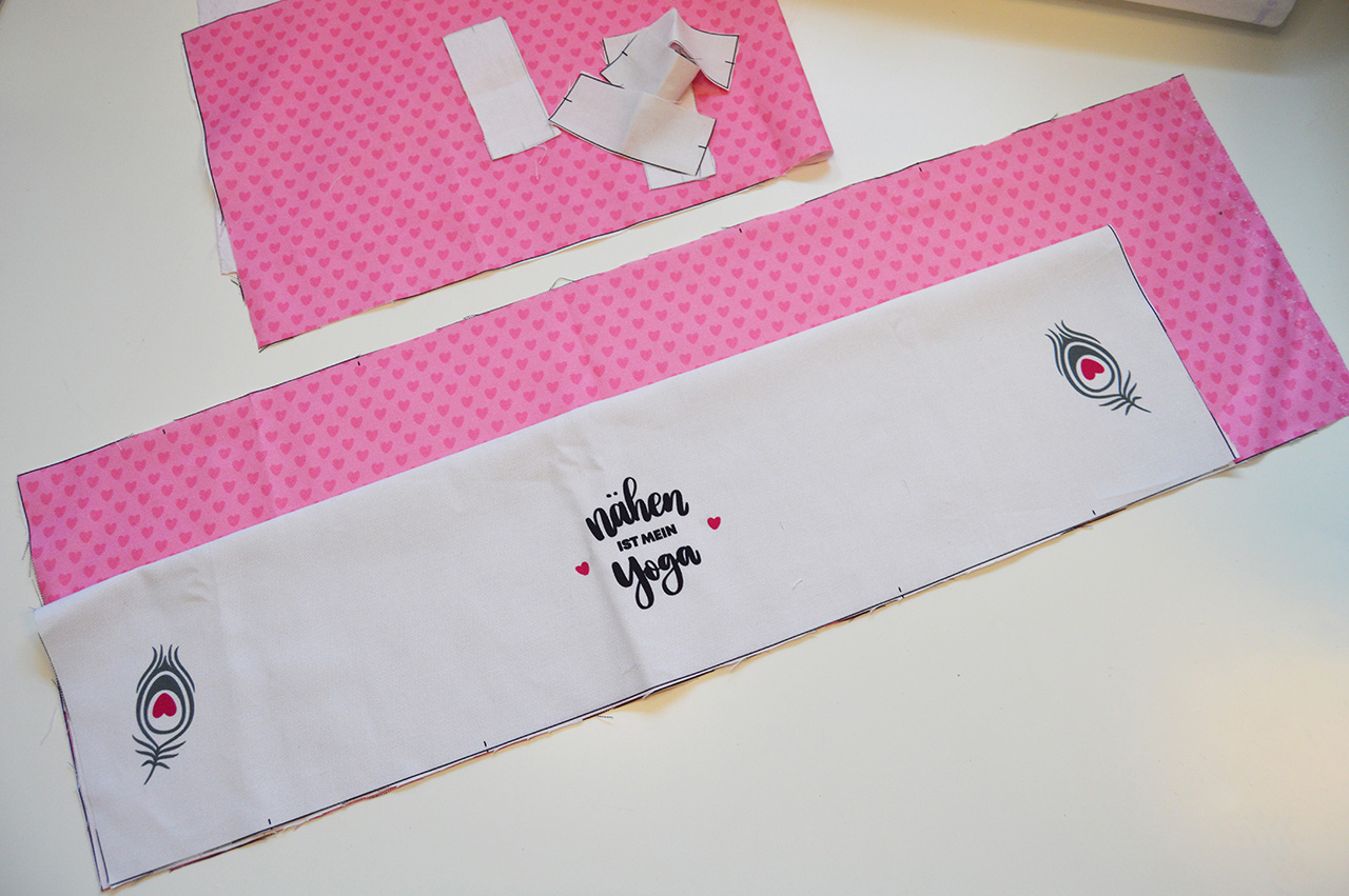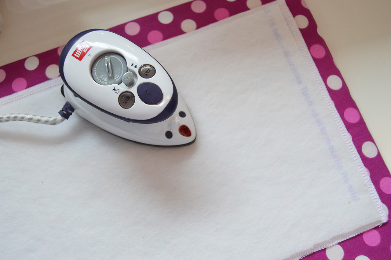 Bügelt zuerst die Verstärkung auf die Rückseite des Hauptteils auf. Achtet darauf, dass Ihr es so positioniert, dass Ihr überall den gleichen Überstand habt. Danach bügelt Ihr die Verstärkung auf die Rückseite des Taschenvorderteils. Klappt es auf und positioniert es am besten auf der unteren Hälfte. Denkt daran, dass dieses Teil nachher gefaltet wird und eine Verstärkung des ganzen Teils nicht notwendig ist. Deshalb wird die Verstärkung nur auf einer Seite aufgebügelt.