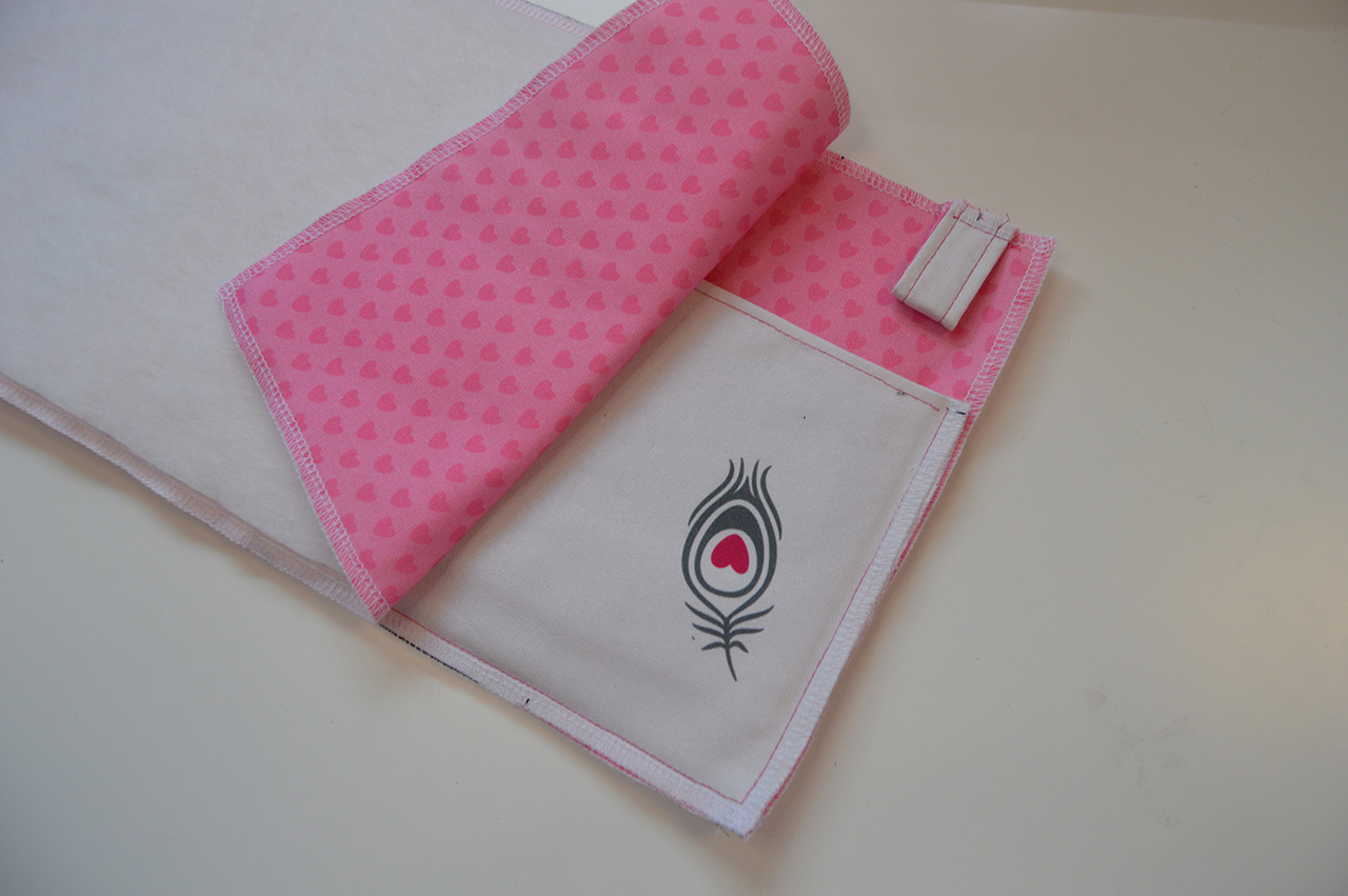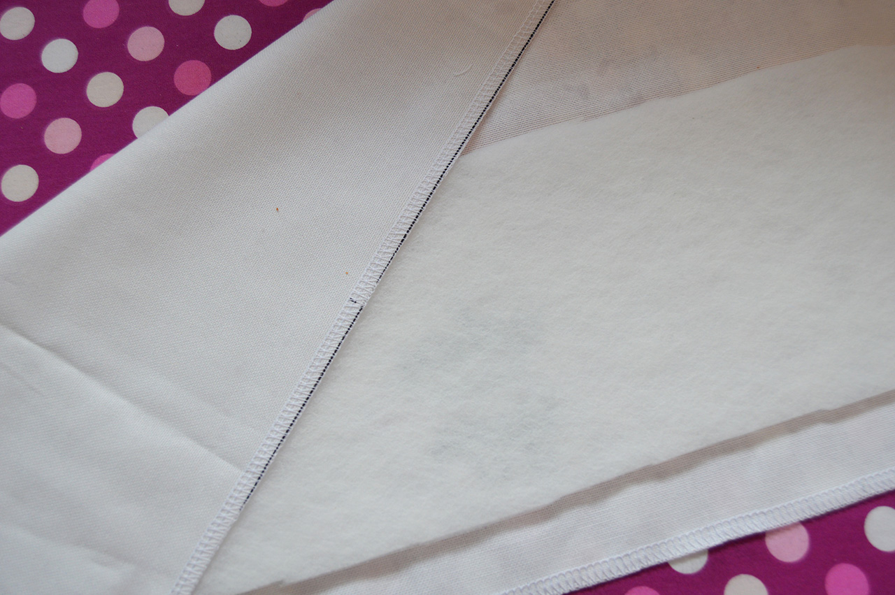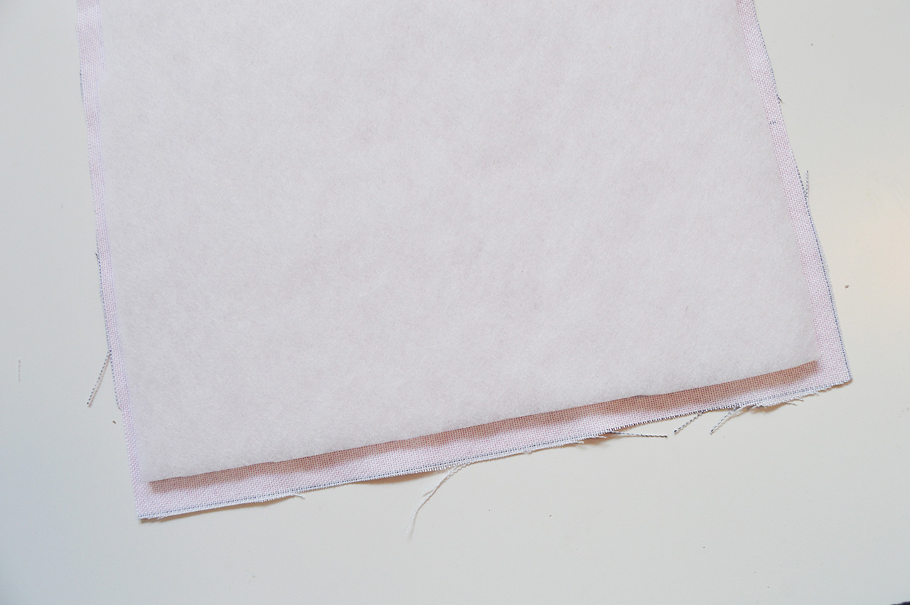 Bügelt zuerst die Verstärkung auf die Rückseite des Hauptteils auf. Achtet darauf, dass Ihr es so positioniert, dass Ihr überall den gleichen Überstand habt. Danach bügelt Ihr die Verstärkung auf die Rückseite des Taschenvorderteils. Klappt es auf und positioniert es am besten auf der unteren Hälfte. Denkt daran, dass dieses Teil nachher gefaltet wird und eine Verstärkung des ganzen Teils nicht notwendig ist. Deshalb wird die Verstärkung nur auf einer Seite aufgebügelt.