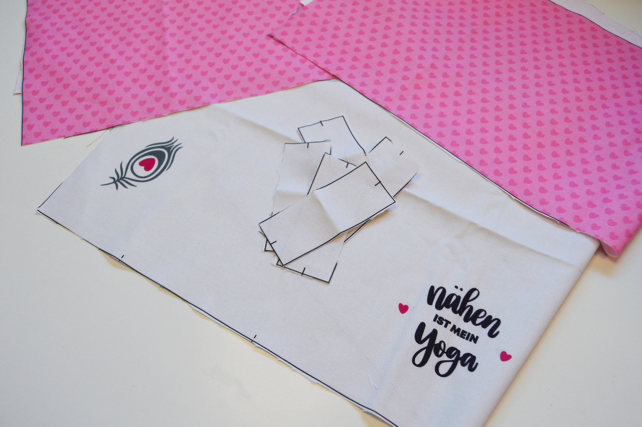 Als erstes nehmt Ihr Euch das Taschenvorderteil und eins der Hauptteile. Faltet das Vorderteil einmal in der Mitte und legt es auf das Hauptteil. Nun könnt Ihr das überstehende Stück einkürzen. Das zweite Hauptteil kürzt Ihr auf die gleiche Weise ein. Legt Euch die abgeschnitten Streifen nicht zu weit weg, denn diese verarbeiten wir jetzt gleich weiter.