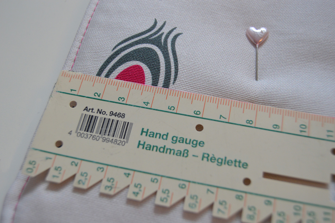 Ihr könnt Eure Taschen frei einteilen, ganz nach Eurem Geschmack und auch abhängig davon, was Ihr in Eurem Nähutensilo aufbewahren möchtet. Markiert Euch mit einer Nadel, wo Eure Taschennähte verlaufen sollen. Wir haben uns für vier kleine und ein großes Fach entschieden. Die linkte und rechte Tasche haben wir jeweils 8 cm vom Rand gesetzt, die darauf folgenden Taschen haben wir mit einer länge von 10 cm abgenäht. Das ergibt in der Mitte eine Tasche mit einer Größe von 23 cm.
