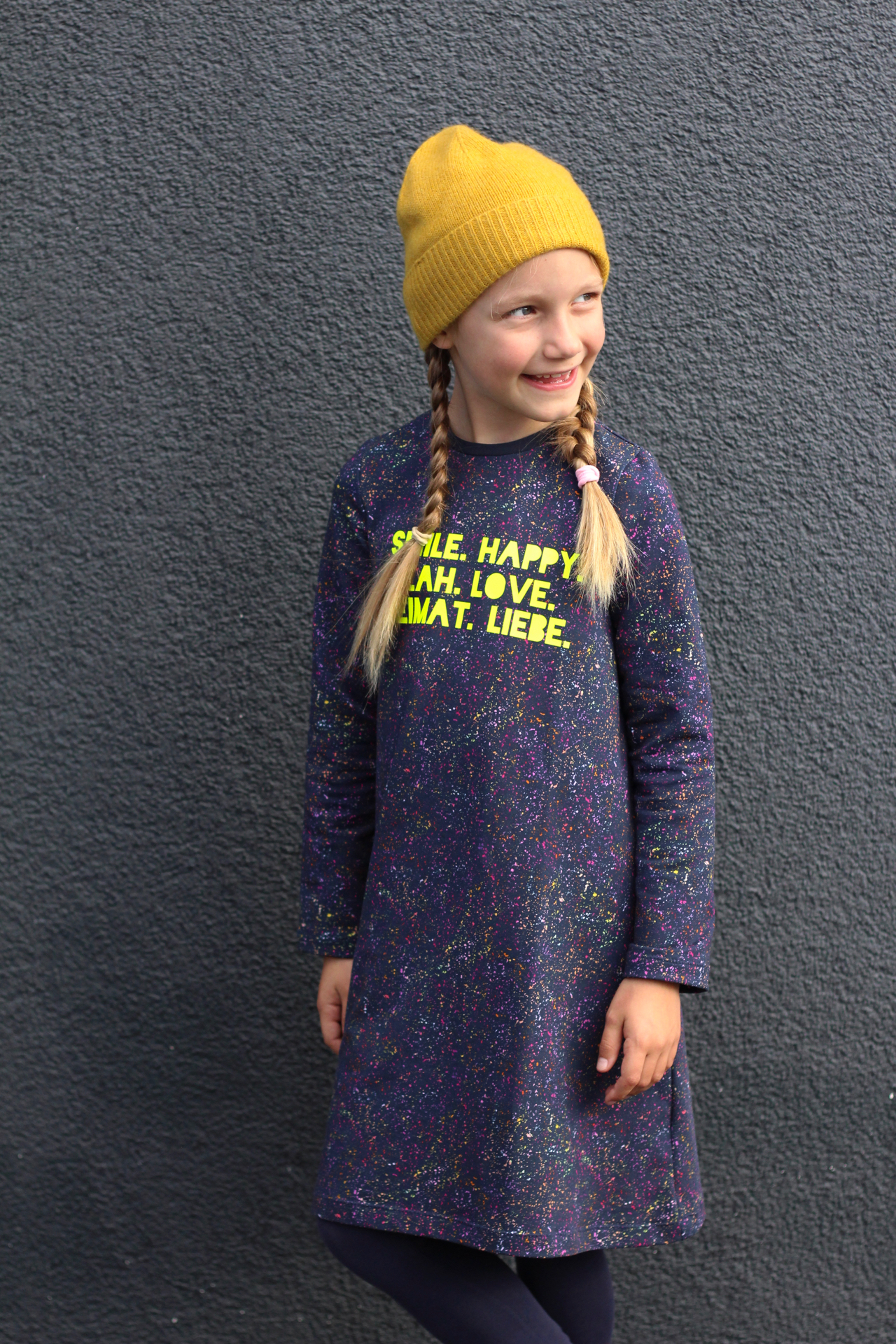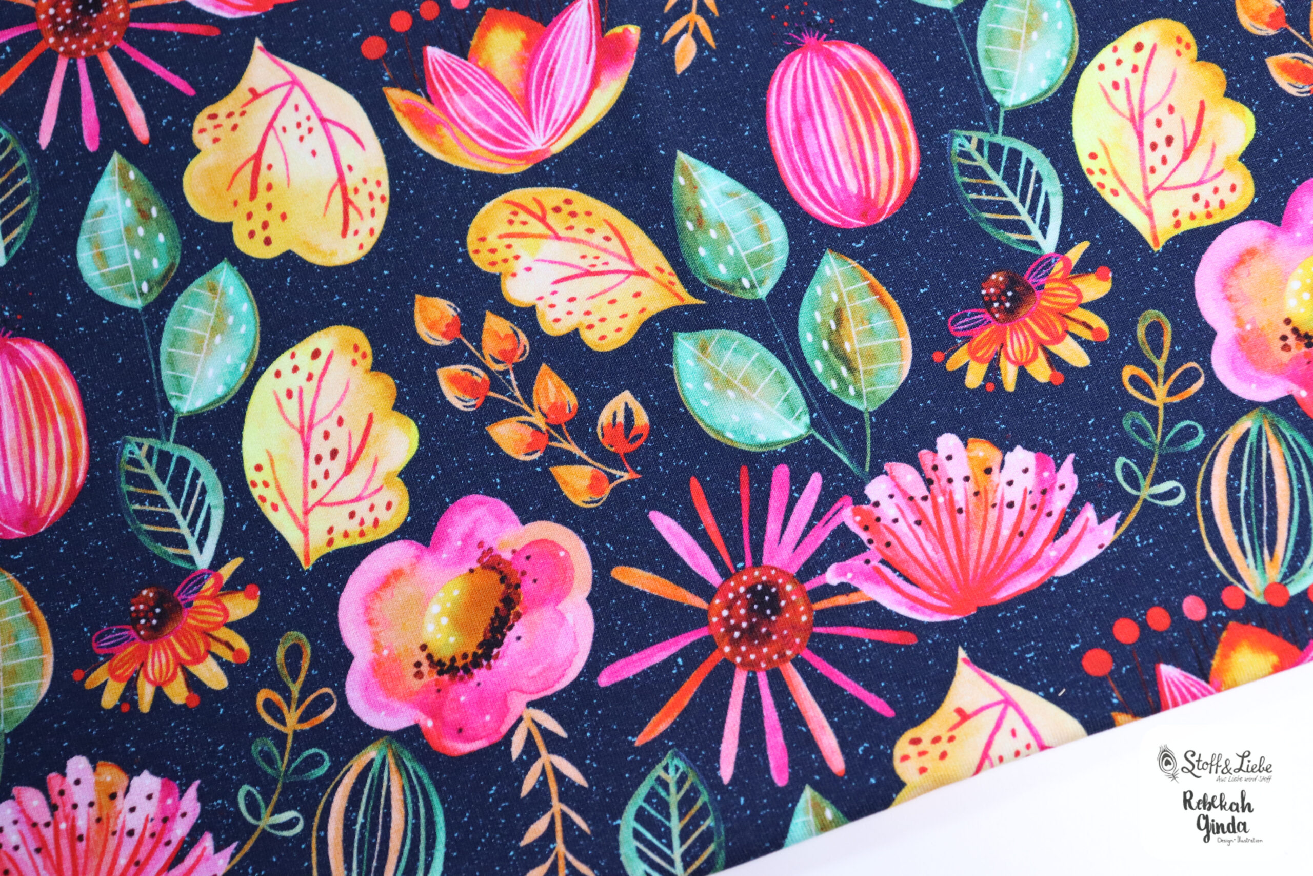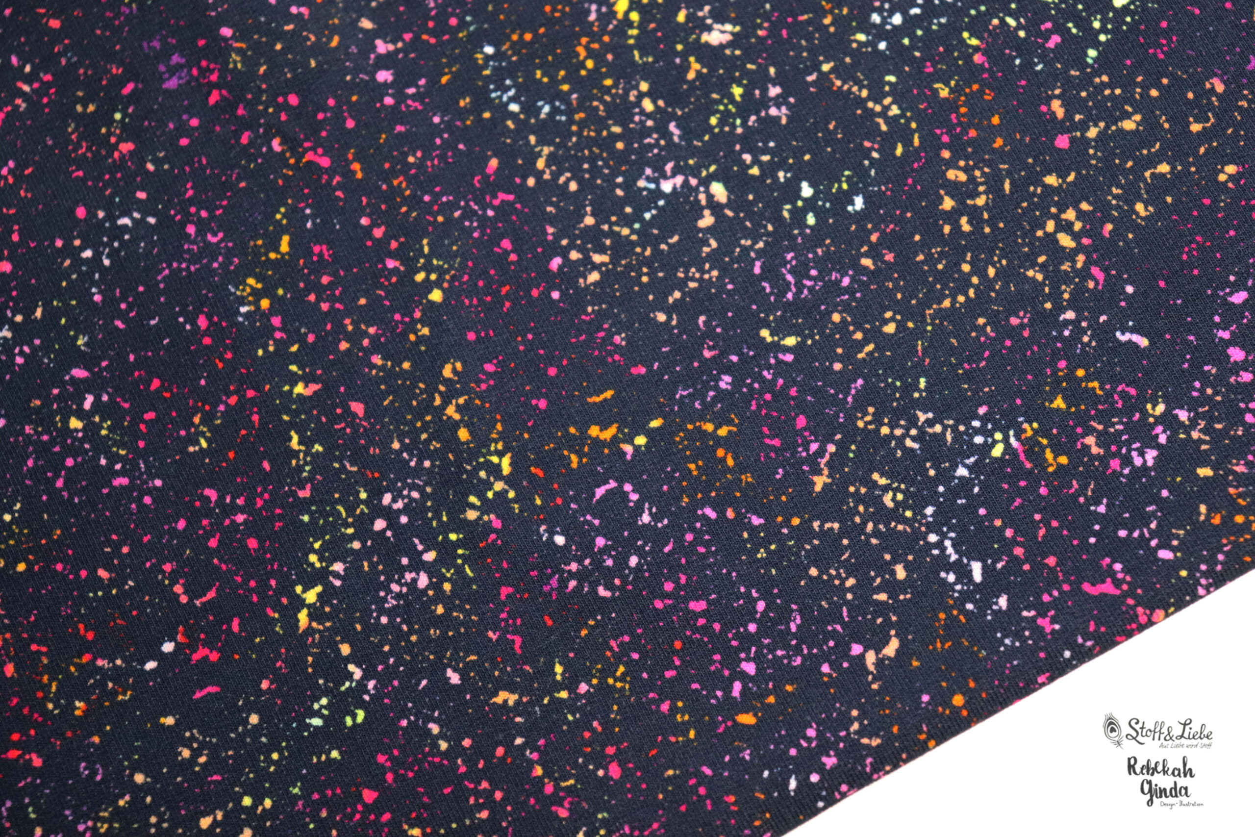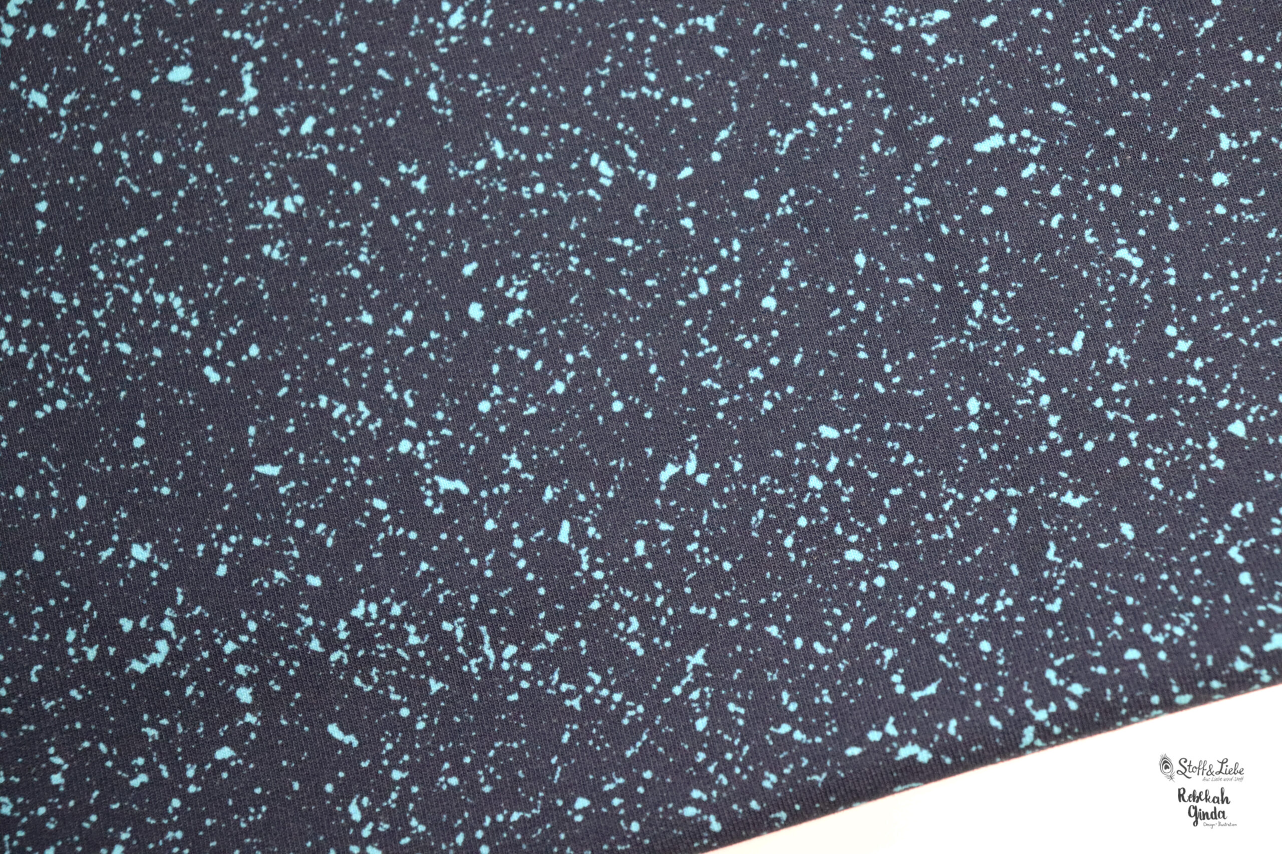 Das Design wurde leicht modifiziert. Der Hintergrund wurde dunkler angelegt und eine weitere Farbe des bekannten Kombistoffes  „Sprenkel“ wurden kreiert und hat direkt einen neuen Namen bekommen: „Spritzer“. Die Stoffe dieser wunderschönen Kollektion erscheinen auf wunderbar weichem French Terry und haben eine Materialzusammensetzung von 95 % Baumwolle und 5 % Elasthan. Ein Design von Rebekah Ginda Design. Unverkennbar, oder?