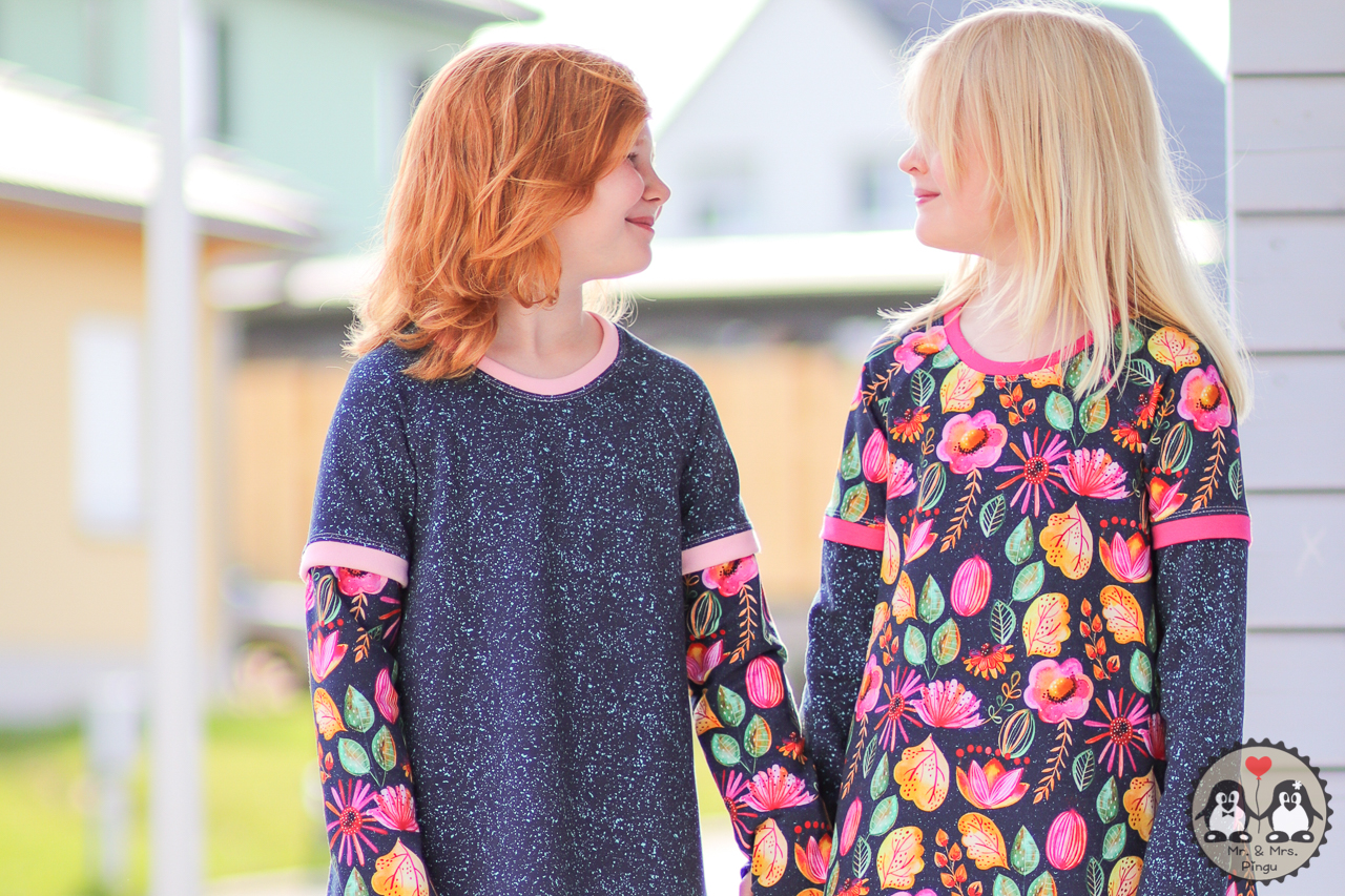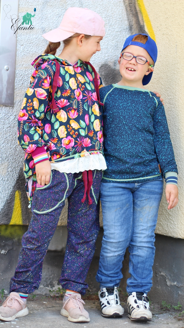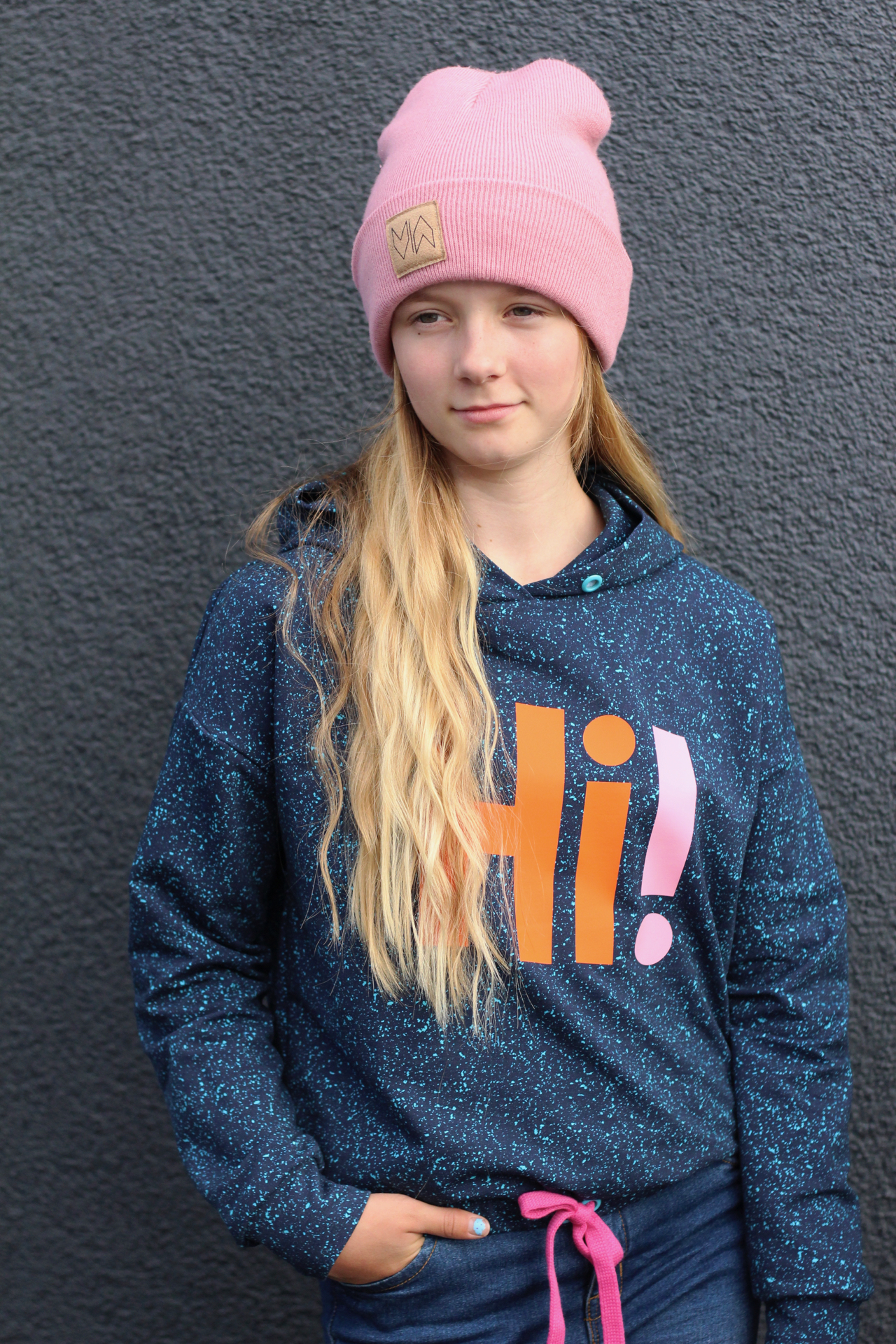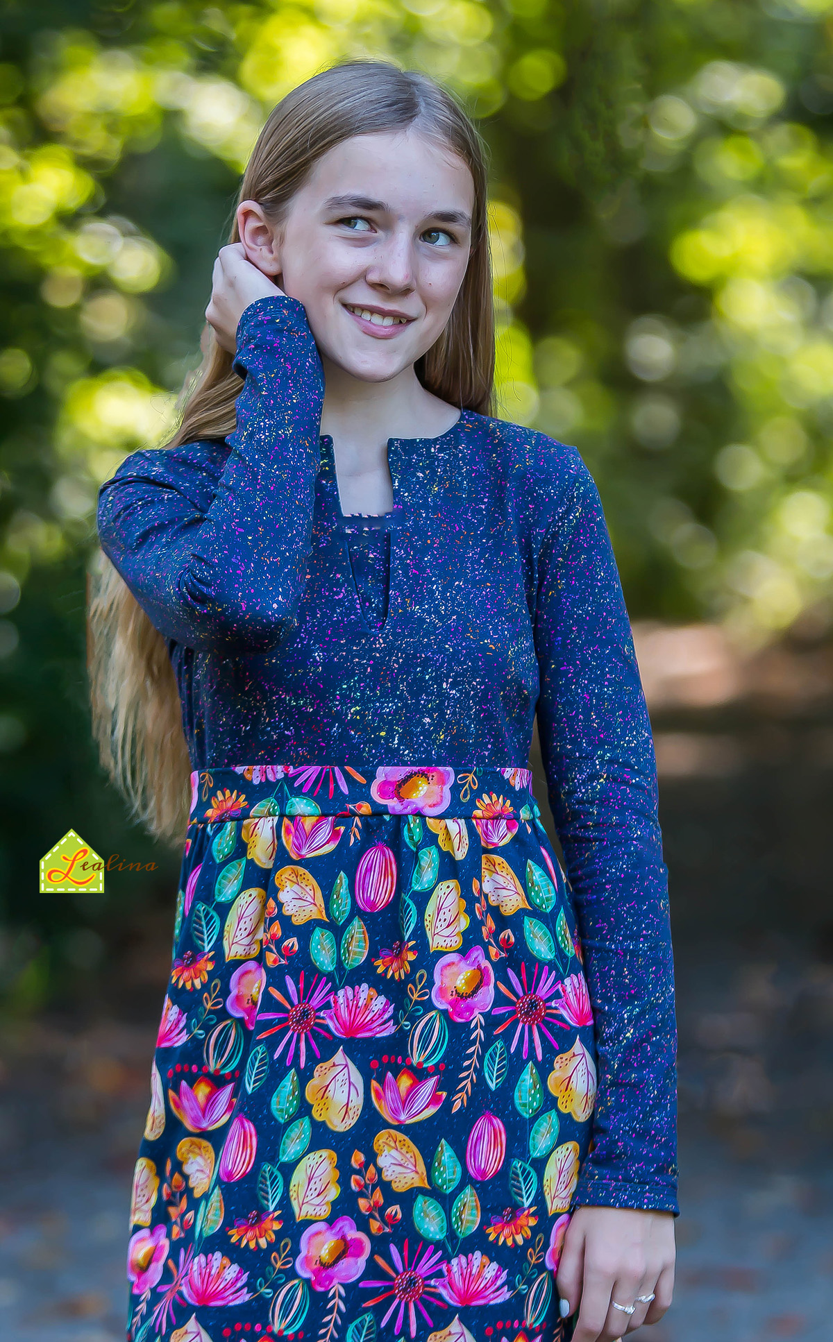 Das Design wurde leicht modifiziert. Der Hintergrund wurde dunkler angelegt und eine weitere Farbe des bekannten Kombistoffes  „Sprenkel“ wurden kreiert und hat direkt einen neuen Namen bekommen: „Spritzer“. Die Stoffe dieser wunderschönen Kollektion erscheinen auf wunderbar weichem French Terry und haben eine Materialzusammensetzung von 95 % Baumwolle und 5 % Elasthan. Ein Design von Rebekah Ginda Design. Unverkennbar, oder?