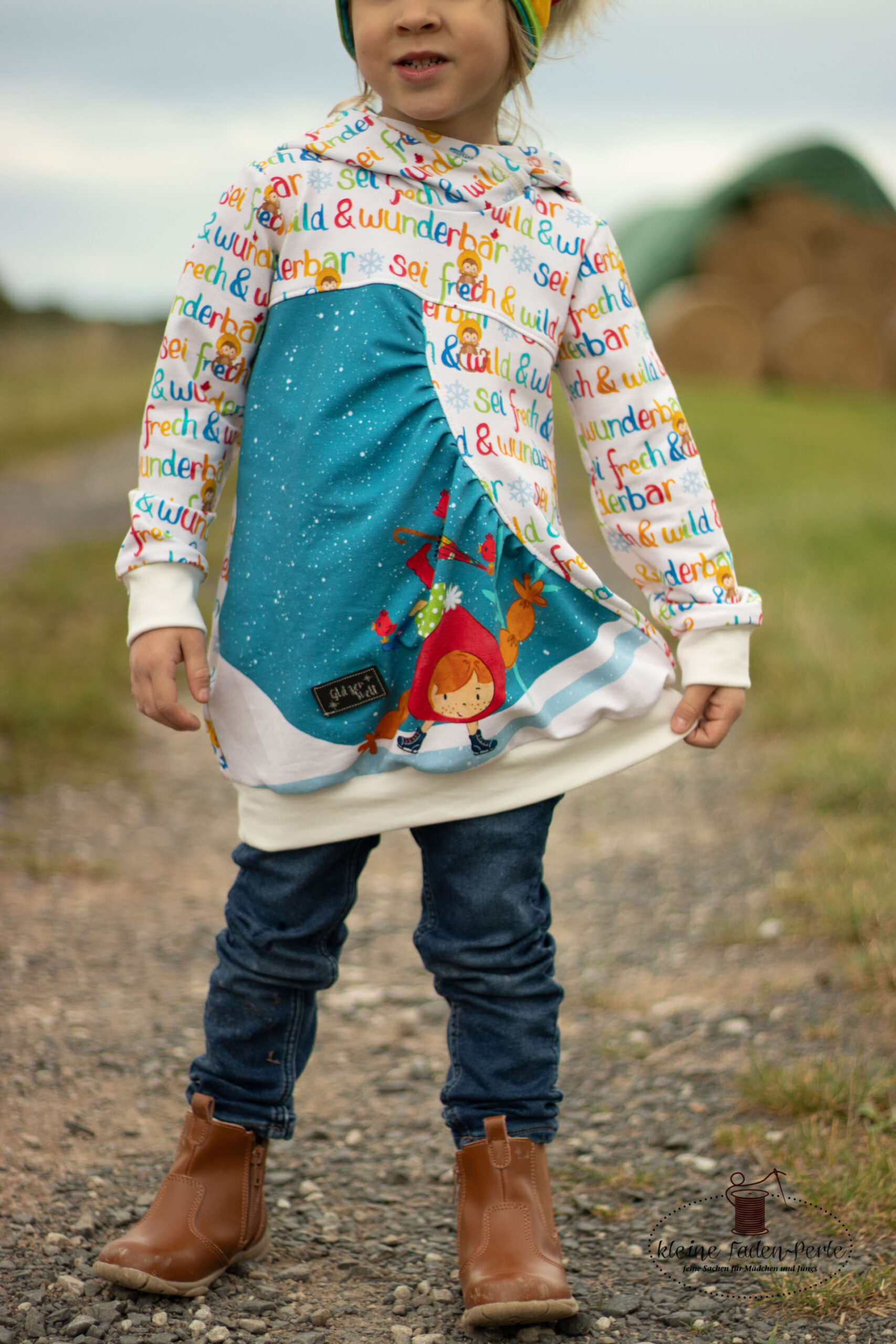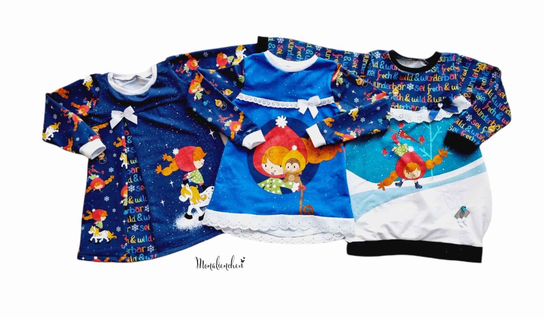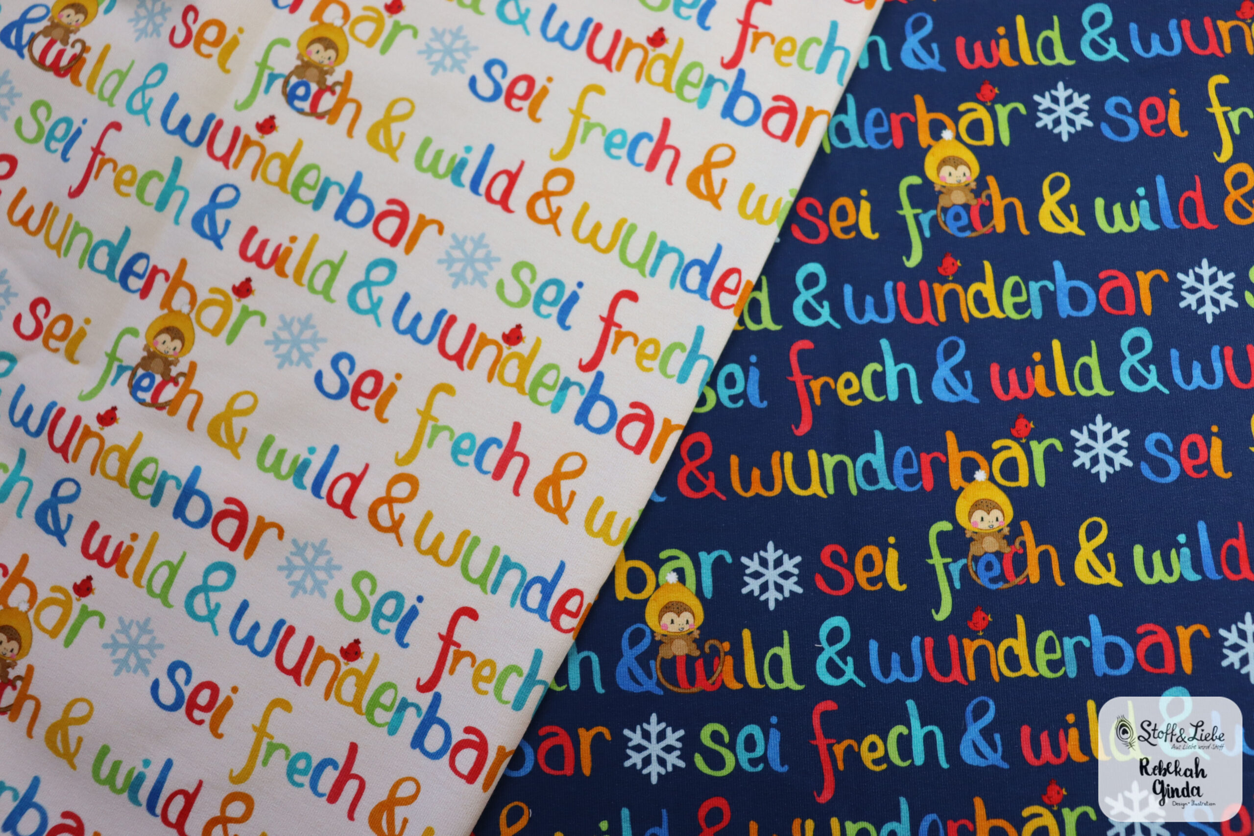 Was darf bei Lotta auf keinen Fall fehlen? Richtig, die Frech & Wild Schrift. Auch diese haben wir für Euch passend zu den anderen Stoffen der Kollektion in Blau und Creme. Natürlich hat sich die Frech & Wild Schrift auch in ein winterliches Design gehüllt. Die Sterne und Herzen, die Ihr sonst auf dem Stoff findet, haben wir durch Schneeflocken ersetzt und das kleine Äffchen hat eine Mütze bekommen.