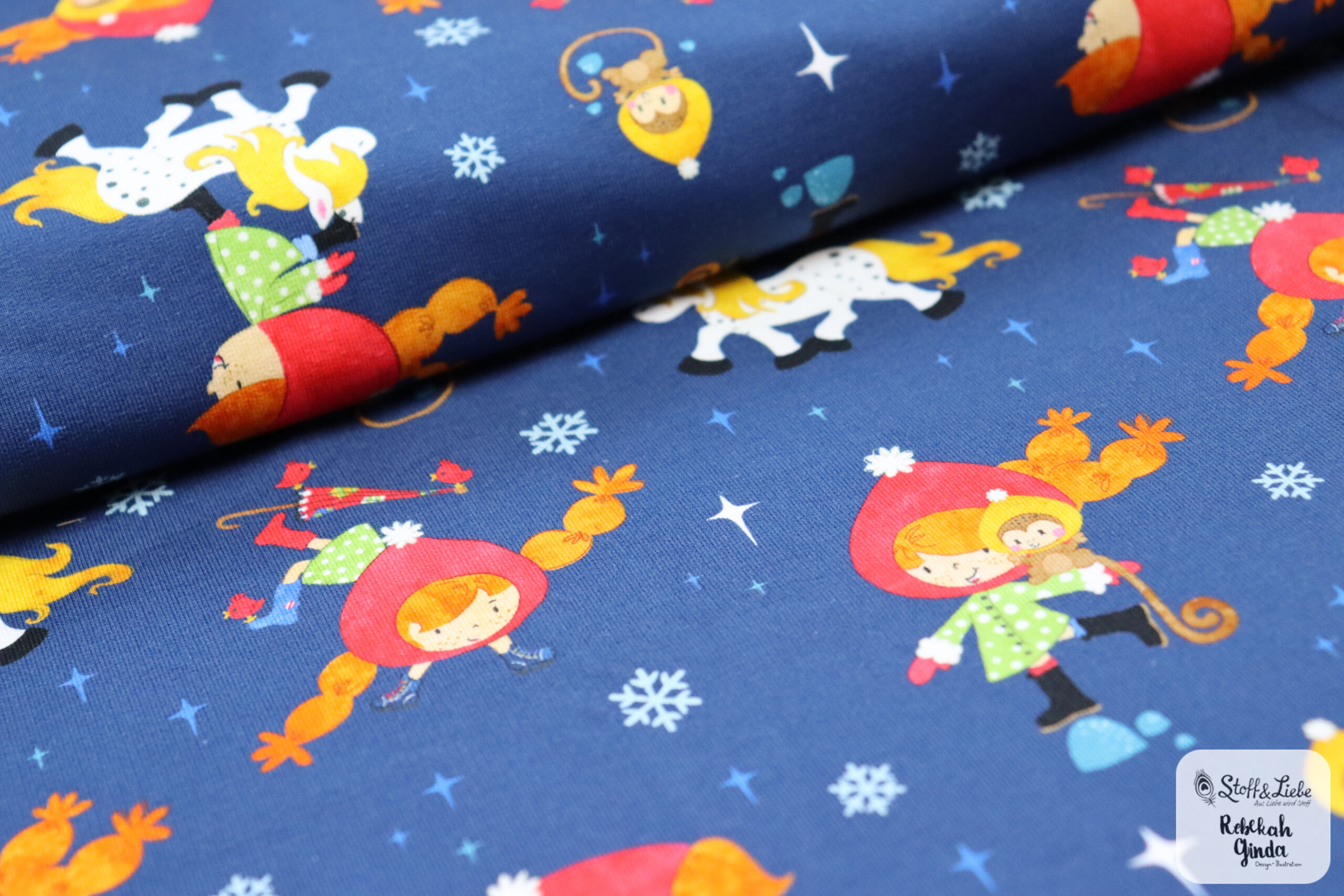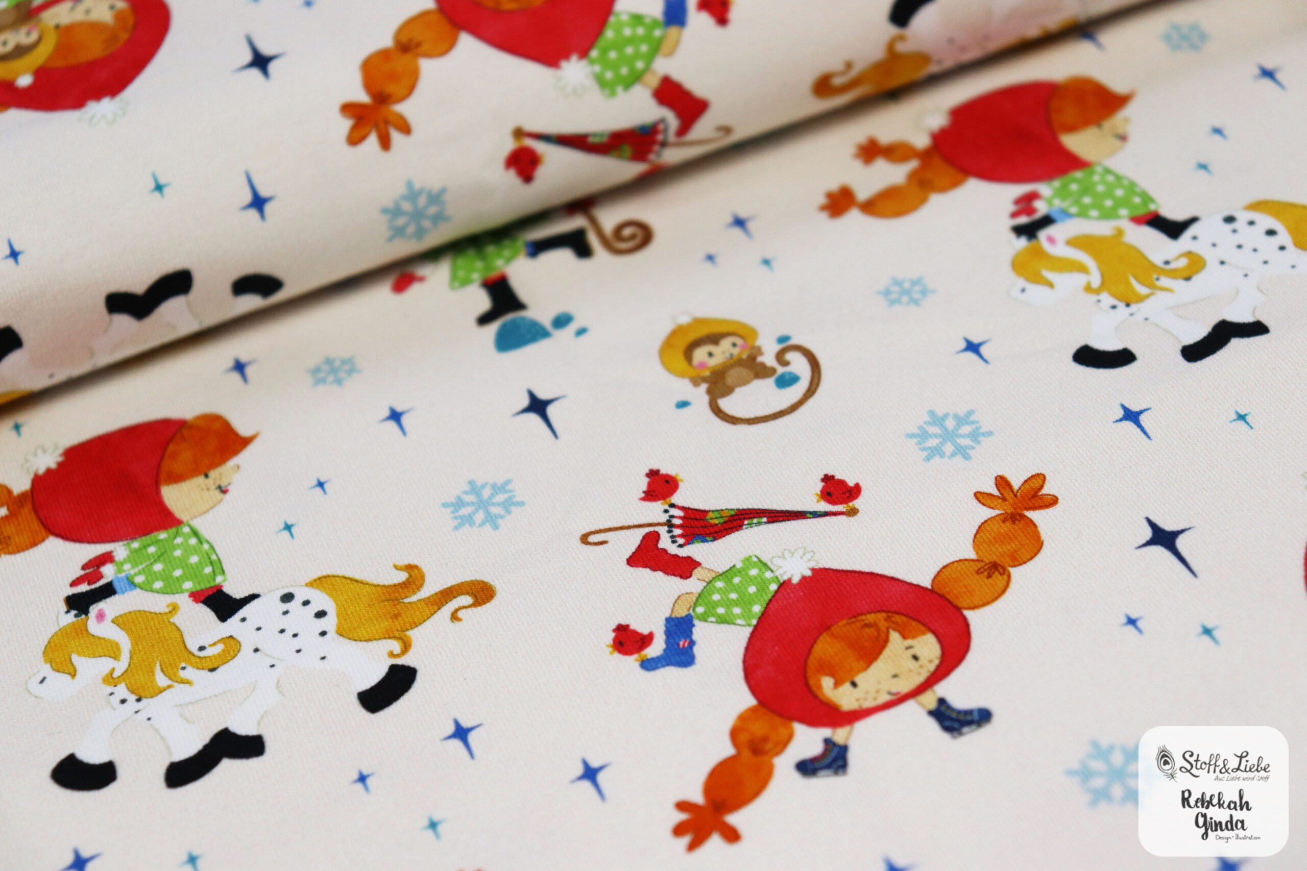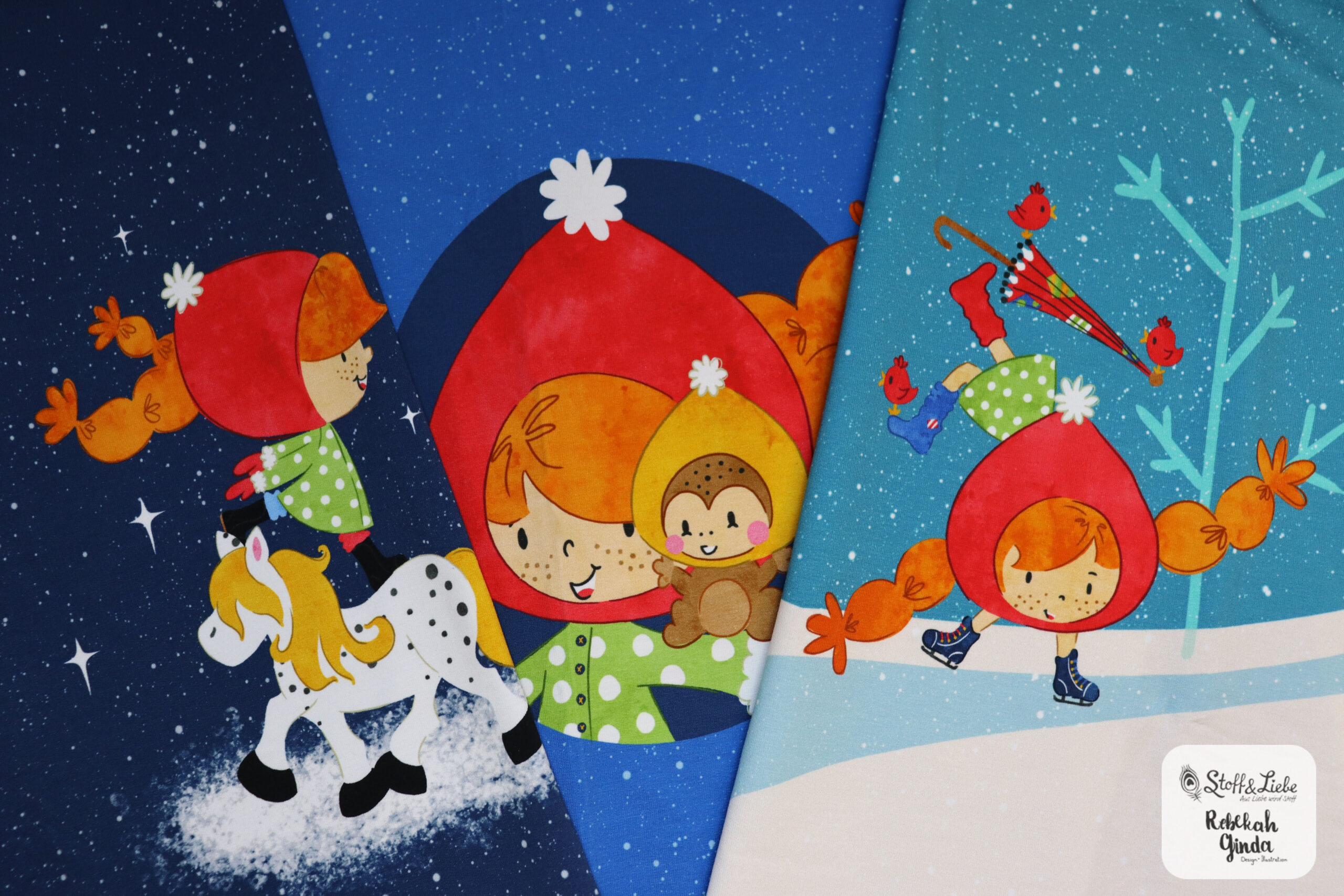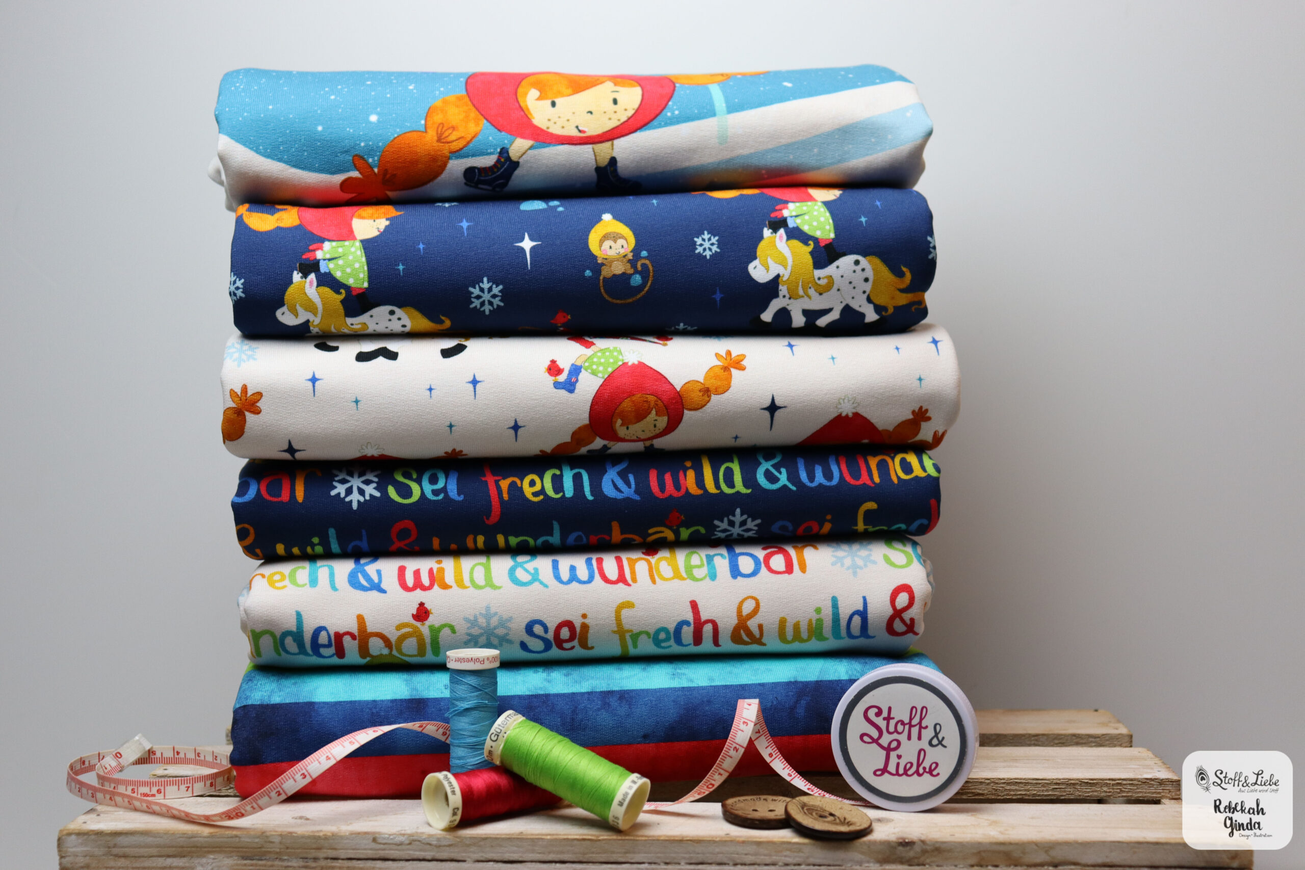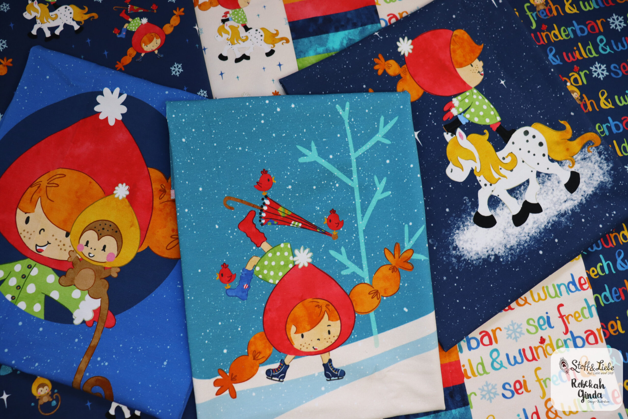 Unsere „Starke Lotta – Spaß im Schnee“ Kollektion wurde umgesetzt von Rebekah Ginda und macht so richtig Lust auf den Winter! Wir haben für Euch ein Panel, zwei Hauptstoffe und passend dazu drei Kombistoffe. Die Stoffe dieser Kollektionen erscheinen auf butterweichem French Terry und haben eine Materialzusammensetzung von 95 % Baumwolle und 5 % Elasthan.